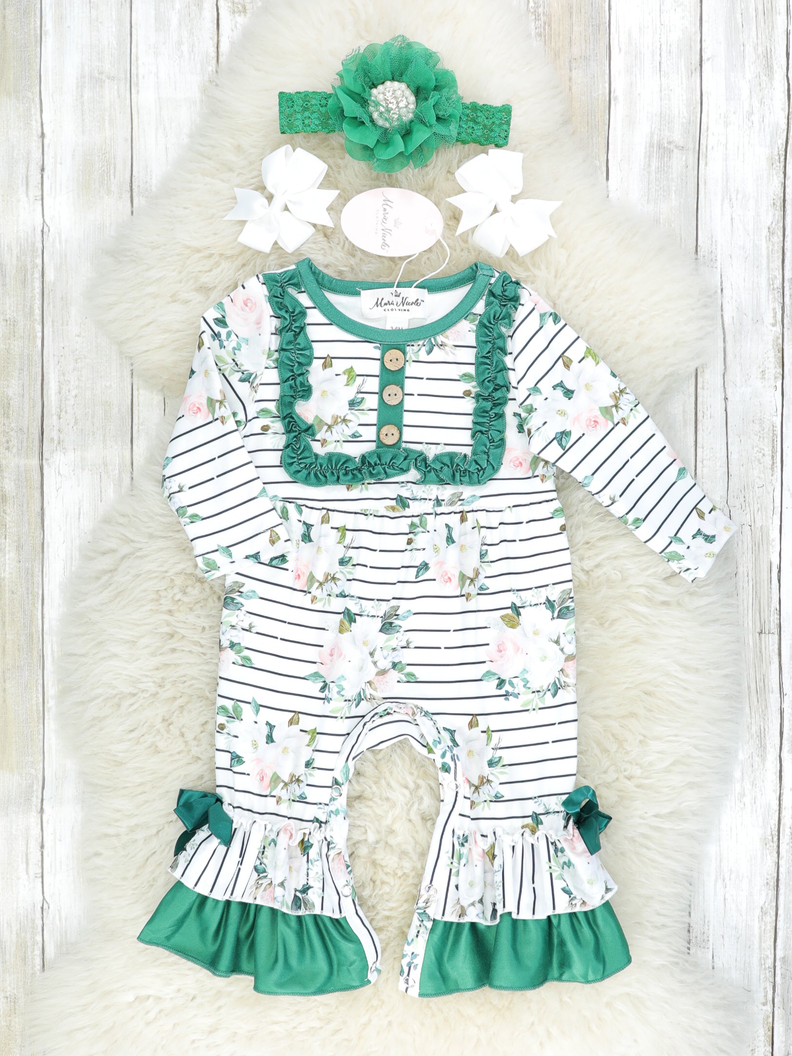 The most fabulous floral sets for your sweet hearts! This striped romper features gorgeous florals, decorative buttons, green ruffle details, & bow details at the ankles.