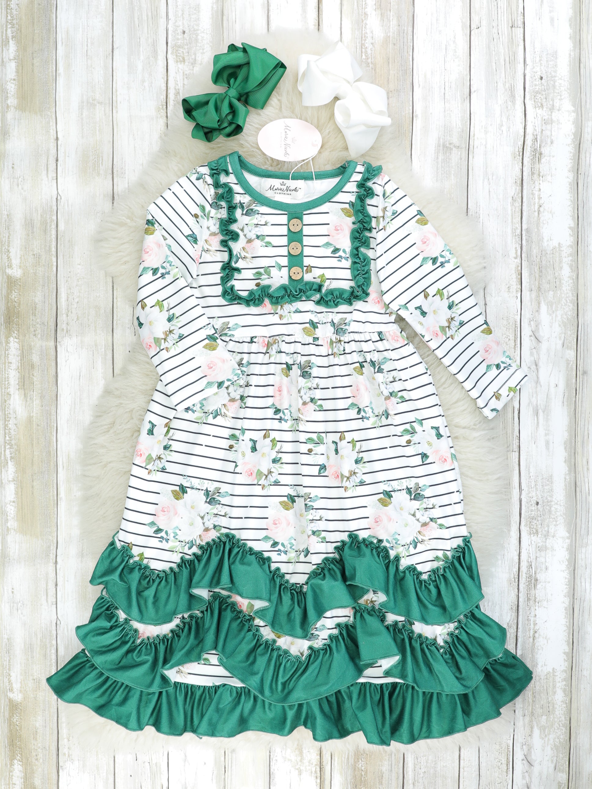 The most fabulous floral sets for your sweet hearts! This striped dress features gorgeous florals, decorative buttons, & green ruffle details.