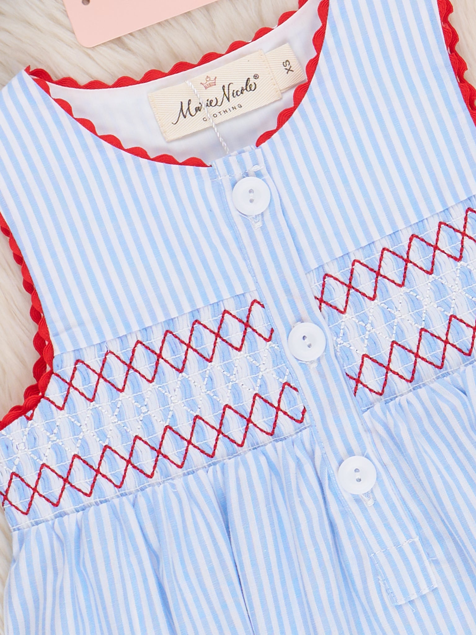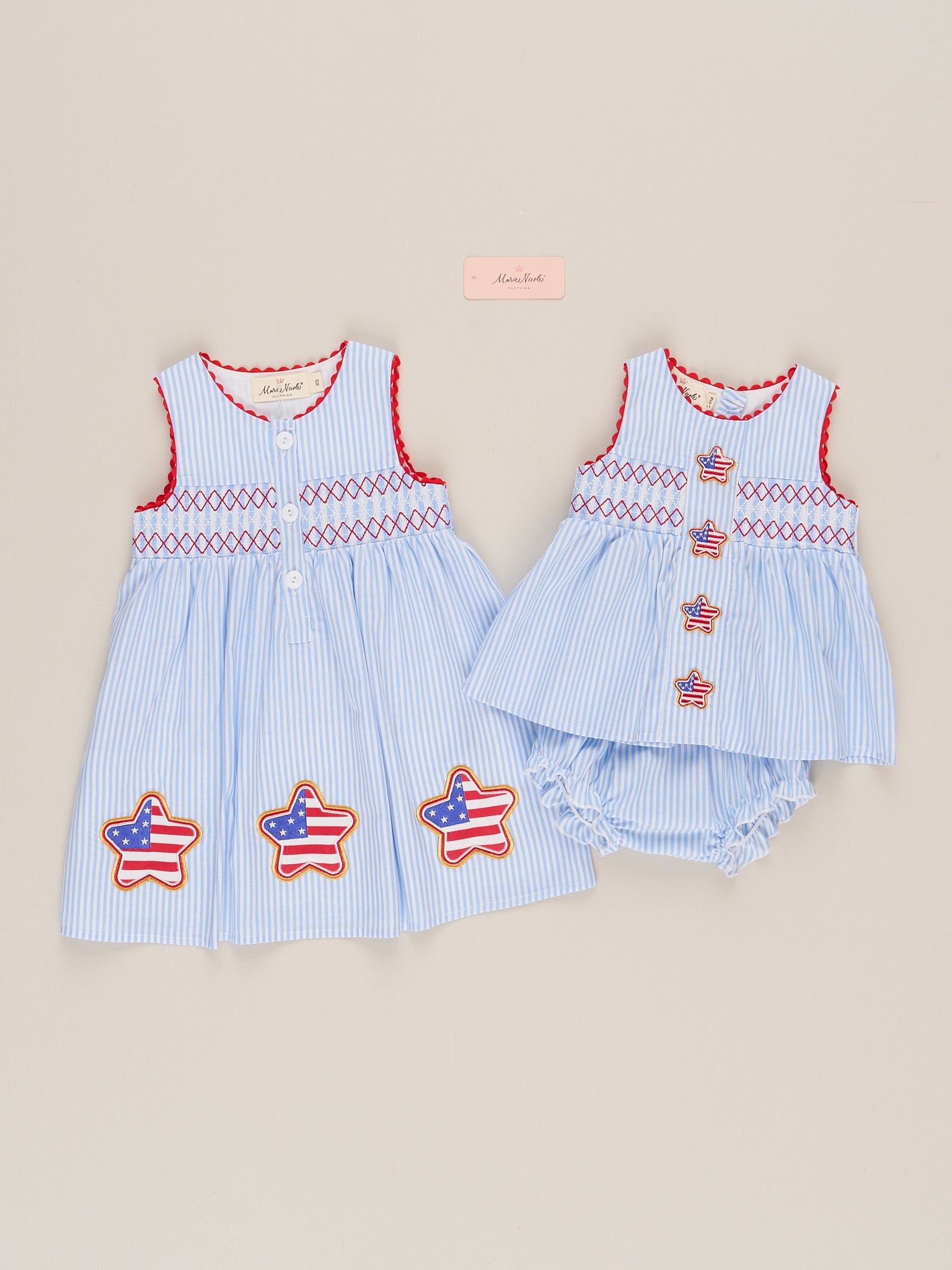 Show your patriotic spirit in the Freedom Stars Smocked Dress, featuring a comfy smocked bodice and star details. Perfect for summer celebrations, this dress from Marie Nicole Clothing combines effortless style with all-day comfort. Just add sandals and you're ready for fireworks, BBQs, and everything in between.