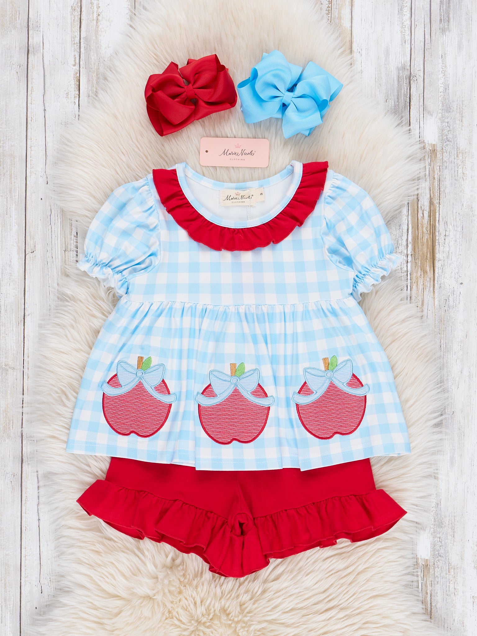 The Fresh Picked Apples Outfit is a classic and charming choice, perfect for school days, apple picking, and sweet fall moments. Featuring a delightful apple print and finished with soft ruffle accents, this outfit from Marie Nicole Clothing brings together timeless style and playful comfort. Lightweight and breathable, it’s made for twirls, smiles, and picture-perfect memories.
