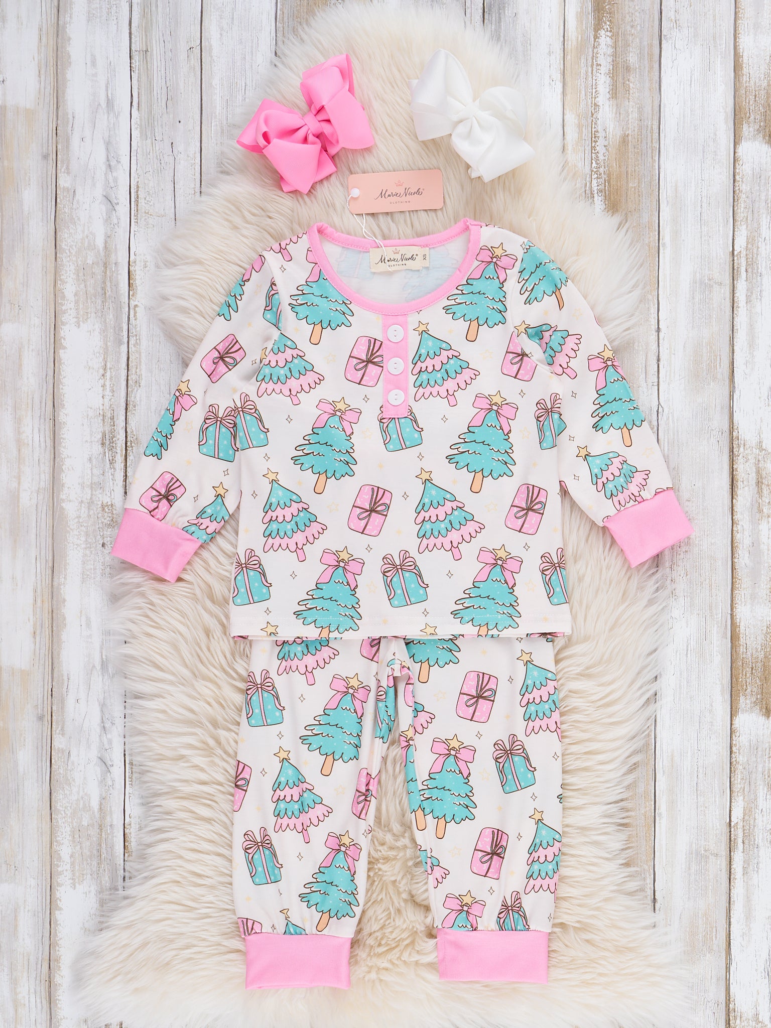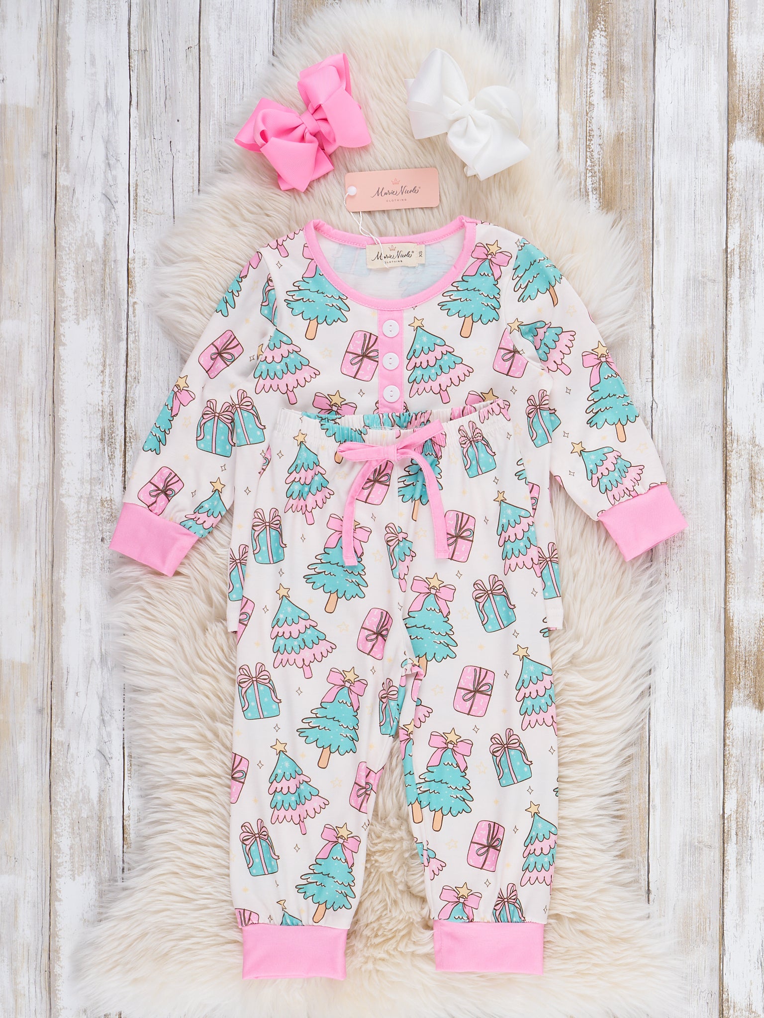 The "Frosty Tree Gift Pajamas" by Marie Nicole feature a cozy two-piece set with a playful frosty tree and gift print scattered across both the top and pants, creating a festive and cheerful look suitable for the holiday season. The pajama set is accented with contrasting trim on the cuffs and neckline for a pop of color, adding an extra touch of charm to the overall design. Soft, comfortable fabric makes these pajamas perfect for lounging, bedtime, or capturing holiday morning memories in style.