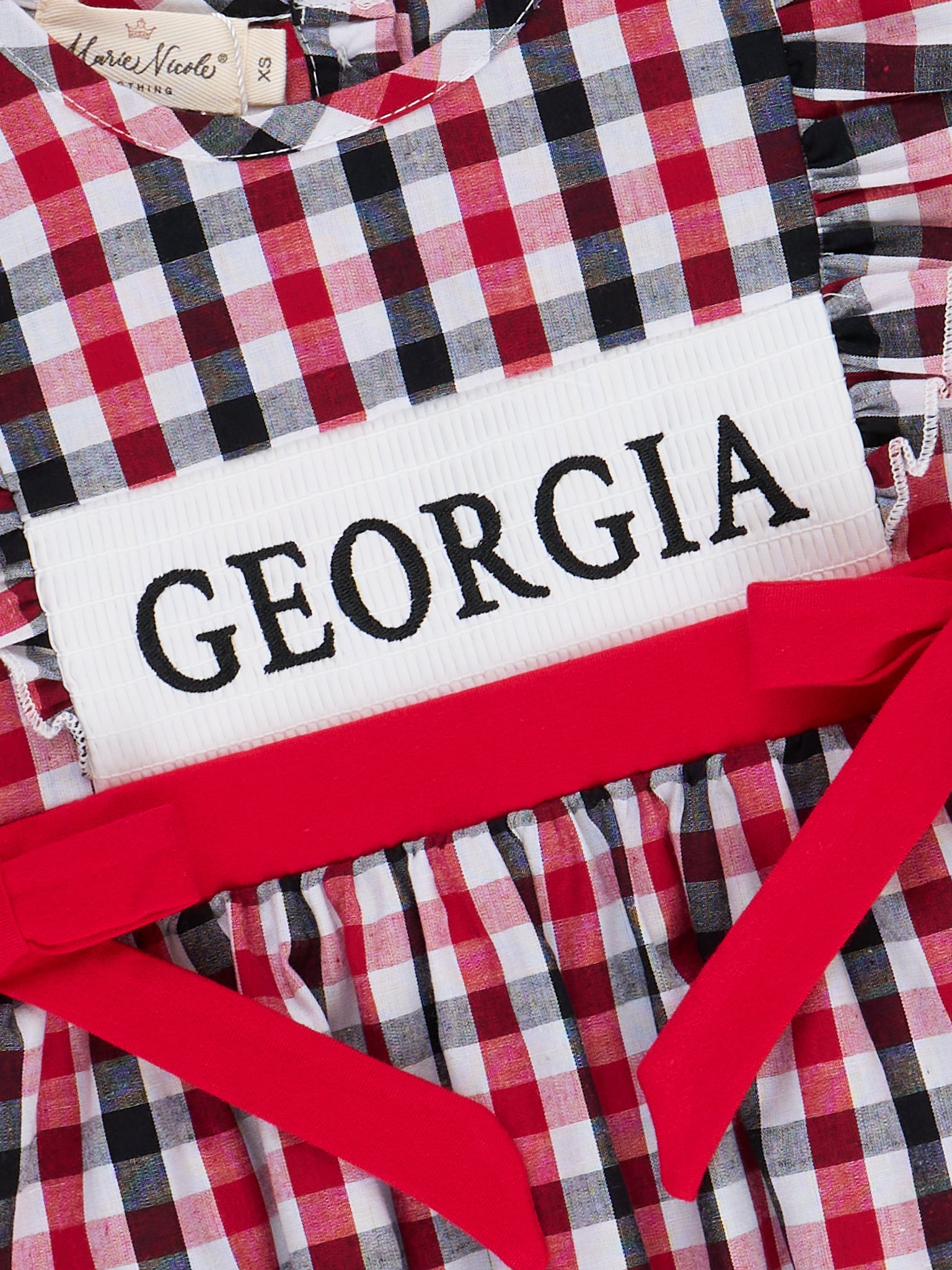 The Georgia Smocked Gingham Dress is a darling combination of Southern charm and team spirit. Featuring a classic black and red gingham pattern, sweet ruffle sleeves, and a smocked panel embroidered with “Georgia,” this dress from Marie Nicole Clothing is perfect for game days, family gatherings, or sunny day adventures. Finished with bold red waist ties for a polished look, it’s a spirited style your little fan will love to twirl in.