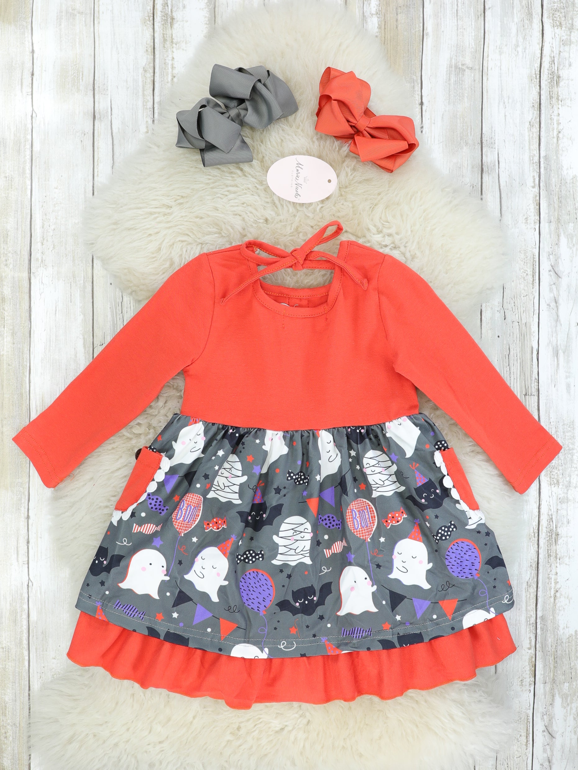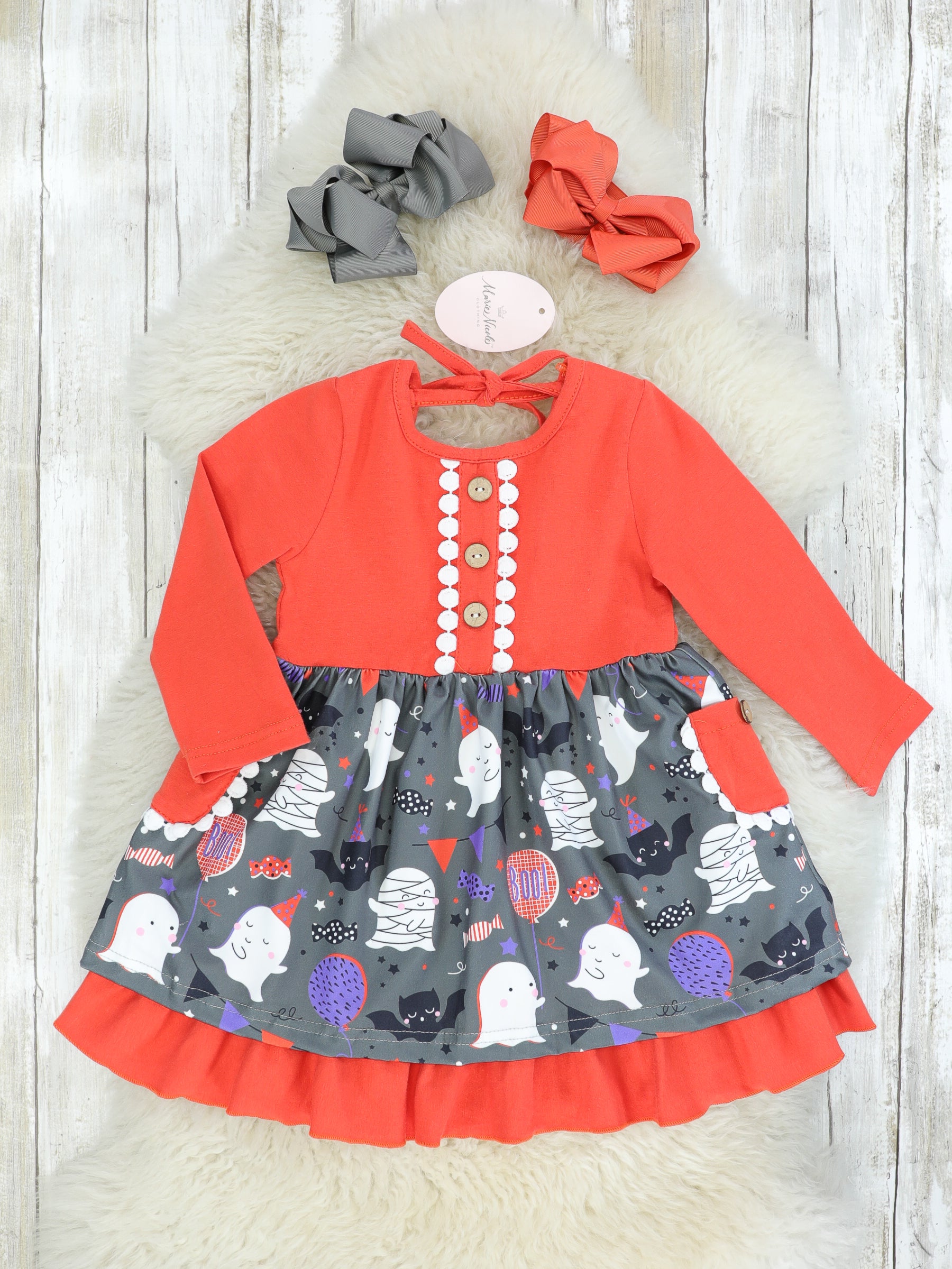 A spooktacular dress for the halloween season! This burnt orange dress features nonfunctional buttons, pockets, ruffles, a back tie behind the neck, & ghost with mummy details.