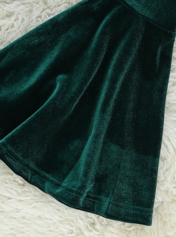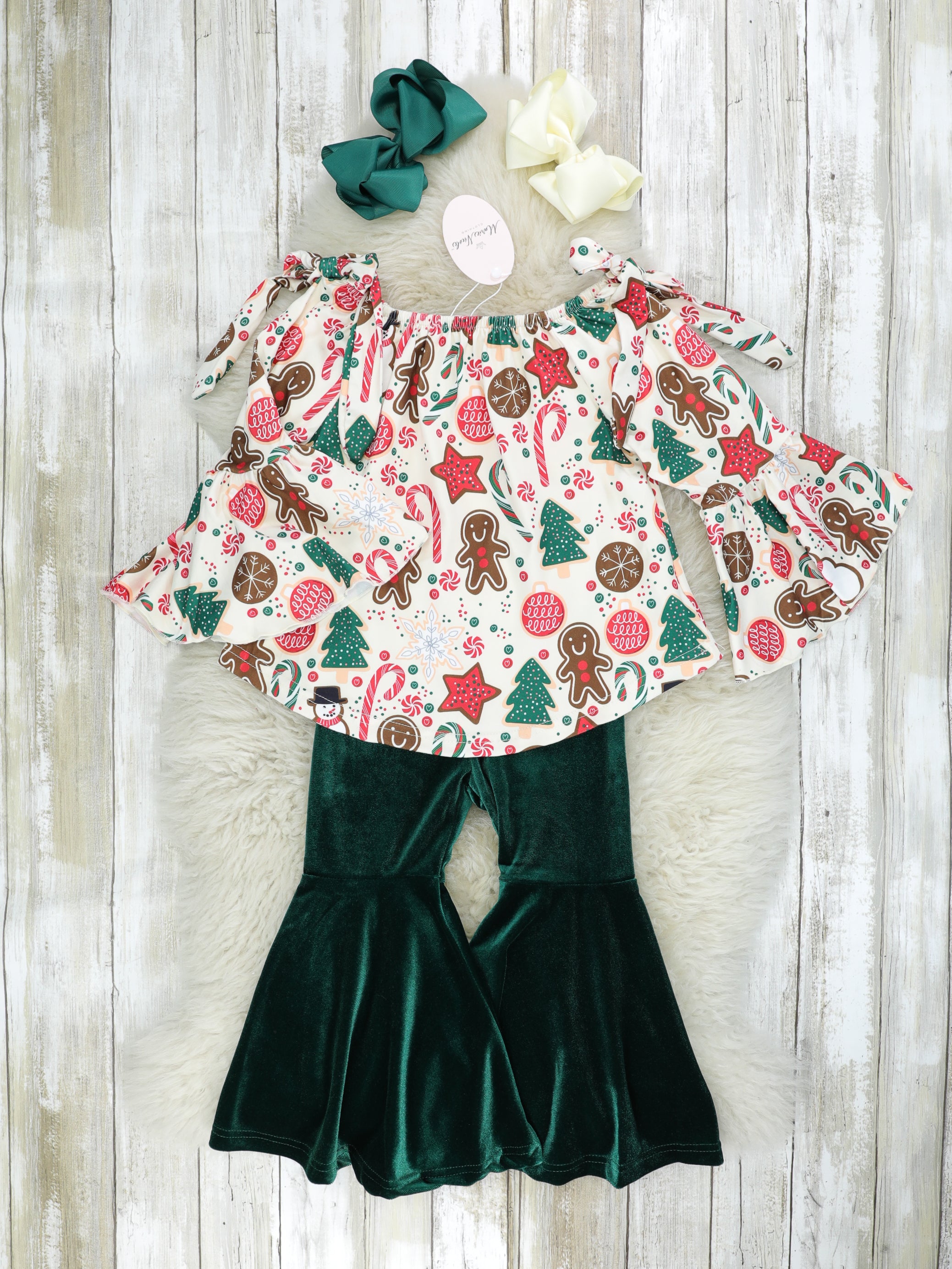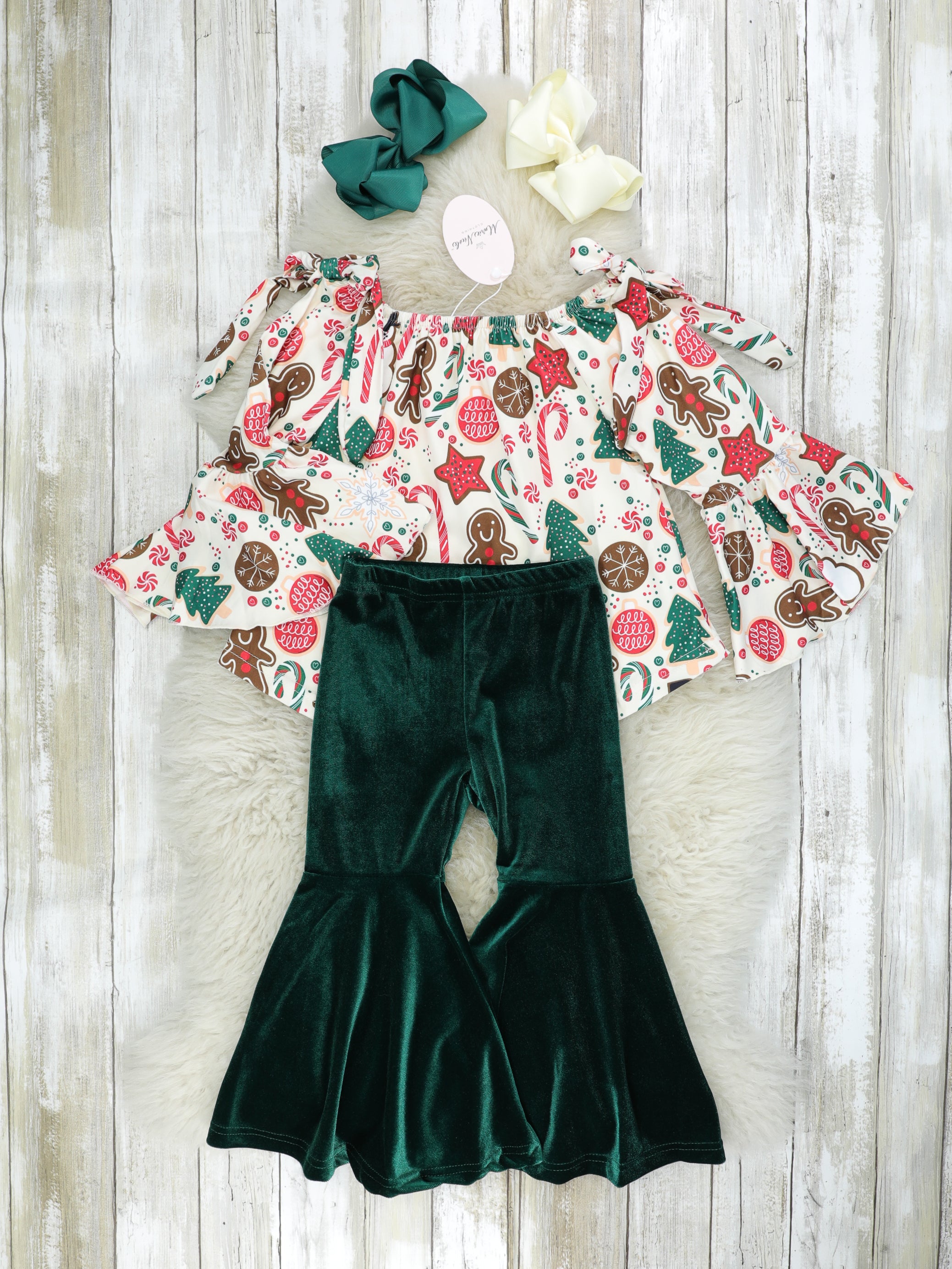 The best sibling set for your sweets! This outfit features an on or off the shoulder top with Christmas sweet treats, bell sleeves, tie details, & green velvet bell bottoms.