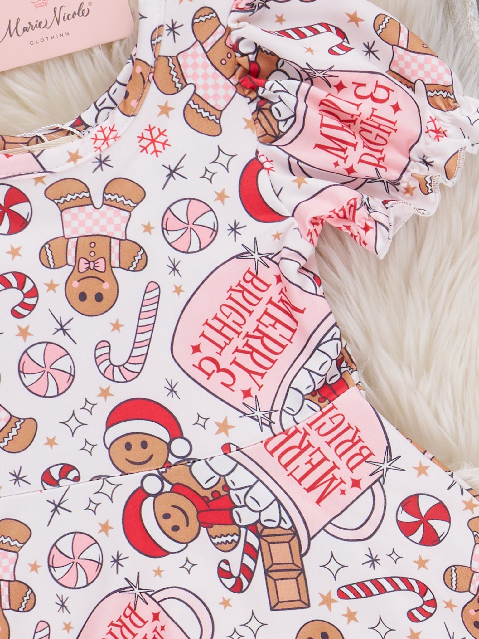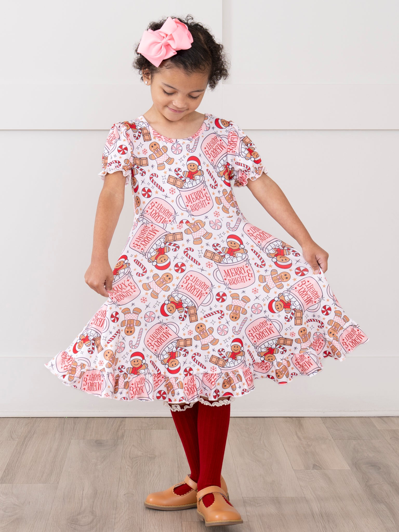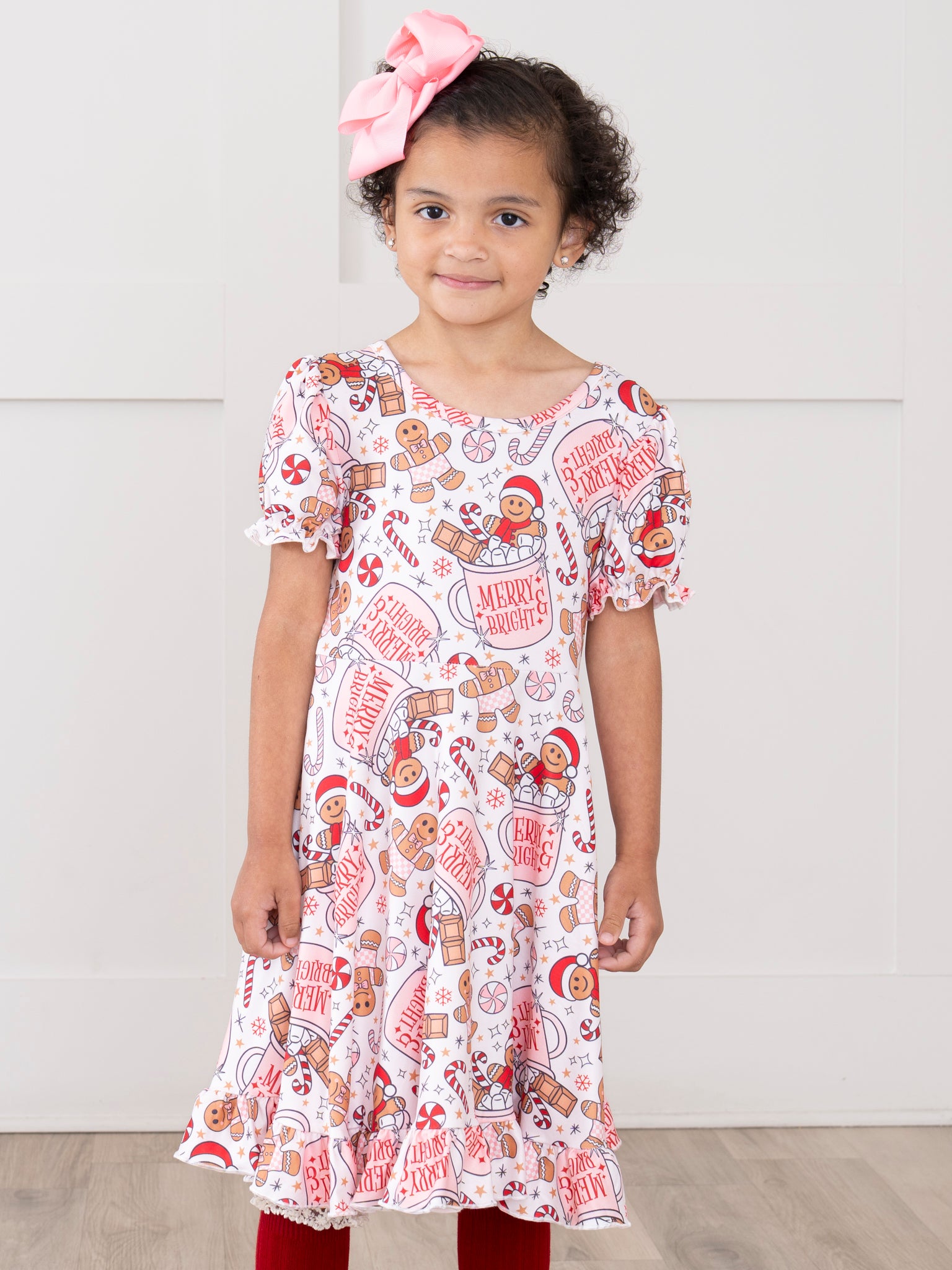 The Gingerbread Spice & Everything Nice Ruffle Dress by Marie Nicole Clothing is a delightful holiday dress featuring allover gingerbread and treat motifs, sweet ruffle hem, and puff sleeves. Designed for twirling and festive fun, this charming dress is ideal for seasonal parties, pictures, and cozy celebrations filled with gingerbread cheer.