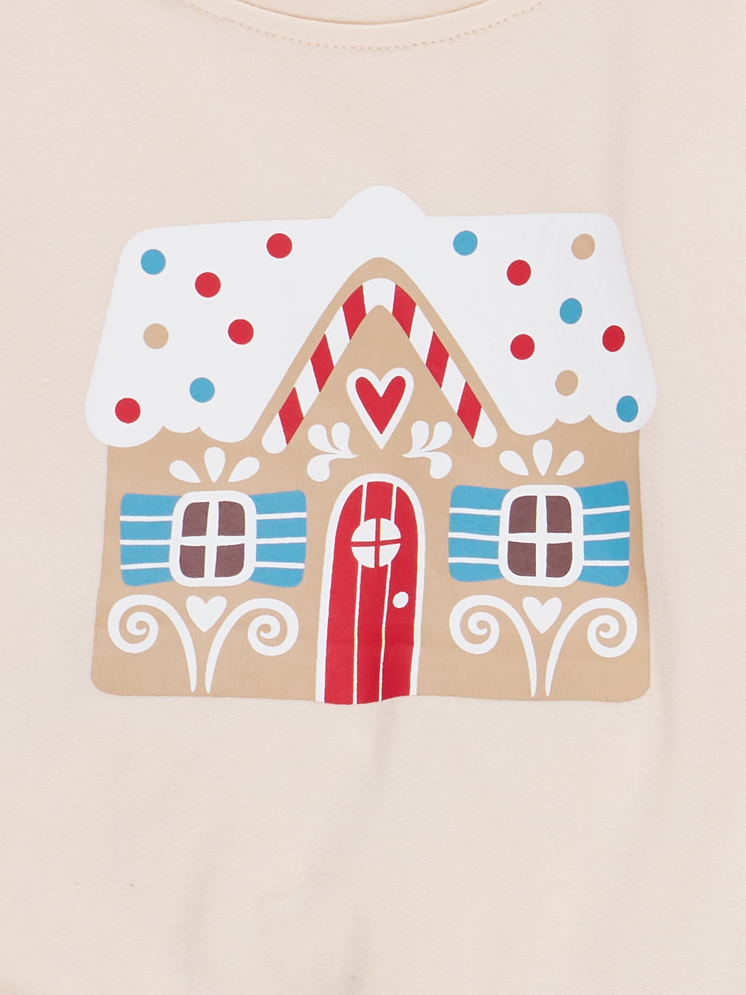 Sweeten this holiday season with our Gingerbread Village Outfit! Featuring a playful gingerbread house vinyl printed design on the top and a charming gingerbread village print on flare pants, this outfit is perfect for your little one's Christmas activities. Plus, it's available in a sister set, so they can match with their little!