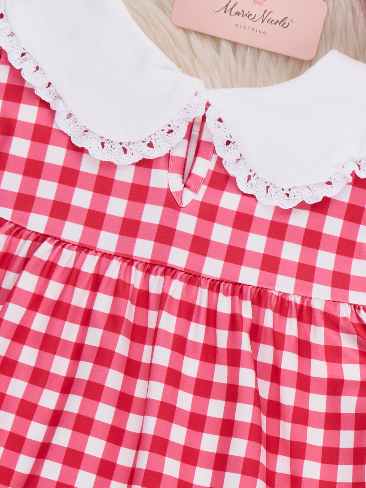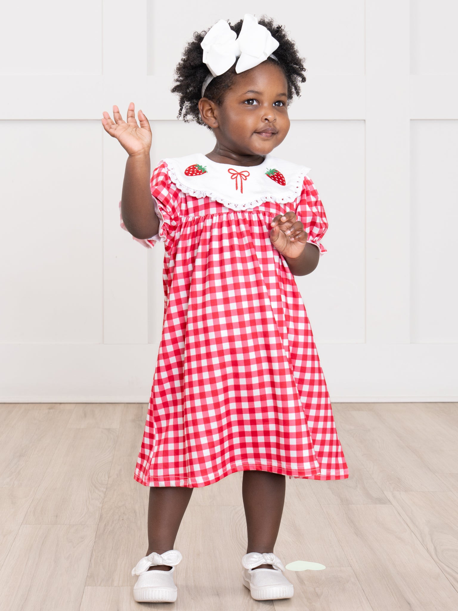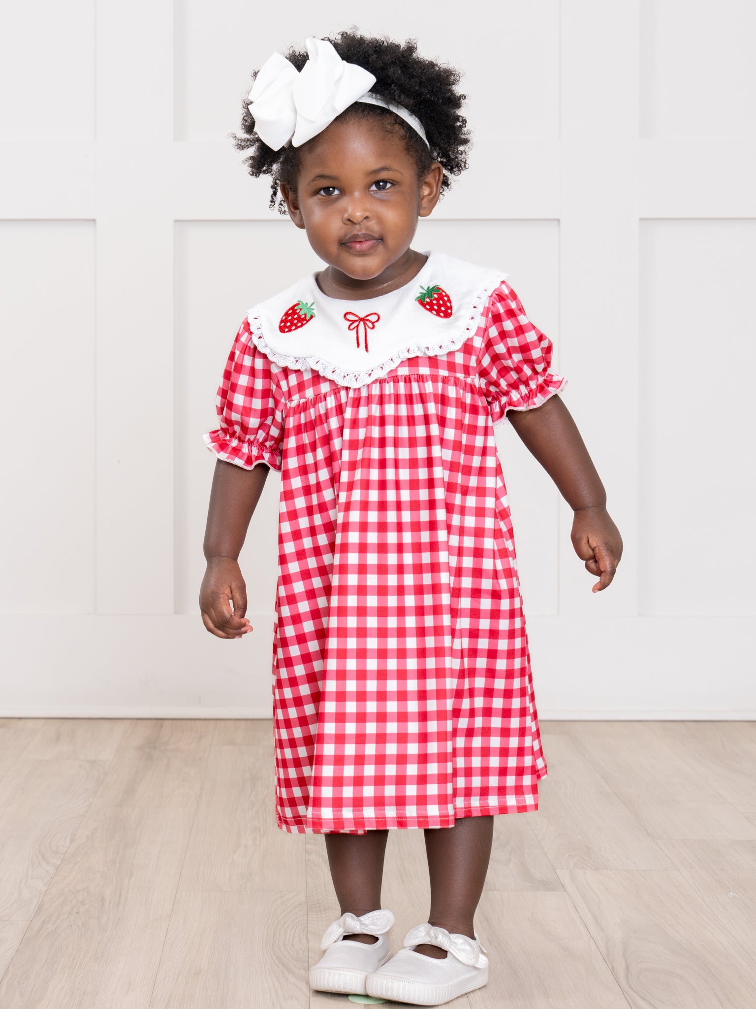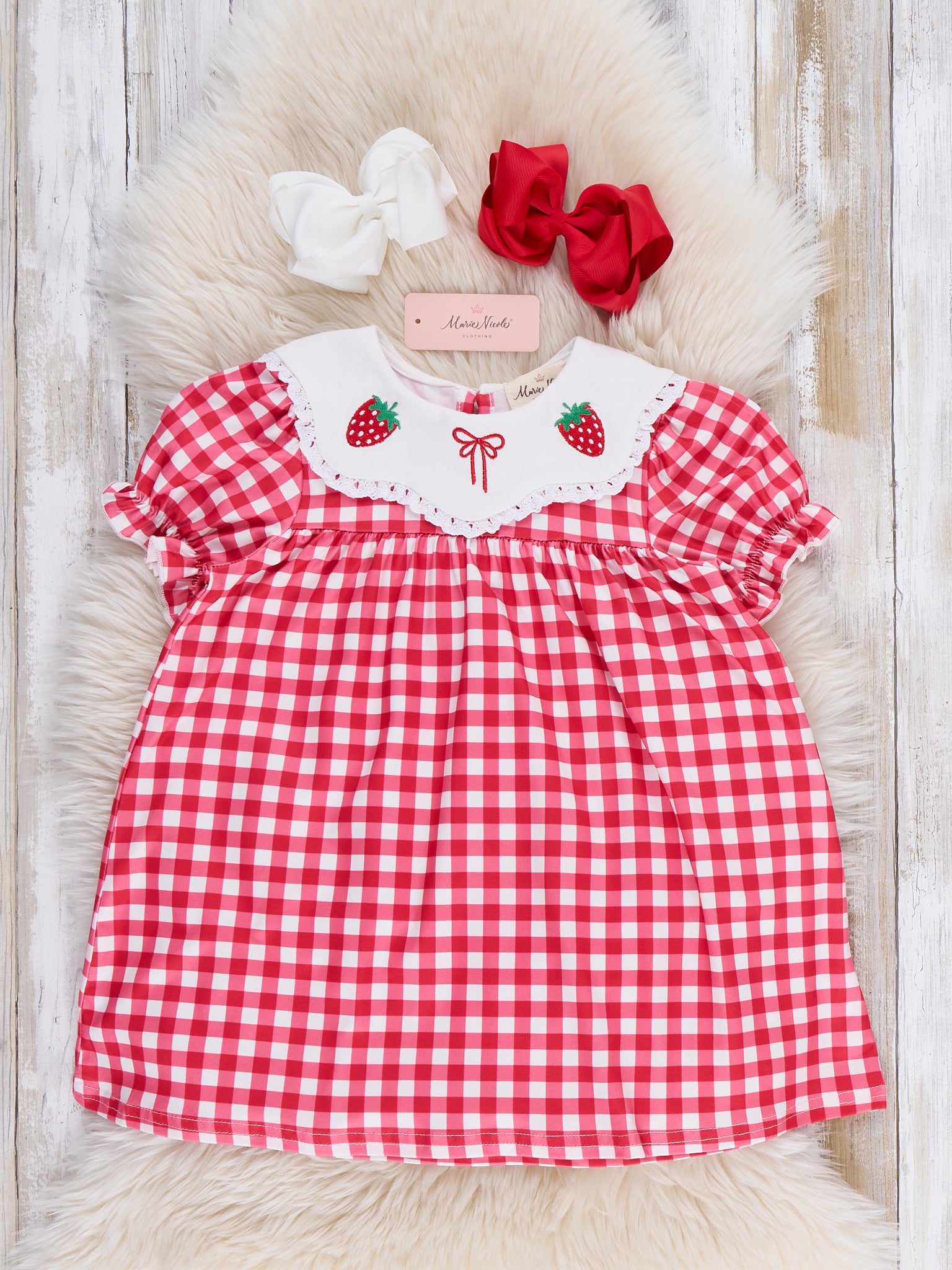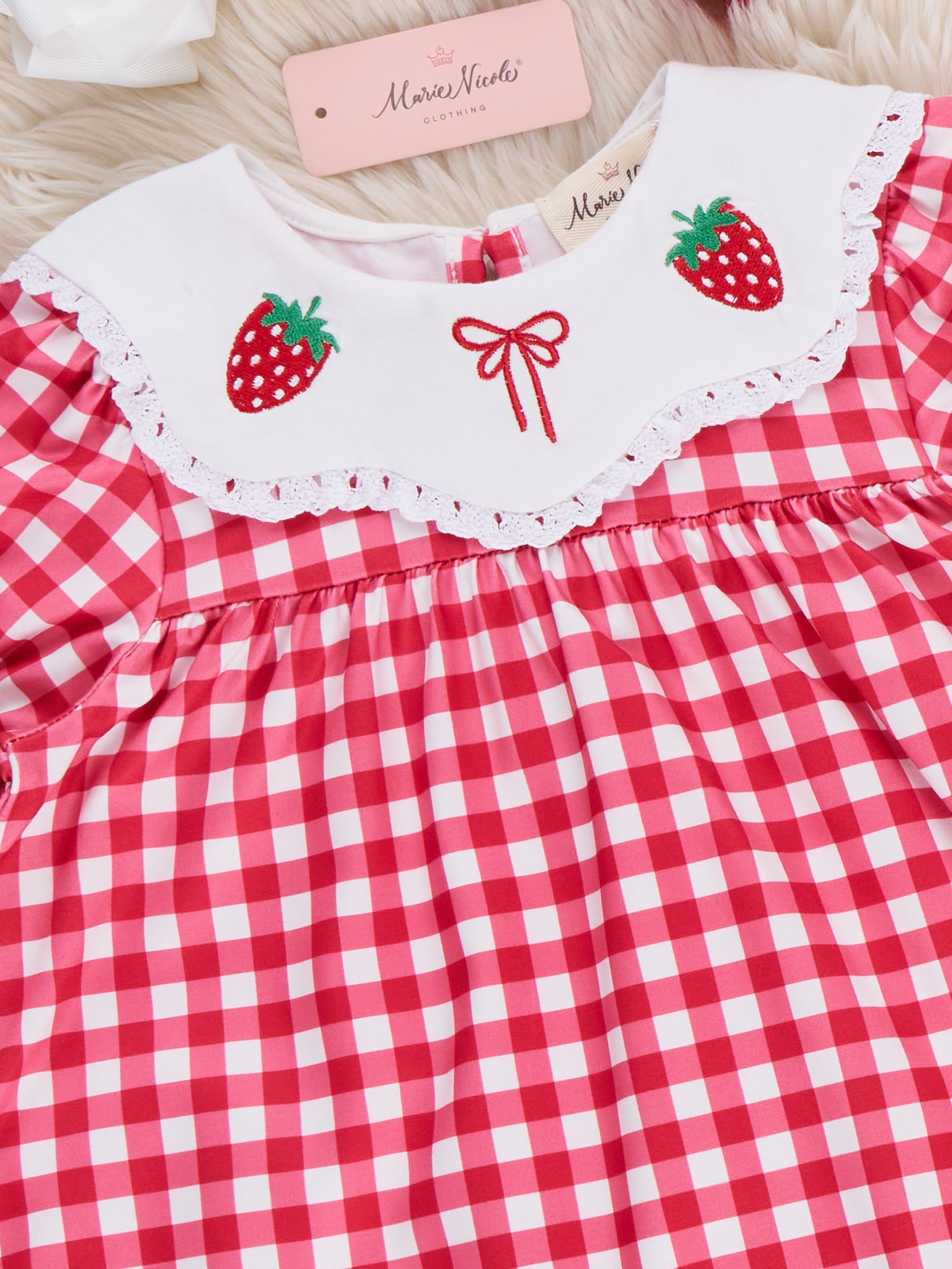 The Gingham Berry Charm Embroidered Dress from Marie Nicole Clothing delights with its classic checkered pattern and charming embroidered details along the neckline. Designed with soft puff sleeves and a gently flared silhouette, it offers both comfort and timeless style. Crafted from breathable fabric, it keeps little ones feeling light and free, making it perfect for outings, celebrations, and everyday sweetness.