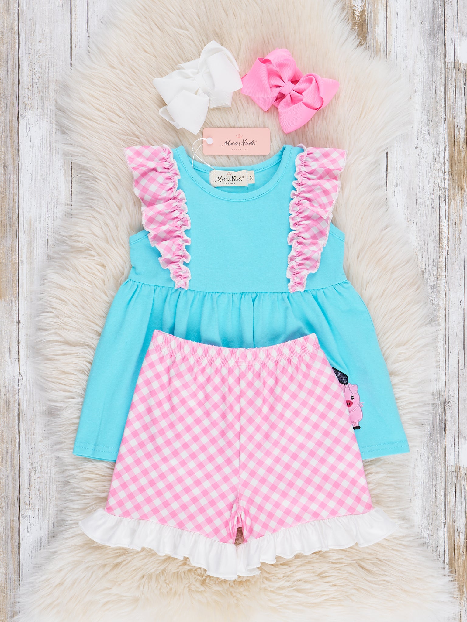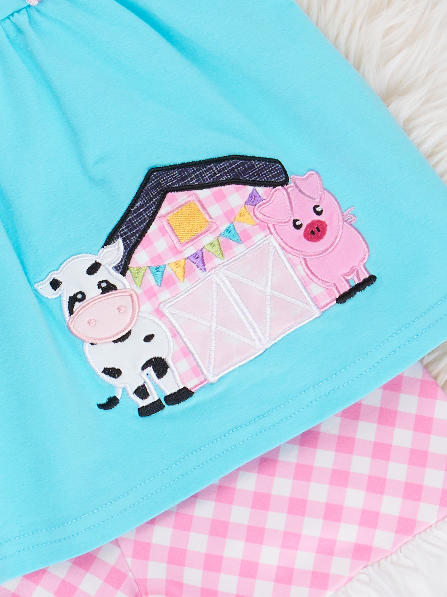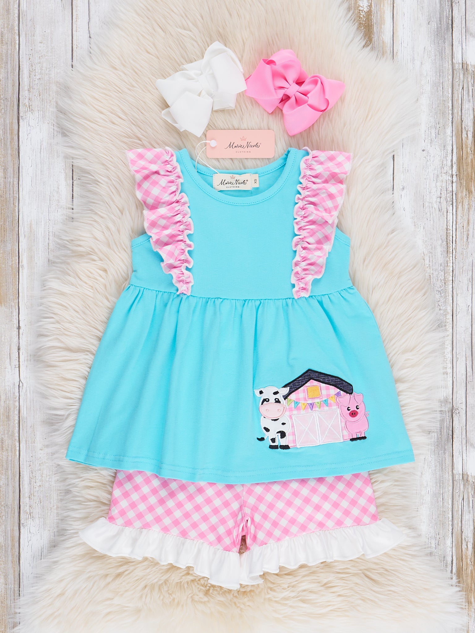 Get ready to frolic in the Gingham Farmhouse Embroidered Ruffle Outfit! This playful girls shorts set features an embroidered farmhouse and farm friends on a charming teal bodice top. The pretty pink gingham flutter sleeves perfectly match the ruffle shorts. Perfect for a sister set, this outfit from Marie Nicole Clothing adds a touch of farm fun to any wardrobe.