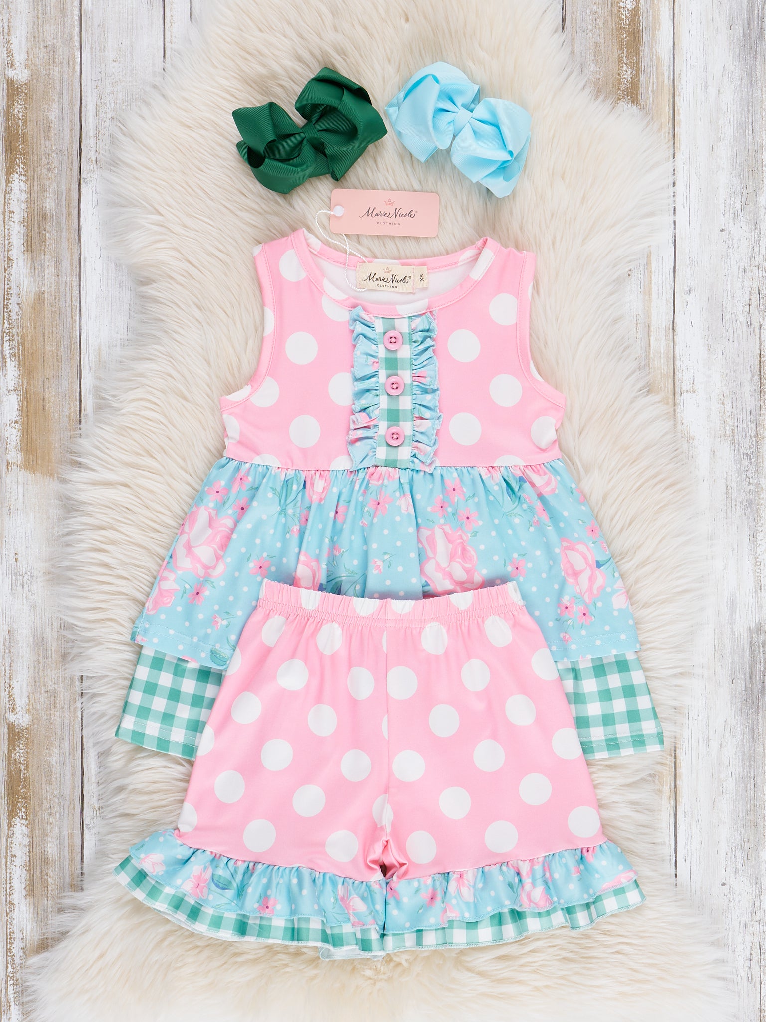 Get ready for some summer fun with our Gingham Polka Dot Garden Ruffle Outfit! This playful girls' ensemble features a swing top with a mix of pink polka dots, green gingham, and florals, paired with pink polka dot shorts boasting a tiered ruffle hem. Perfect for sisters to match in style. By Marie Nicole Clothing.