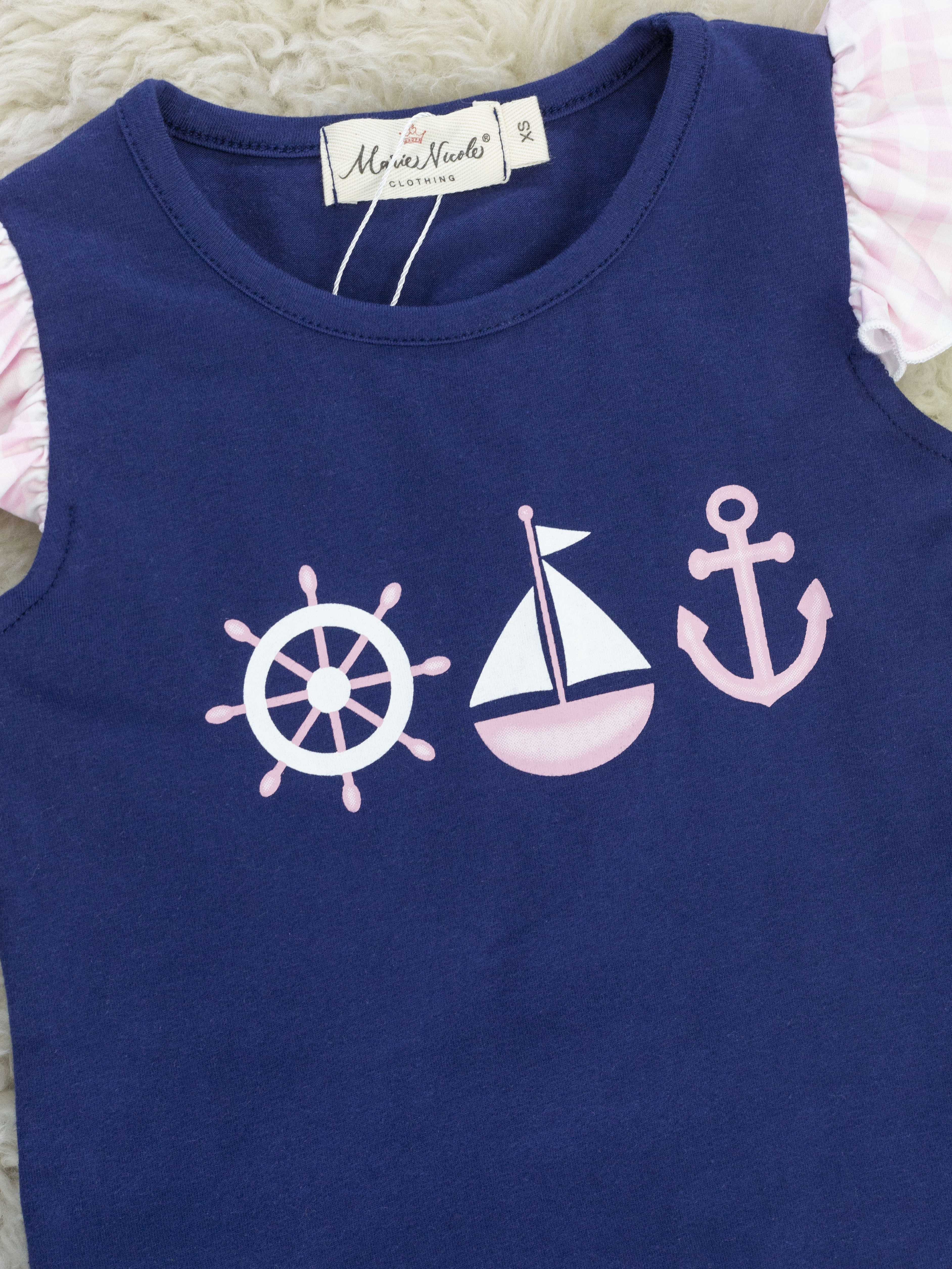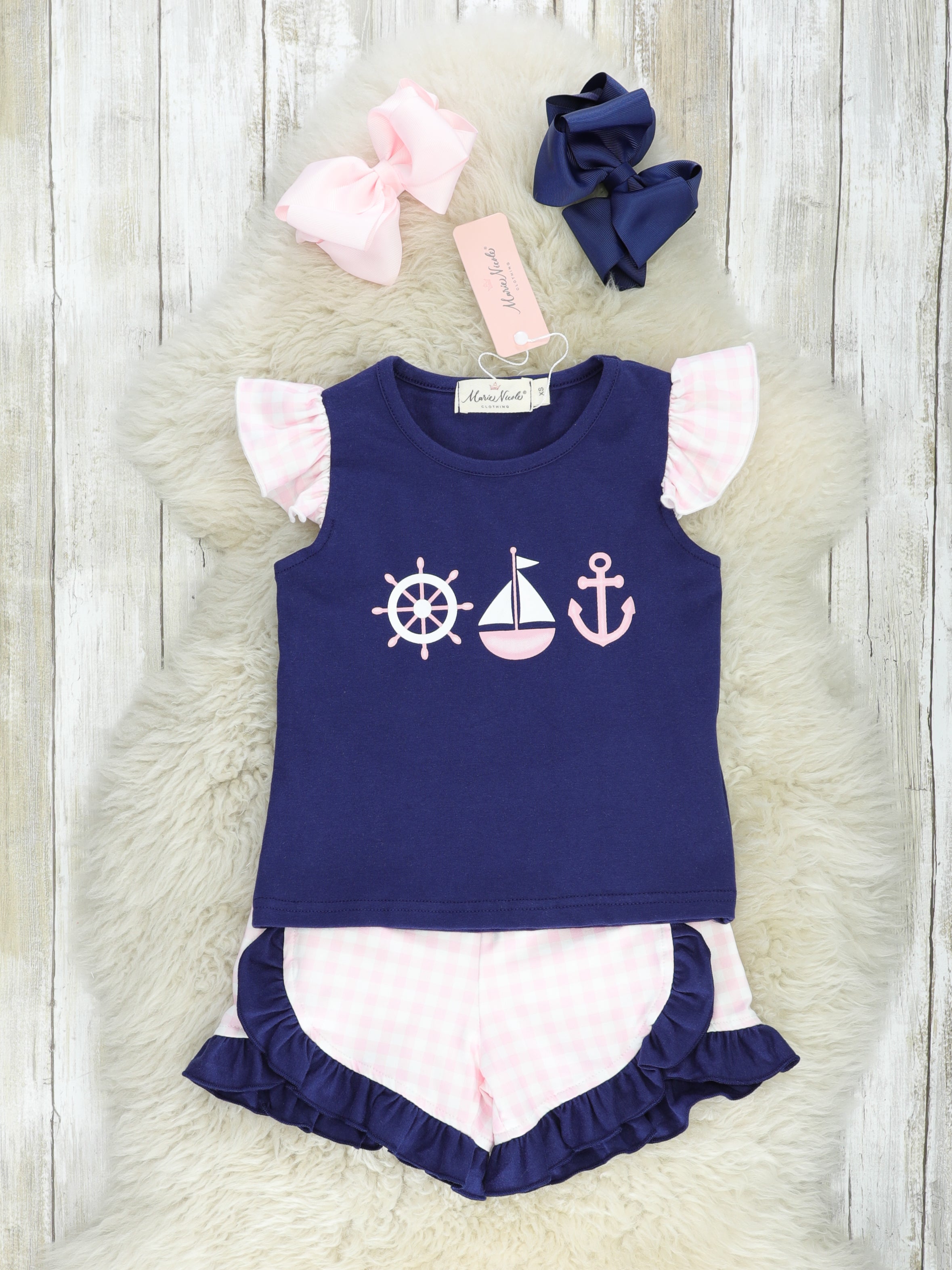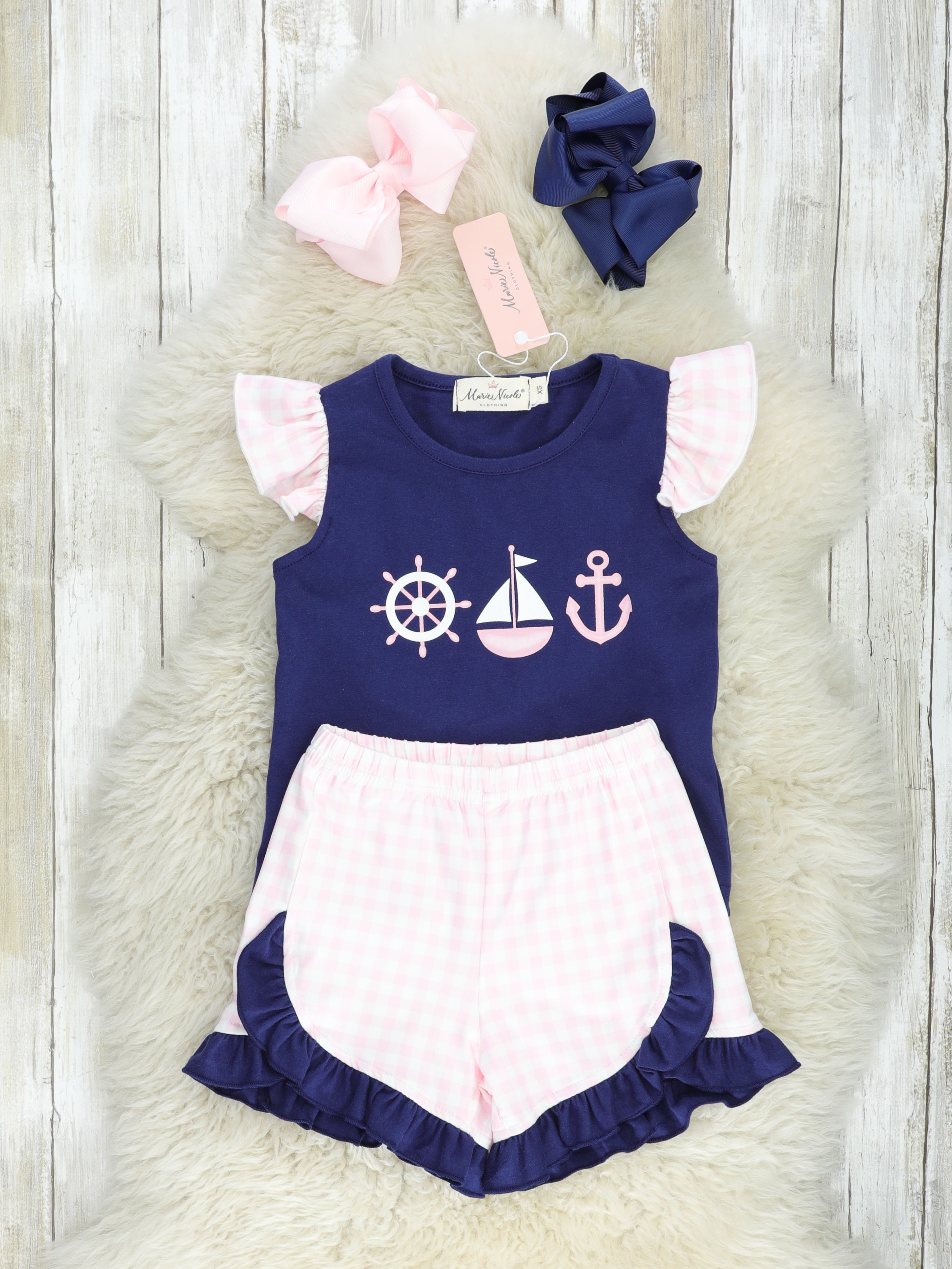 Let your little trendsetters sail away with style in this delightful sister set! This outfit sails into the scene with gingham, sailboat details, and is topped off with ruffles sure to make waves! Perfect for twinning or siblings looking for a cute coordinating look.