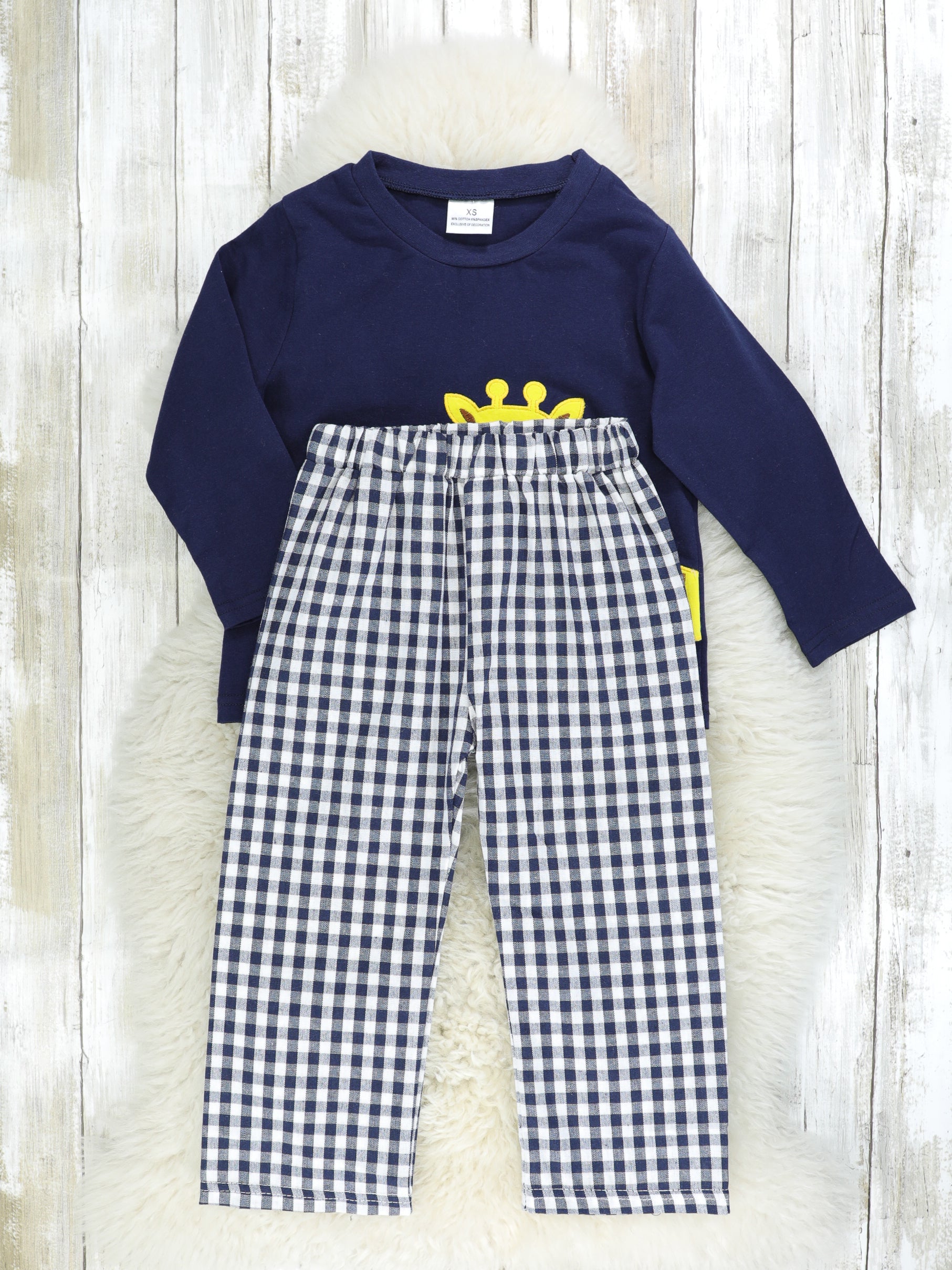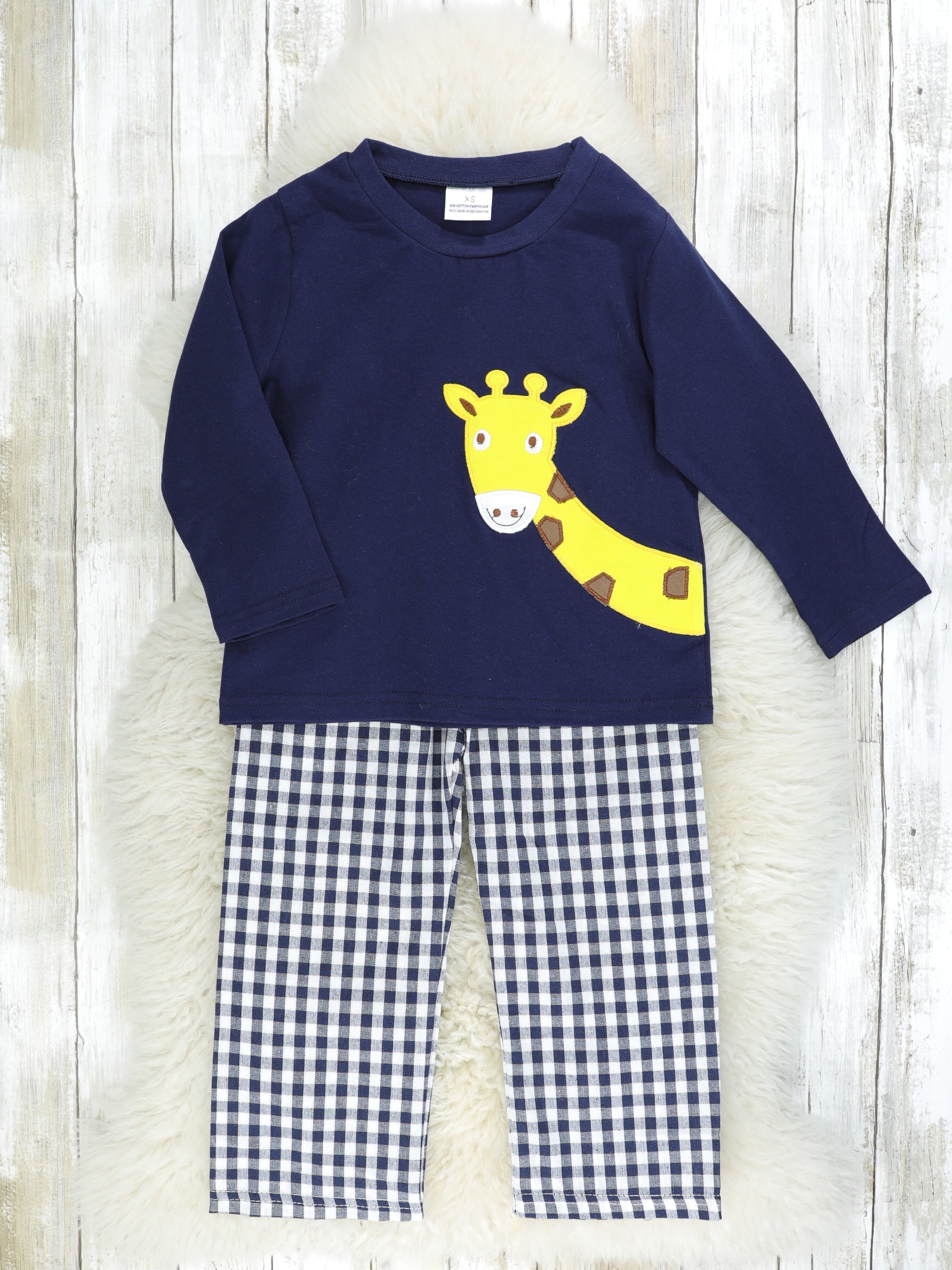 A sweet sibling set for your little giraffes! This outfit features a navy top with a giraffe appliqué & gingham pants.