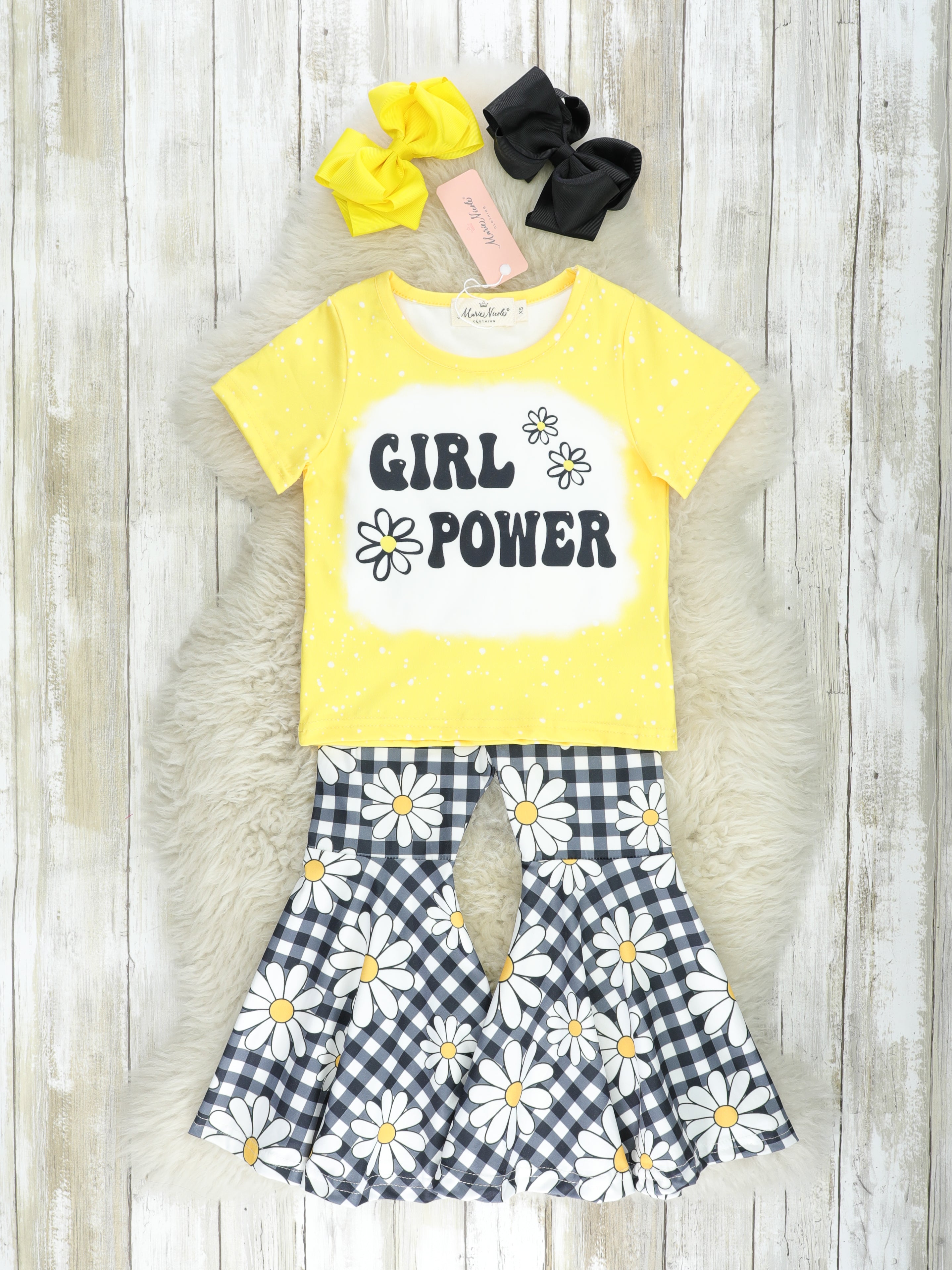 Show 'em who's boss with our "Girl Power" Daisy Bell Bottoms Outfit! This playful and fashionable ensemble includes a stylish yellow top and bold, blooming Daisy bell bottoms with an elastic waistband, so she feels both comfortable and confidently cool.
