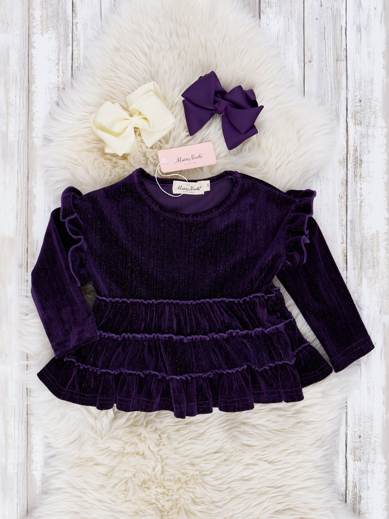 This girls' velvet ruffle shirt features ruffle shoulders, a tiered ruffle swing design, and it's perfect for the upcoming holiday season!