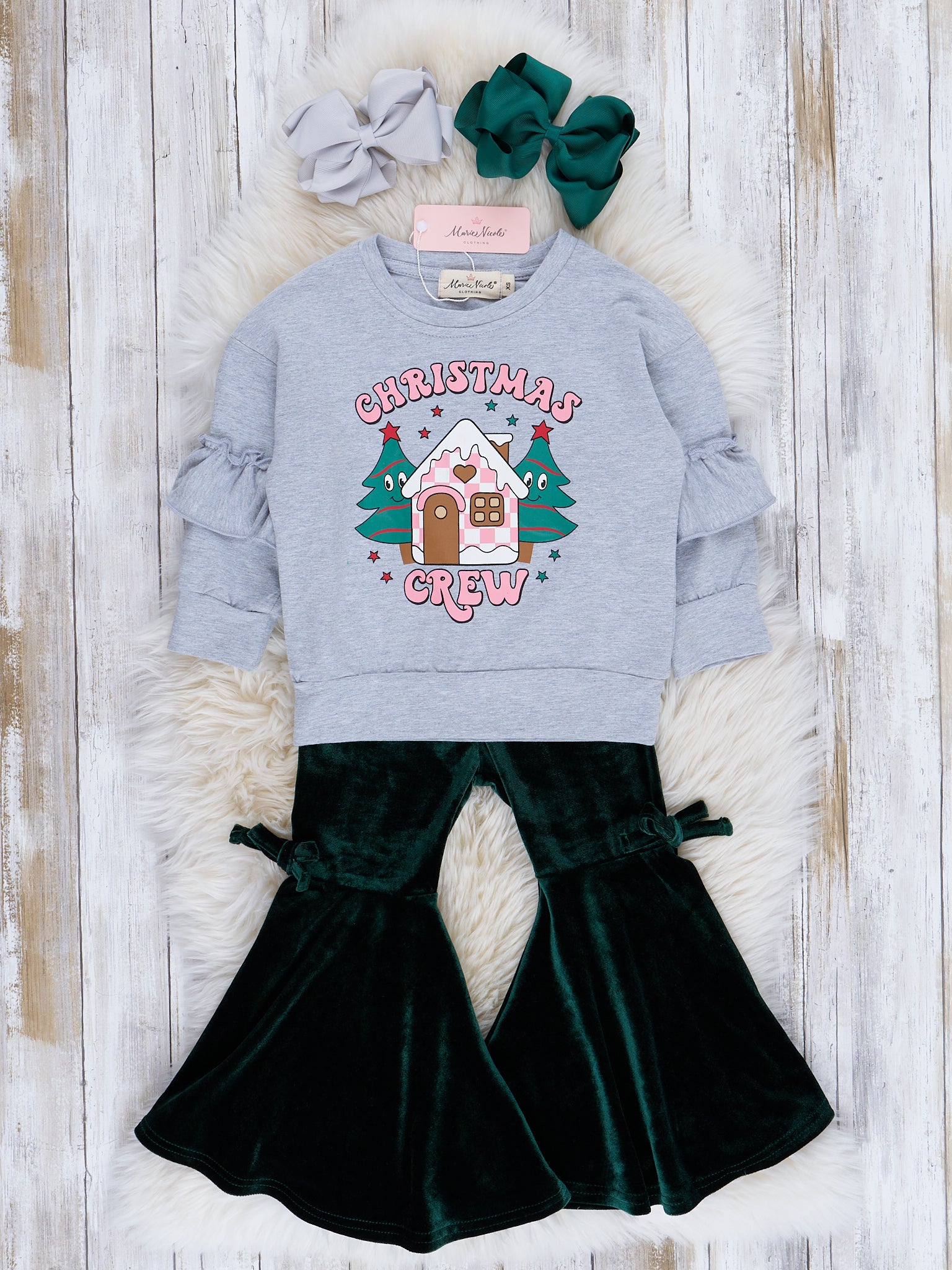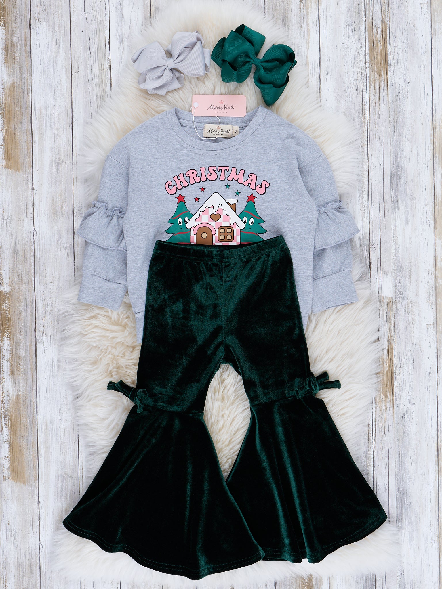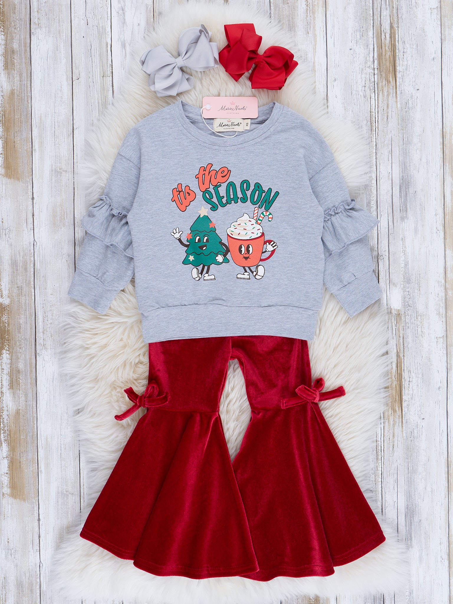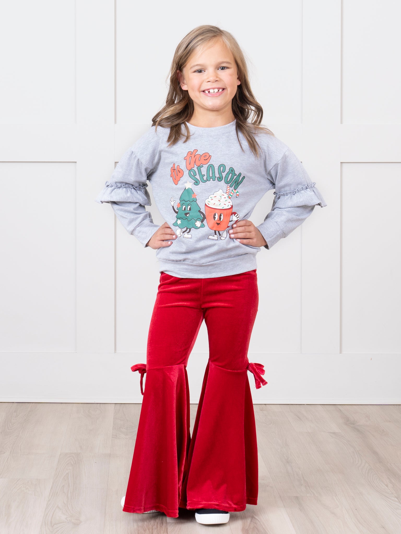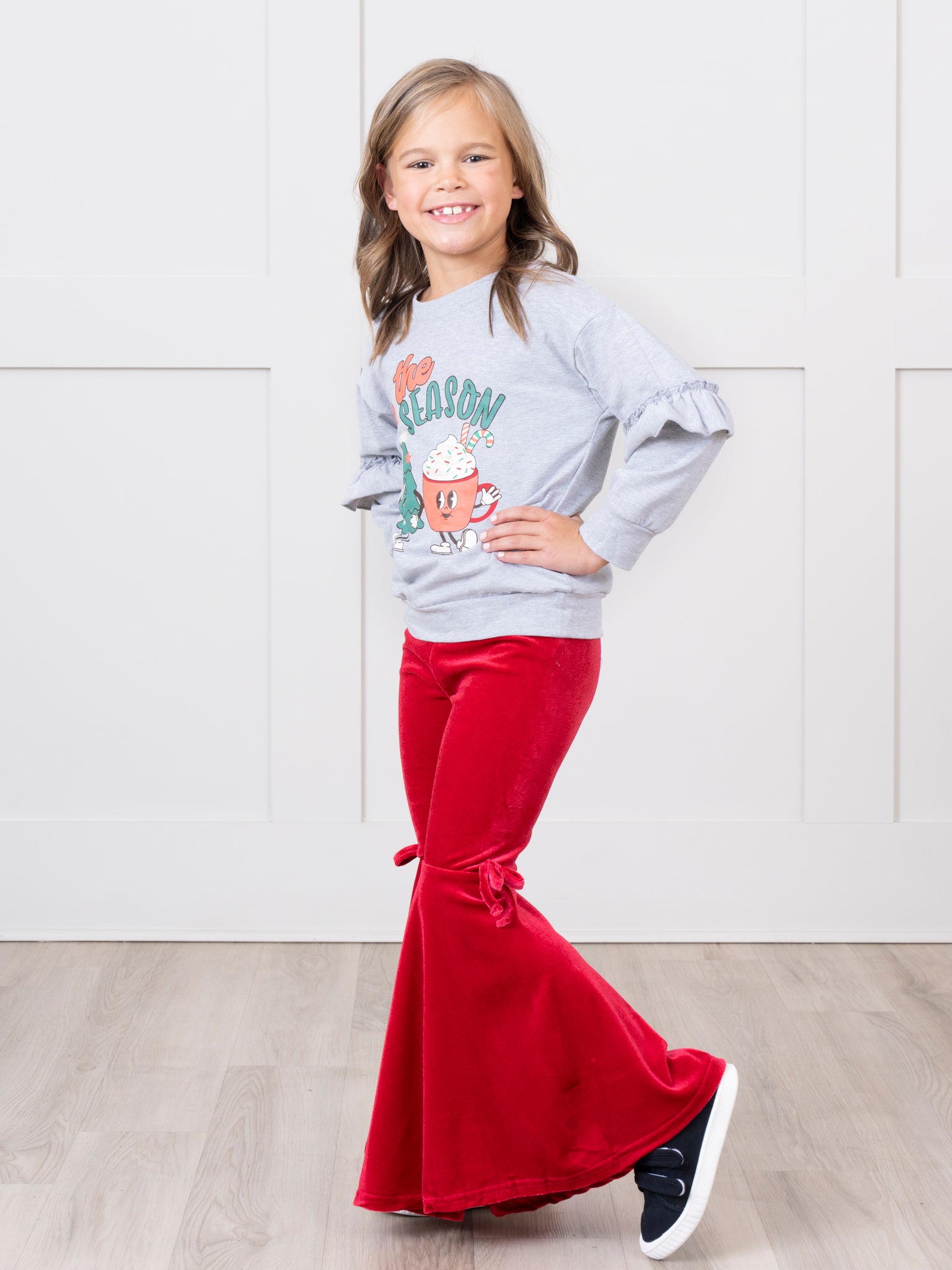 Put your comfort first in this velvety-soft Glad Tidings velvet bell bottom outfit. Featuring an eye-catching bow detail at the knees and a chic grey ruffle top, this one-of-a-kind two-piece steals the show with playful panache! Perfect for an evening of fun!
