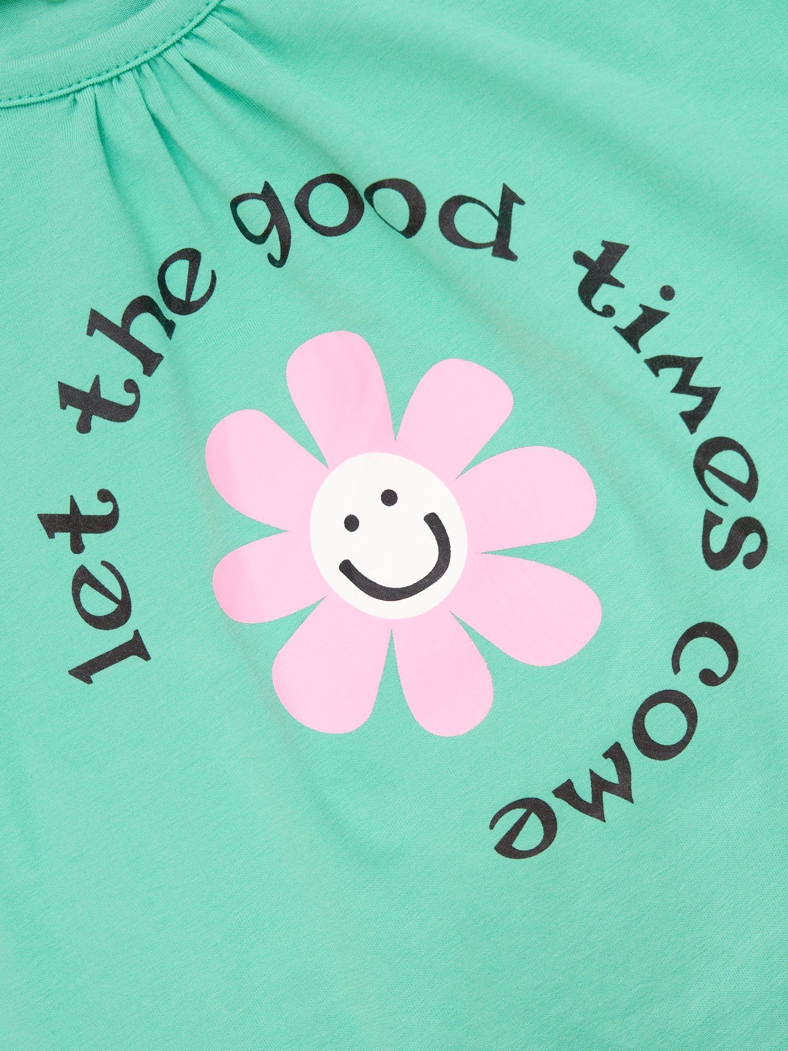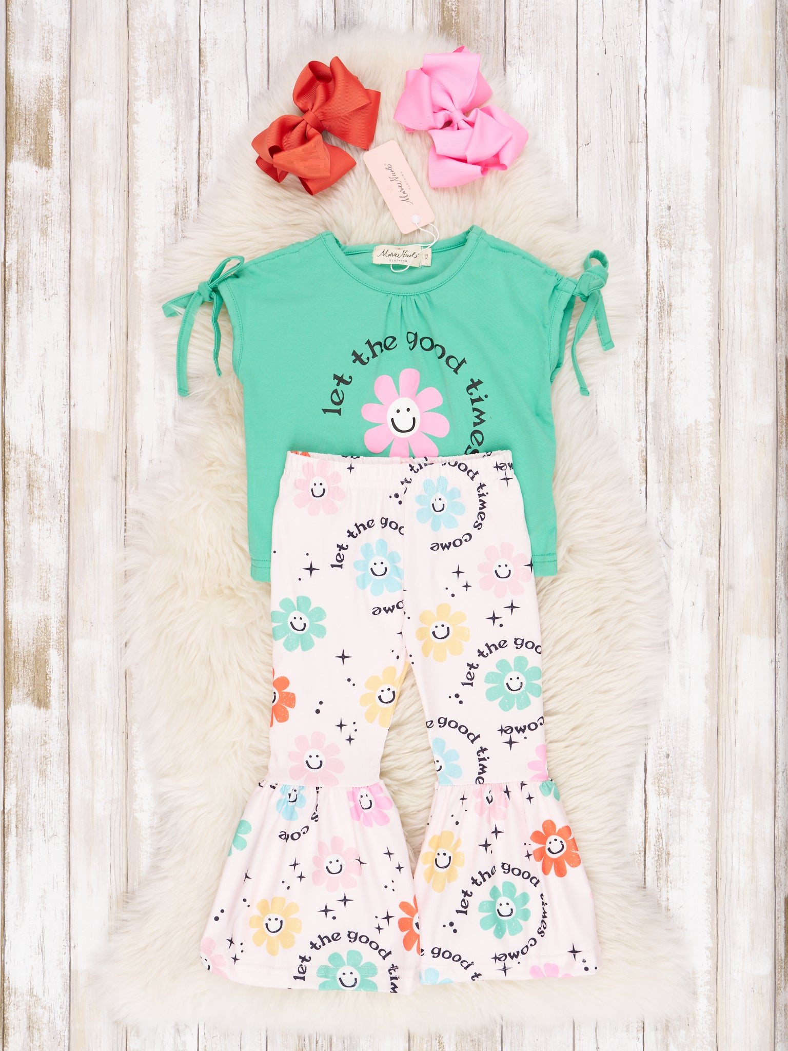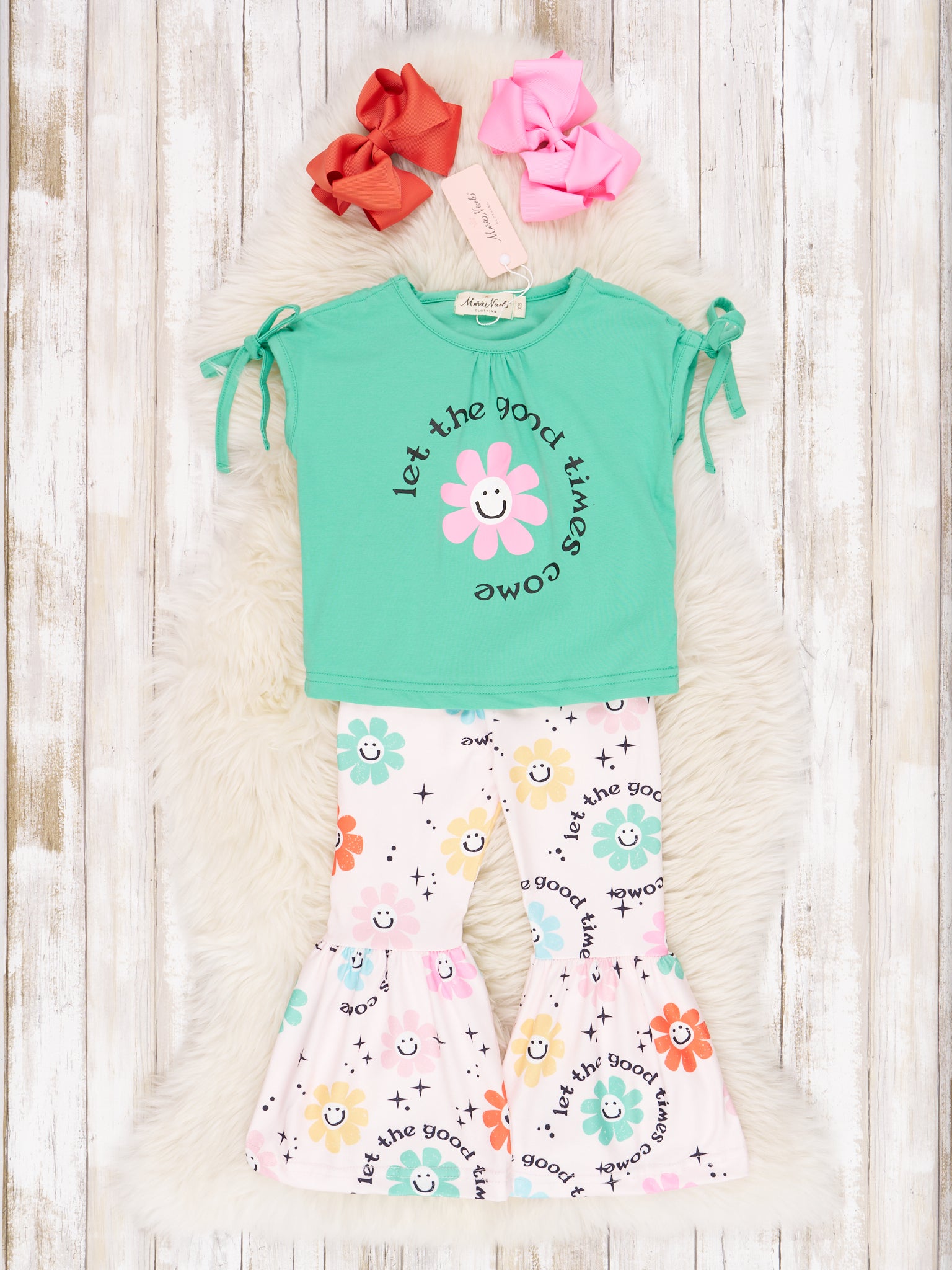 Give her wardrobe a groovy upgrade with this outfit. The tank top features a "Let the good times come" message, while the comfy bell bottoms with a smiley face pattern and elastic waistband will have your little one jumping for joy!