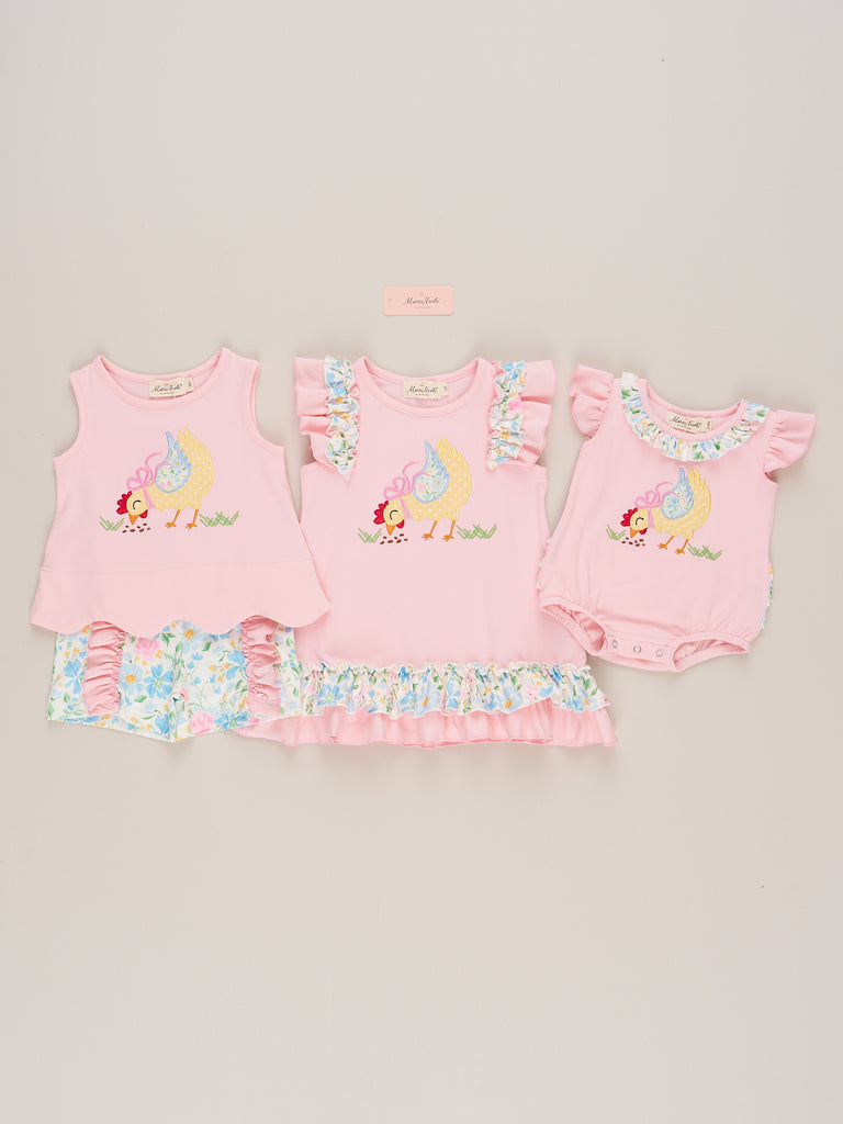 Bring a touch of farmyard charm to her day with the Grazing Hen Embroidered Ruffle Bubble from Marie Nicole Clothing. Featuring delicate hen embroidery and sweet ruffle accents, this bubble blends whimsy with comfort for everyday play or special outings. It's a chirping cute look she’ll love to wear!