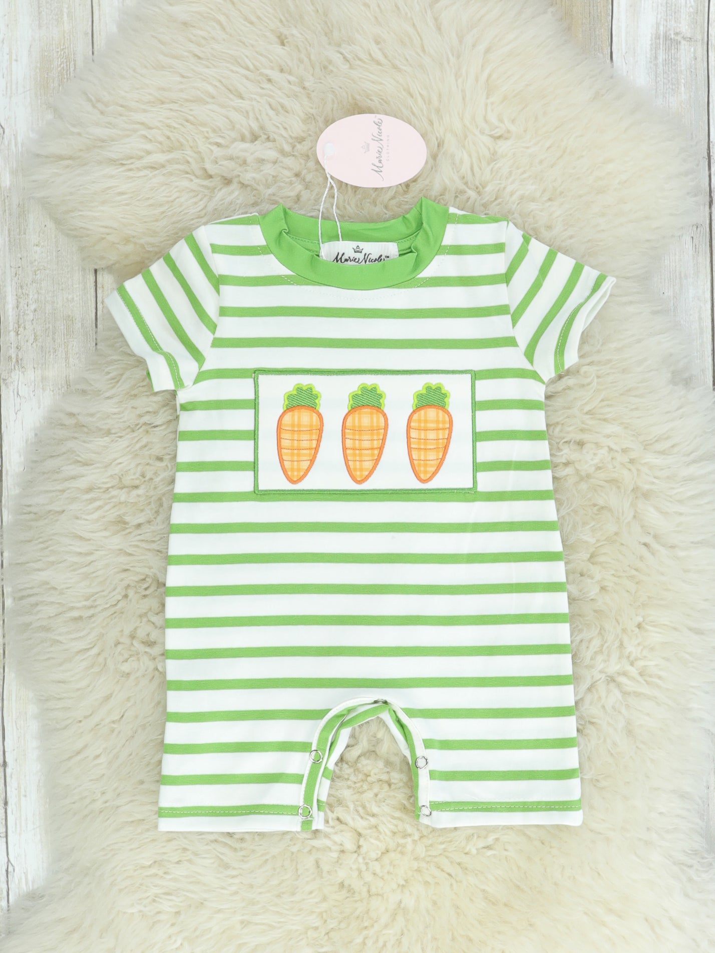 Carrots for the Easter bunny! This green striped romper has carrot appliqués and snap buttons making for easy diaper changes. Shop the collection here!