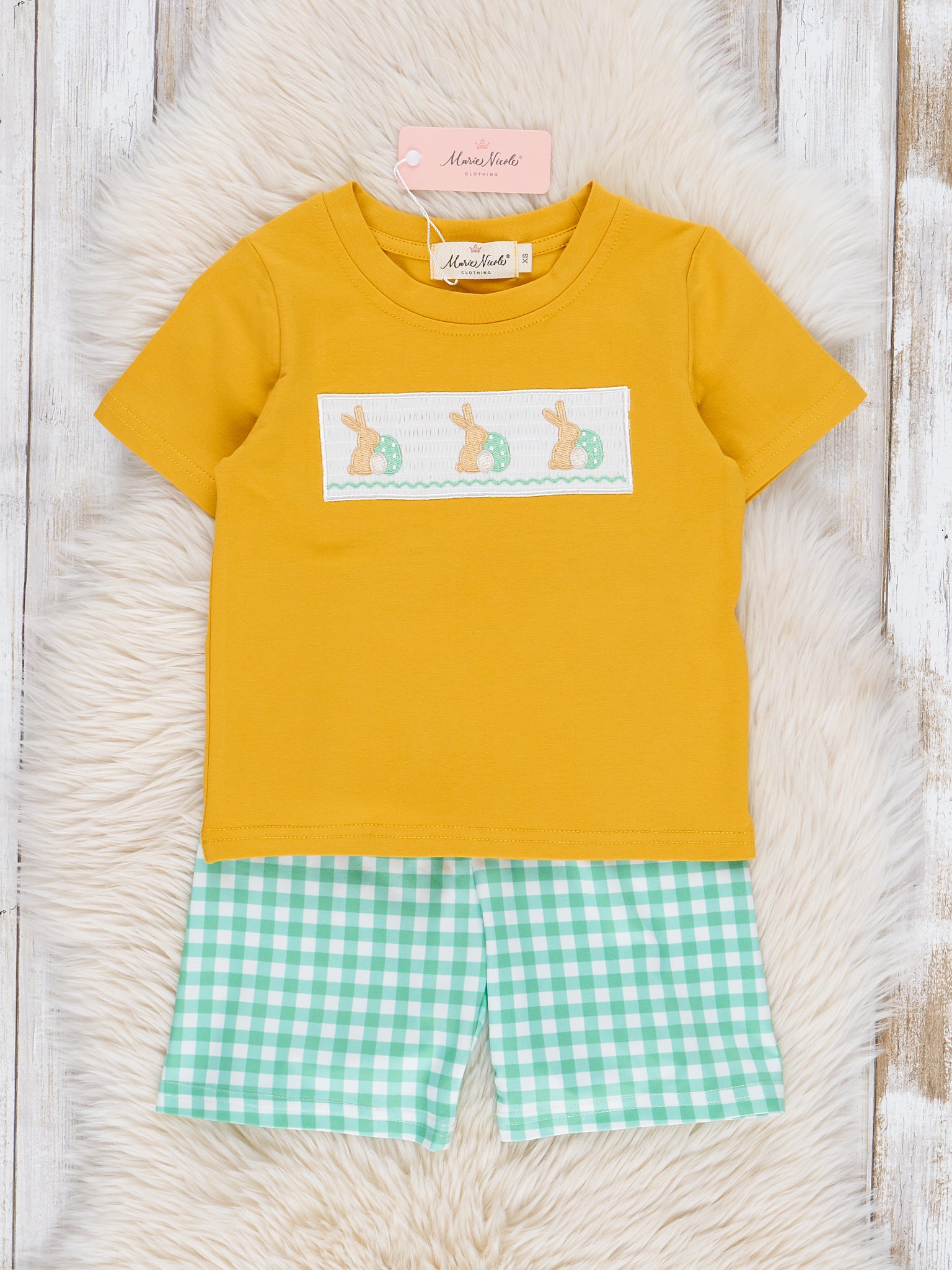 Get your little boys dressed in style with this Green Embroidered Bunny Gingham Outfit from Marie Nicole Clothing! Perfect for Easter, this adorable outfit includes an orange t-shirt with sweet embroidered bunnies over smocking and green plaid shorts with an elastic waist. Sibling matching never looked so cute!