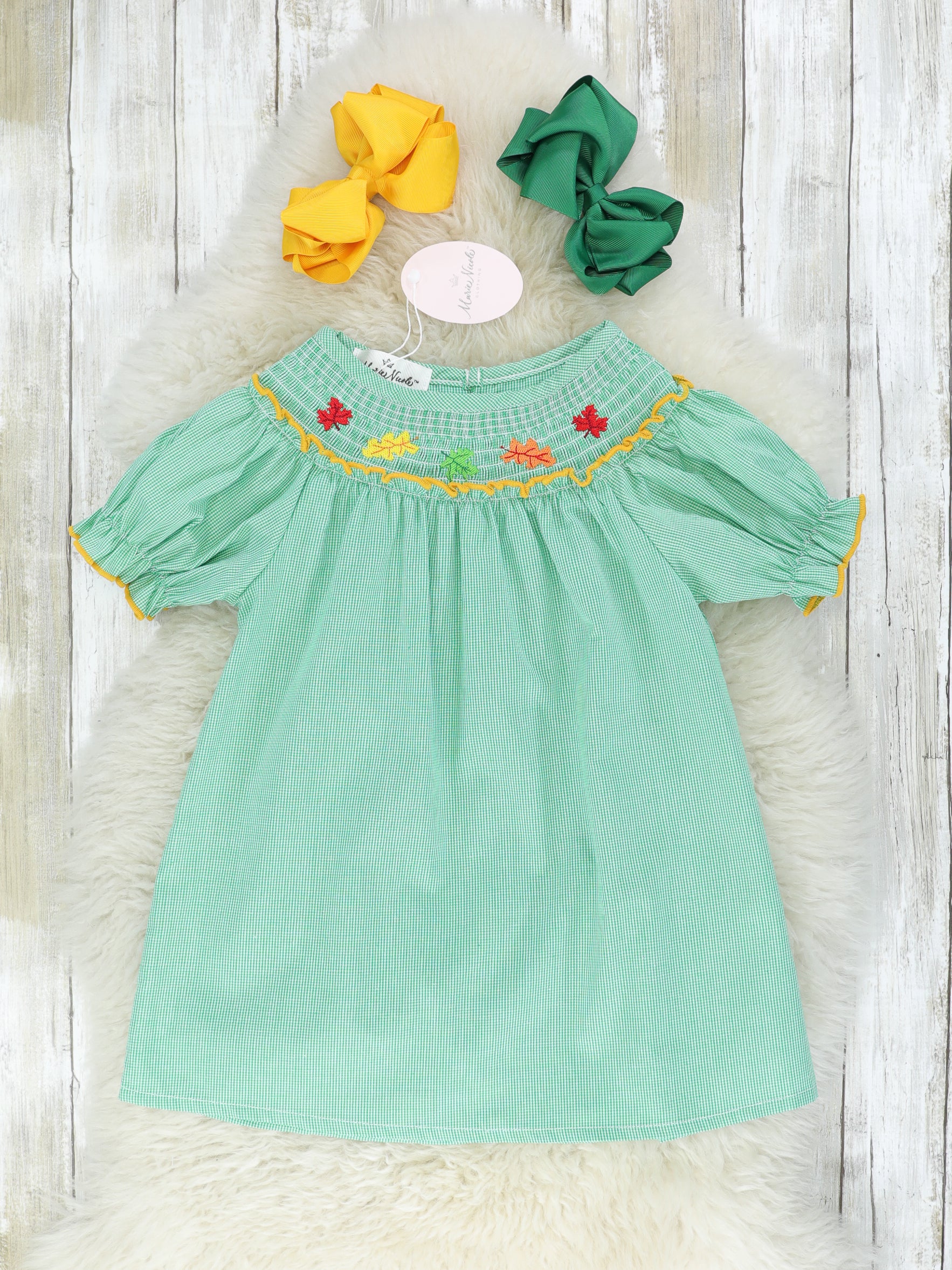 This precious dress is perfect for fall photos or a relaxing picnic! This green checked dress features a smocked neckline with embroidered leaf details, cinches at the sleeves, & ruffle trim.