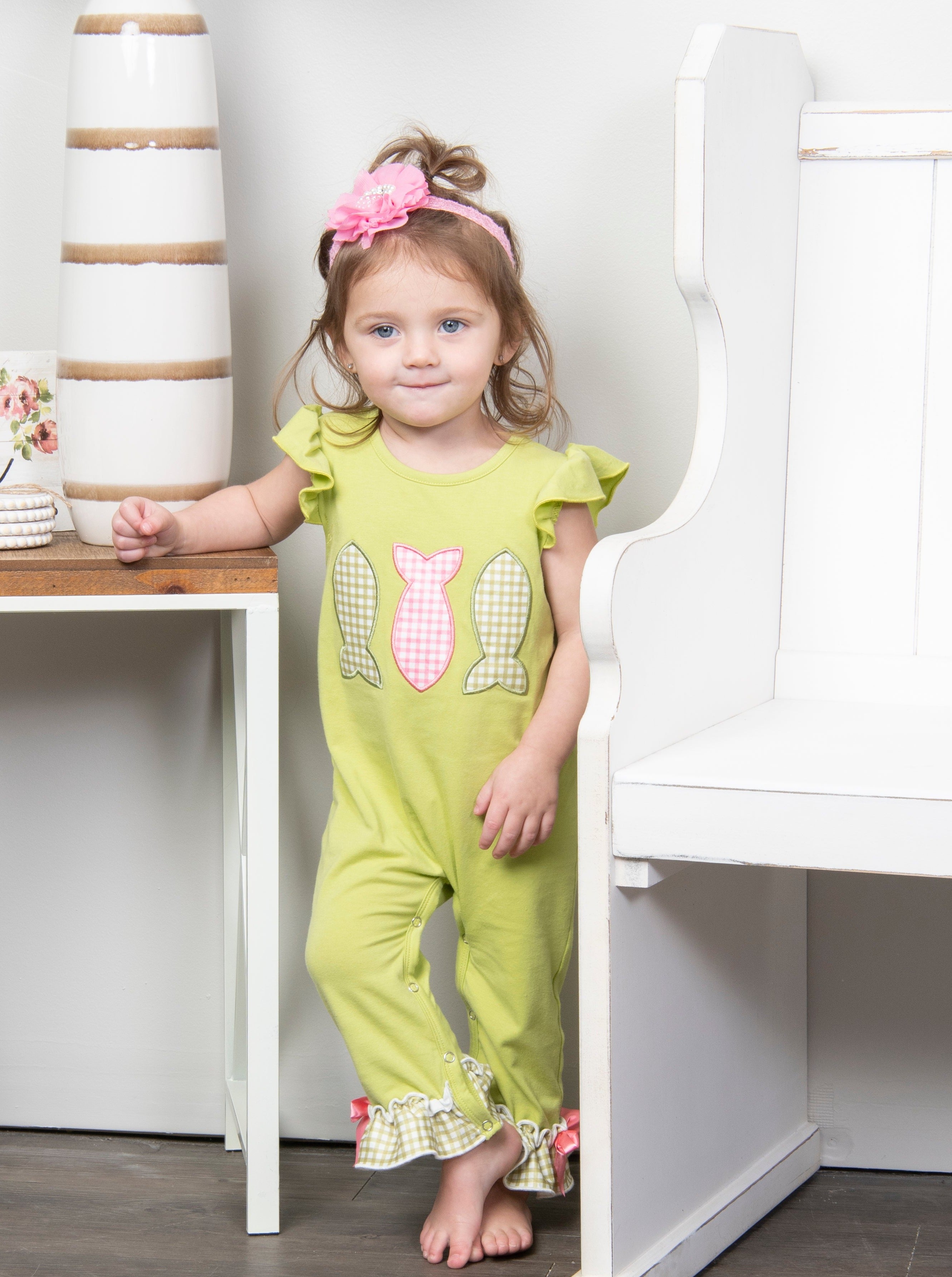 This FINtastic sibling set has something for all the kiddos! This green romper features fish appliqués, flutter sleeves, green gingham ruffles, & bow details at the ankles.