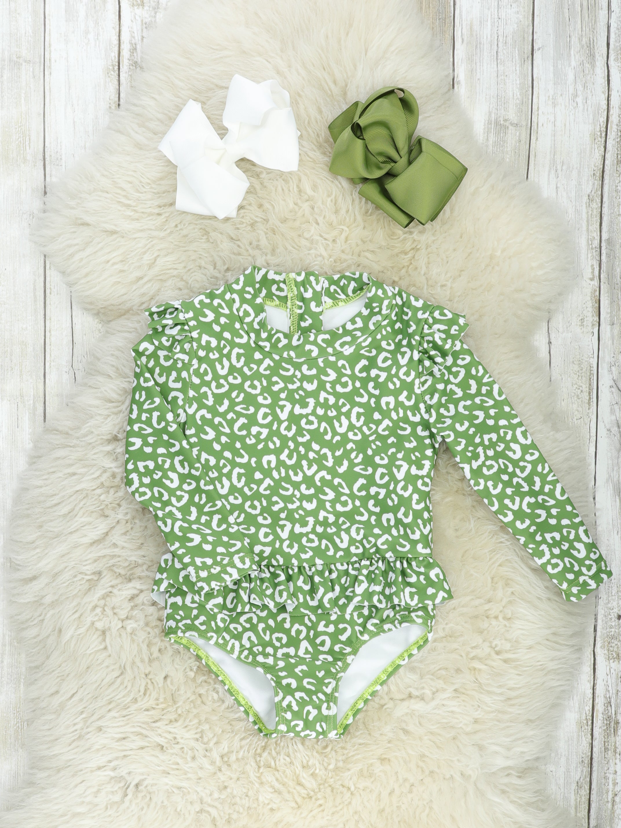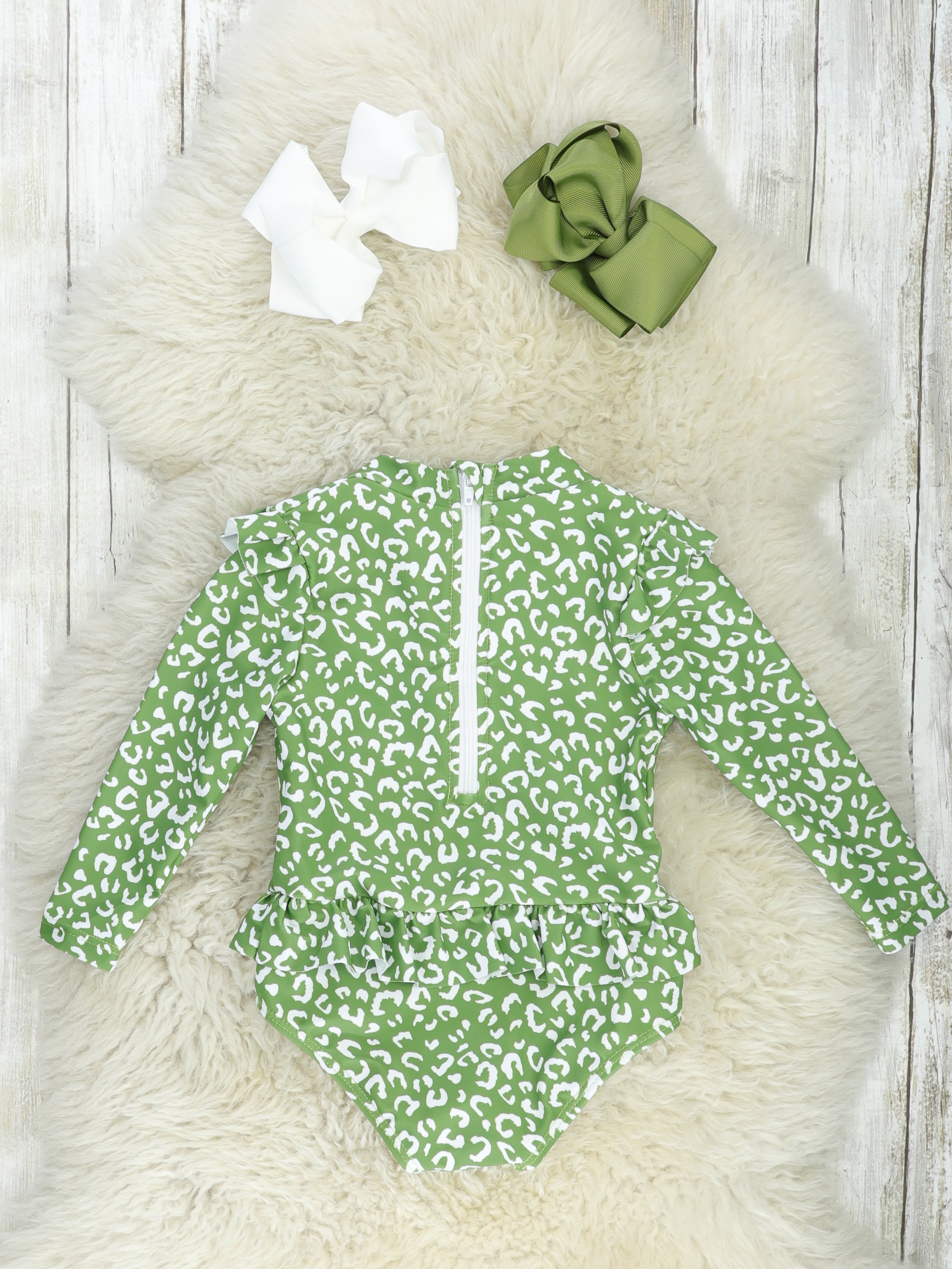 This kids rash guard swimsuit is the perfect mix of wild and wonderful! They'll stay safe from the sun and look super fly in the Green Leopard Ruffle Rash Guard. Cozy ruffles and a sleek green make it both comfy and cool. Have 'em hopping into the water in style!