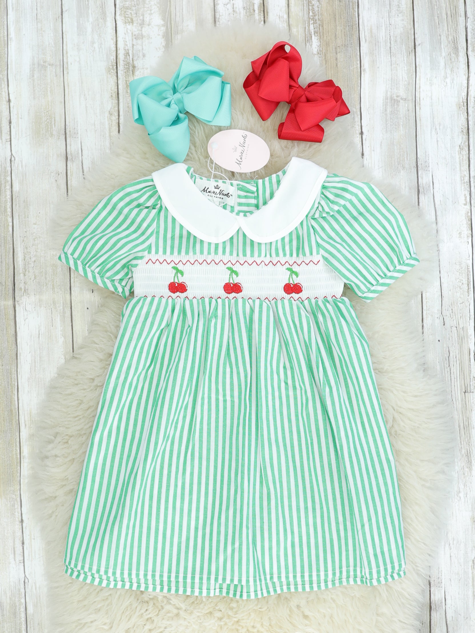 Pretty please with a cherry on top! This green pinstriped dress features a cute collar & smocked cherry detail. Shop the sister set here!