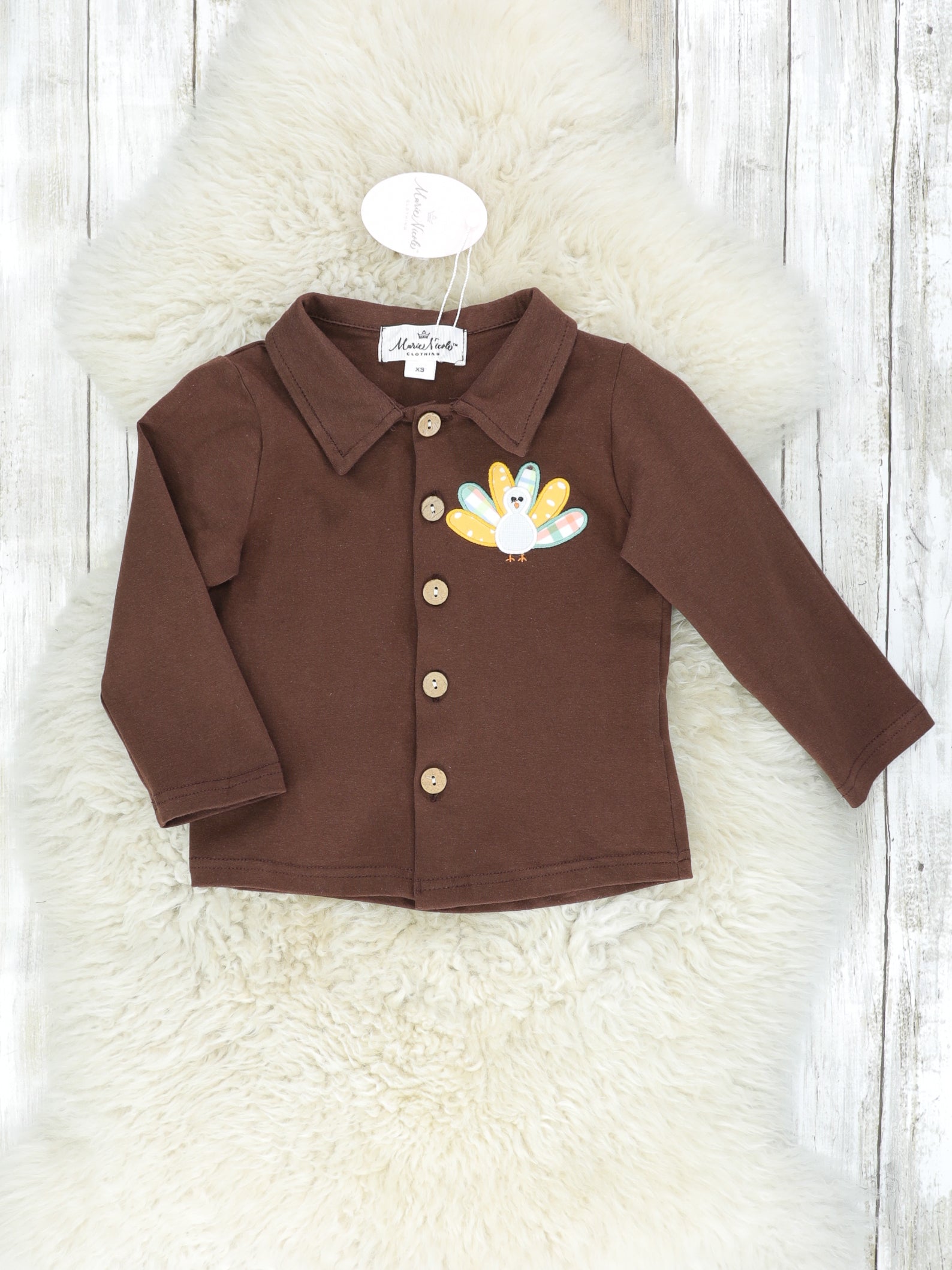 Gobble-gobble! This sibling set has something for all the turkeys of your flock! This button up features a turkey appliqué & functional buttons.
