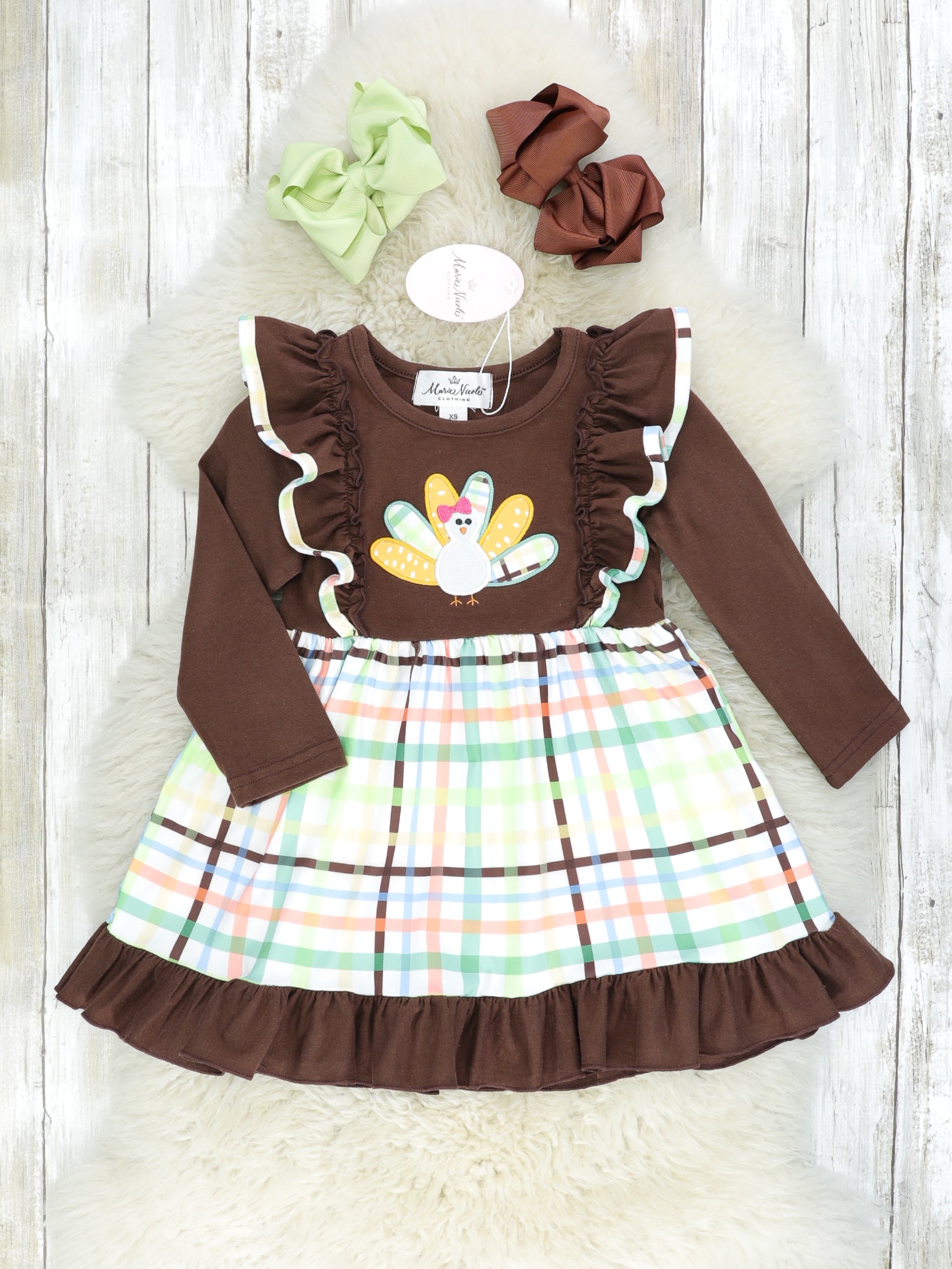 Gobble-gobble! This sibling set has something for all the turkeys of your flock! This dress features a turkey appliqué, flutter trim, ruffle details, & a green plaid dress skirt.