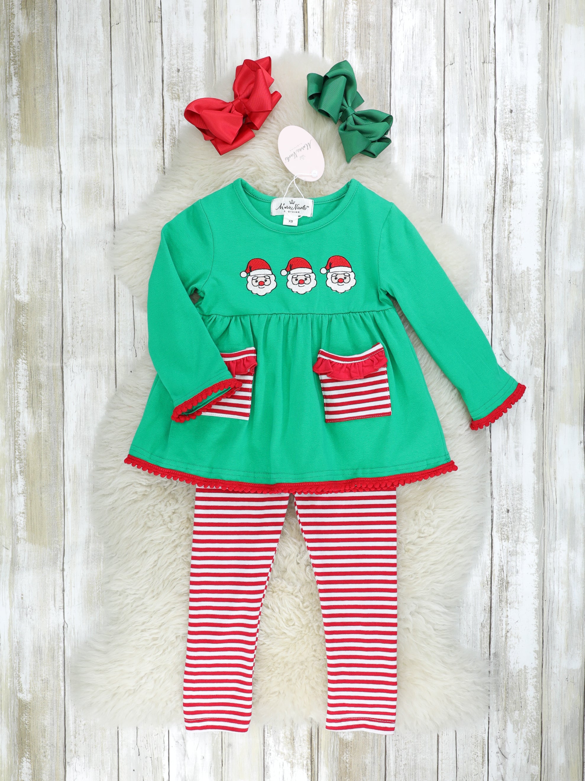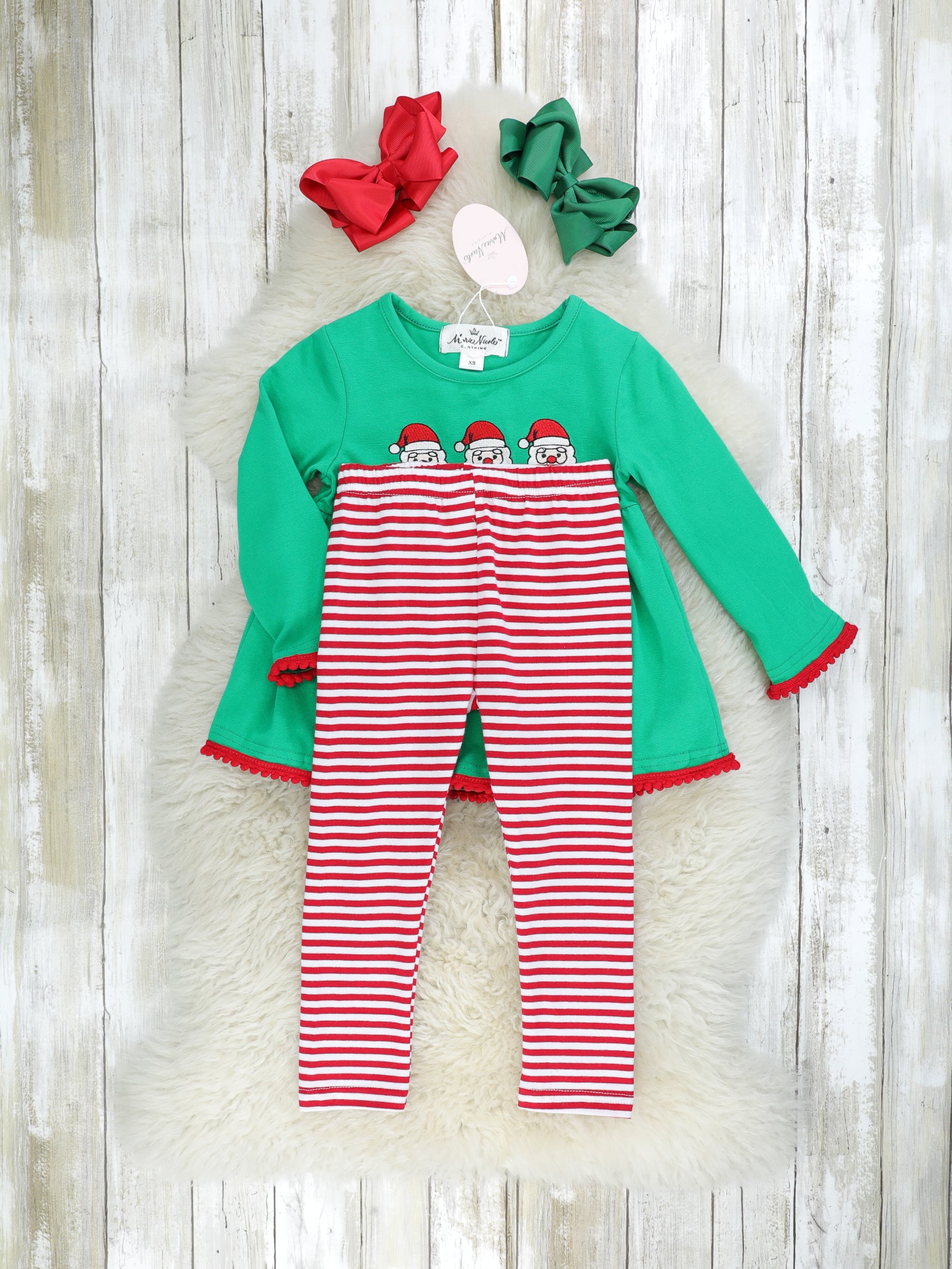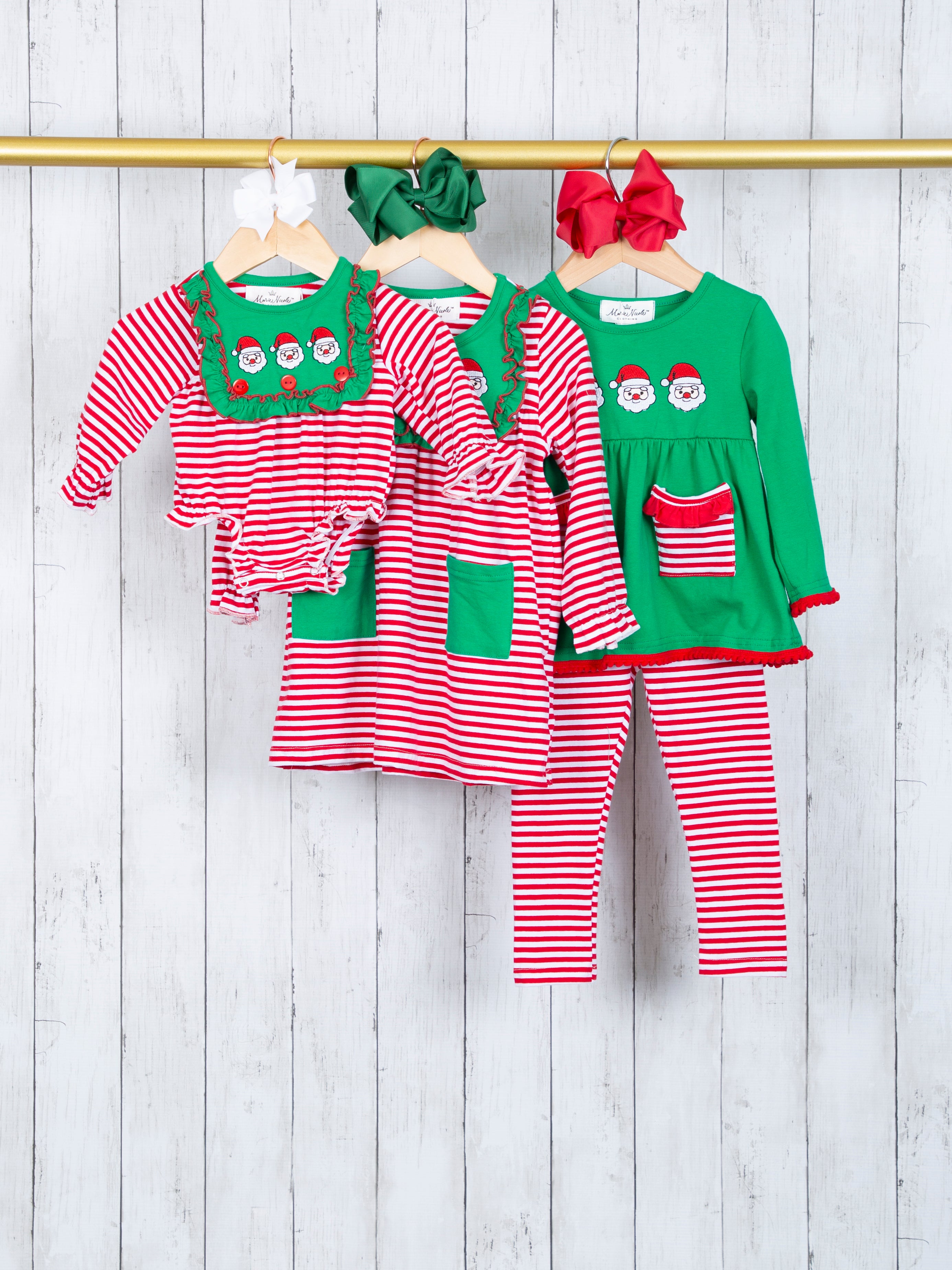 Sleigh, what? This darling set is perfect for all your little Elves! This outfit features a green top with embroidered Santas, pockets, red trim, & striped leggings with an elastic waistband.