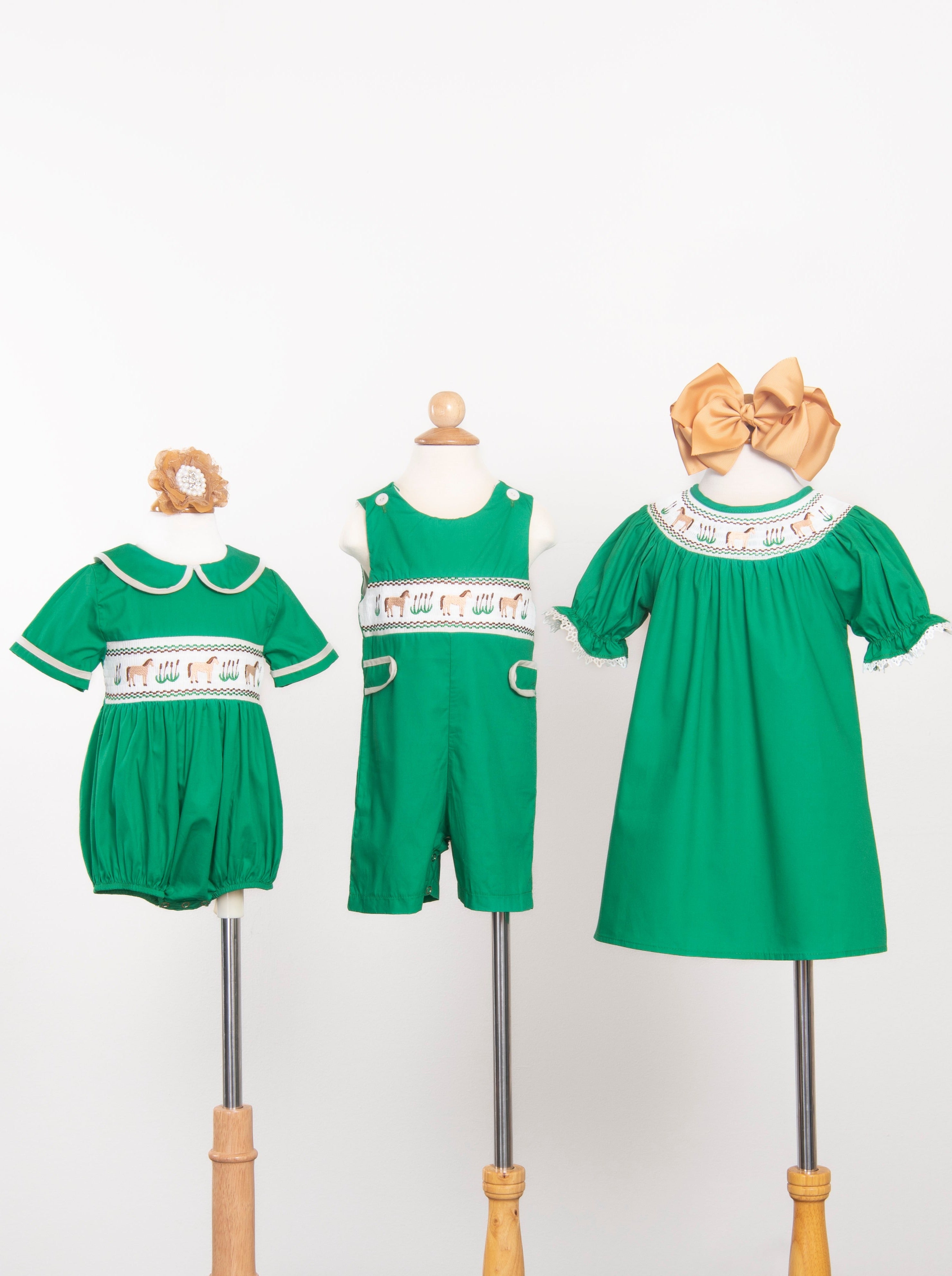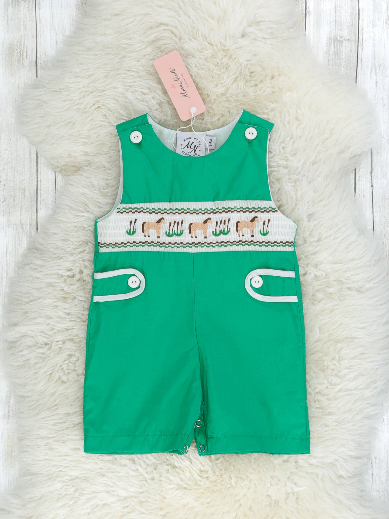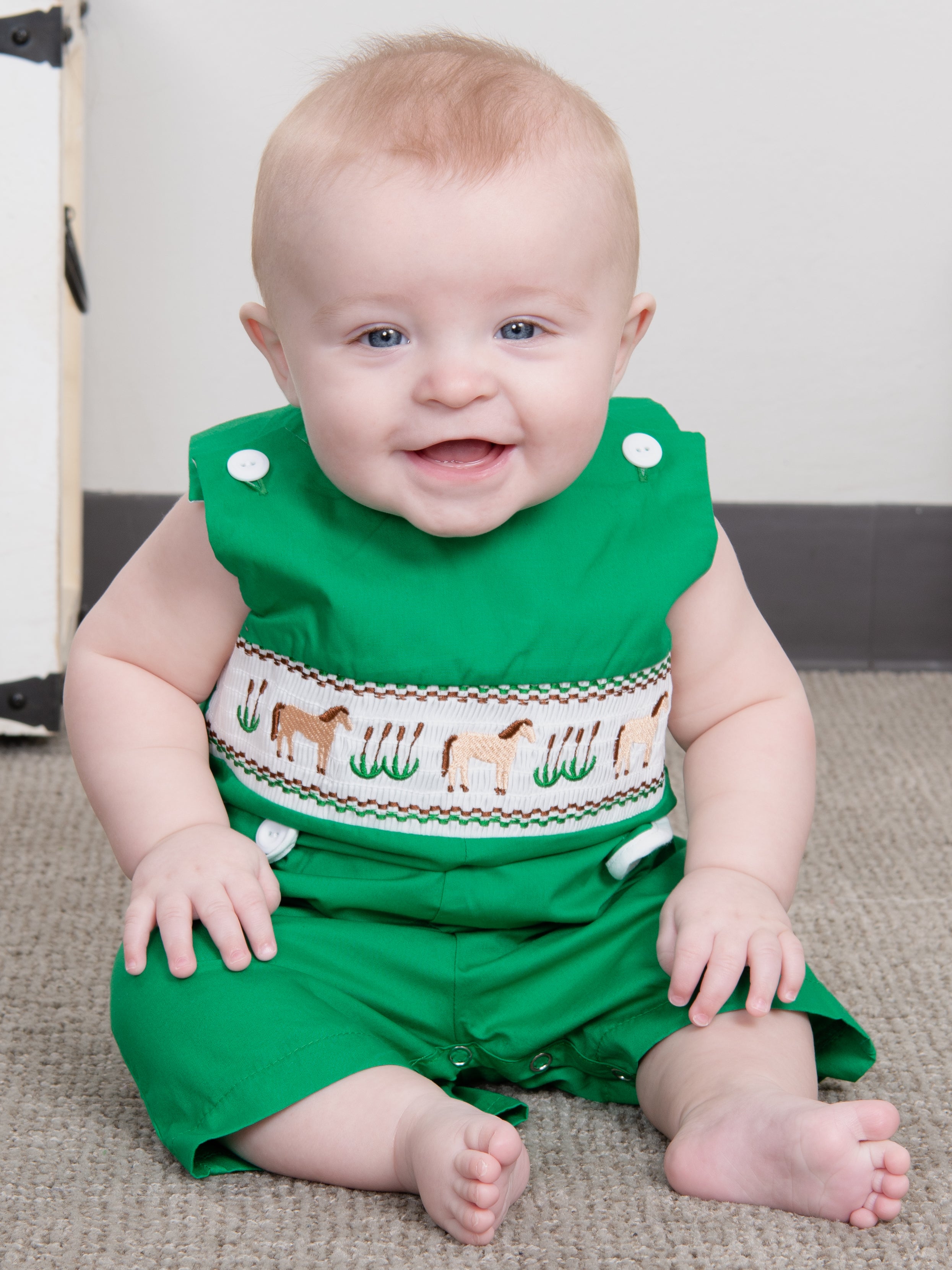 We weren't horsing around with this special sibling set! This green johnny features smocking, embroidered horses, & functioning buttons on the straps for easy changing.