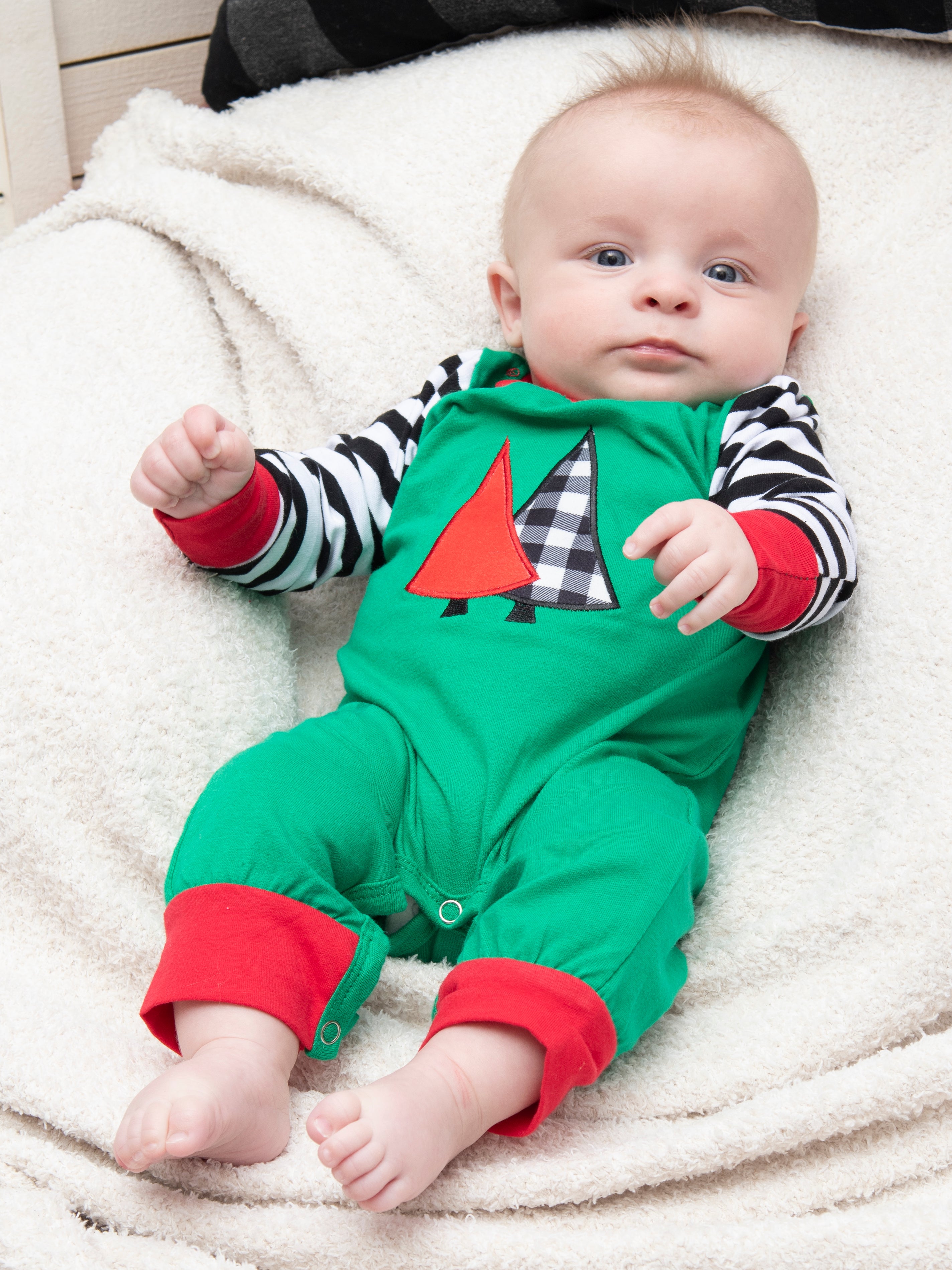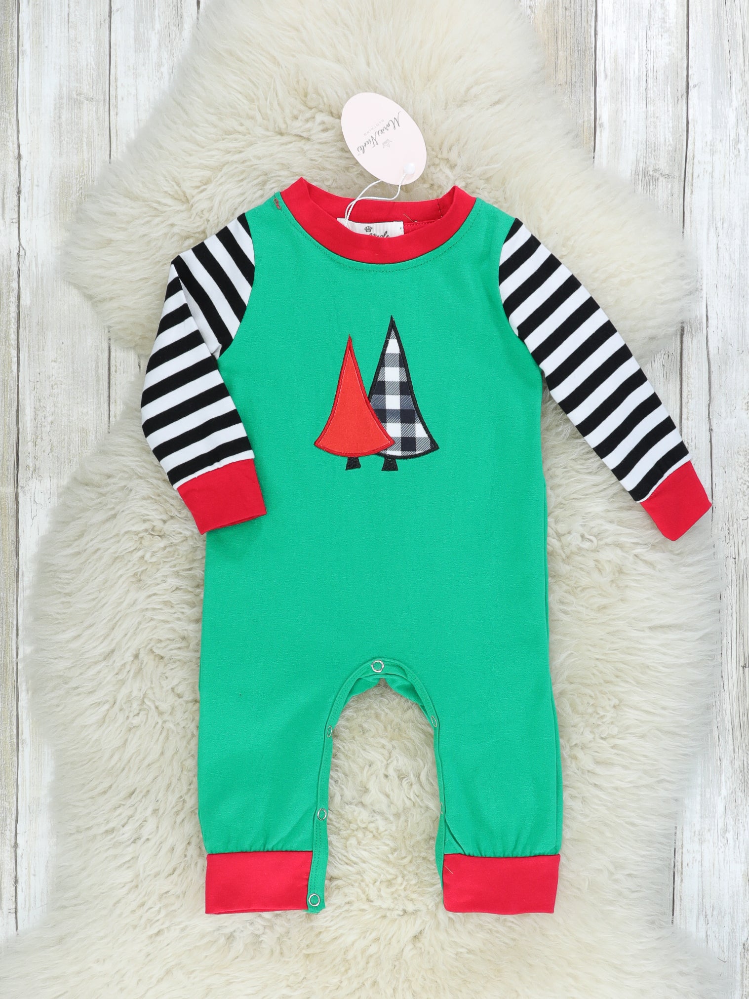 This beautiful romper is FIRtastic for the holiday season! This green romper features striped raglan sleeves, a Christmas tree appliqué, & red trim.