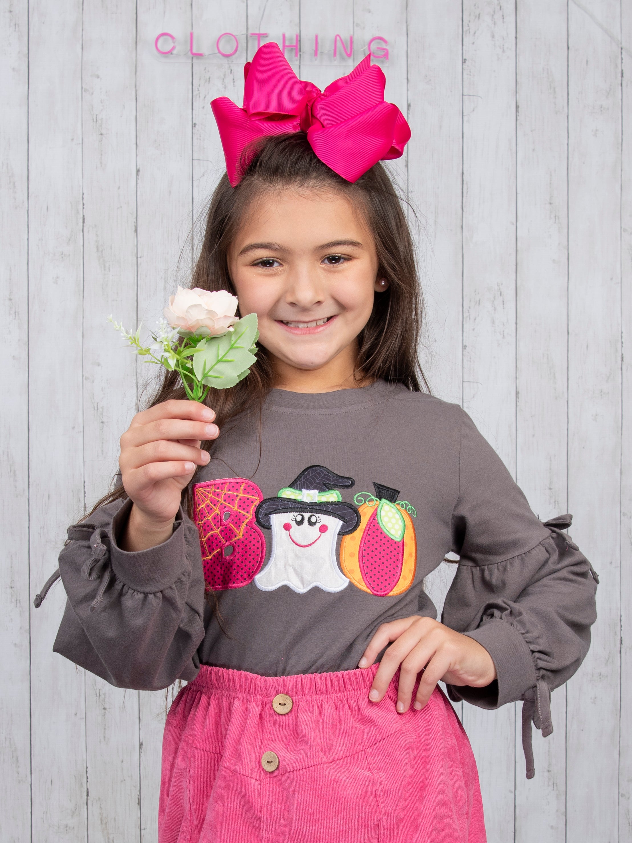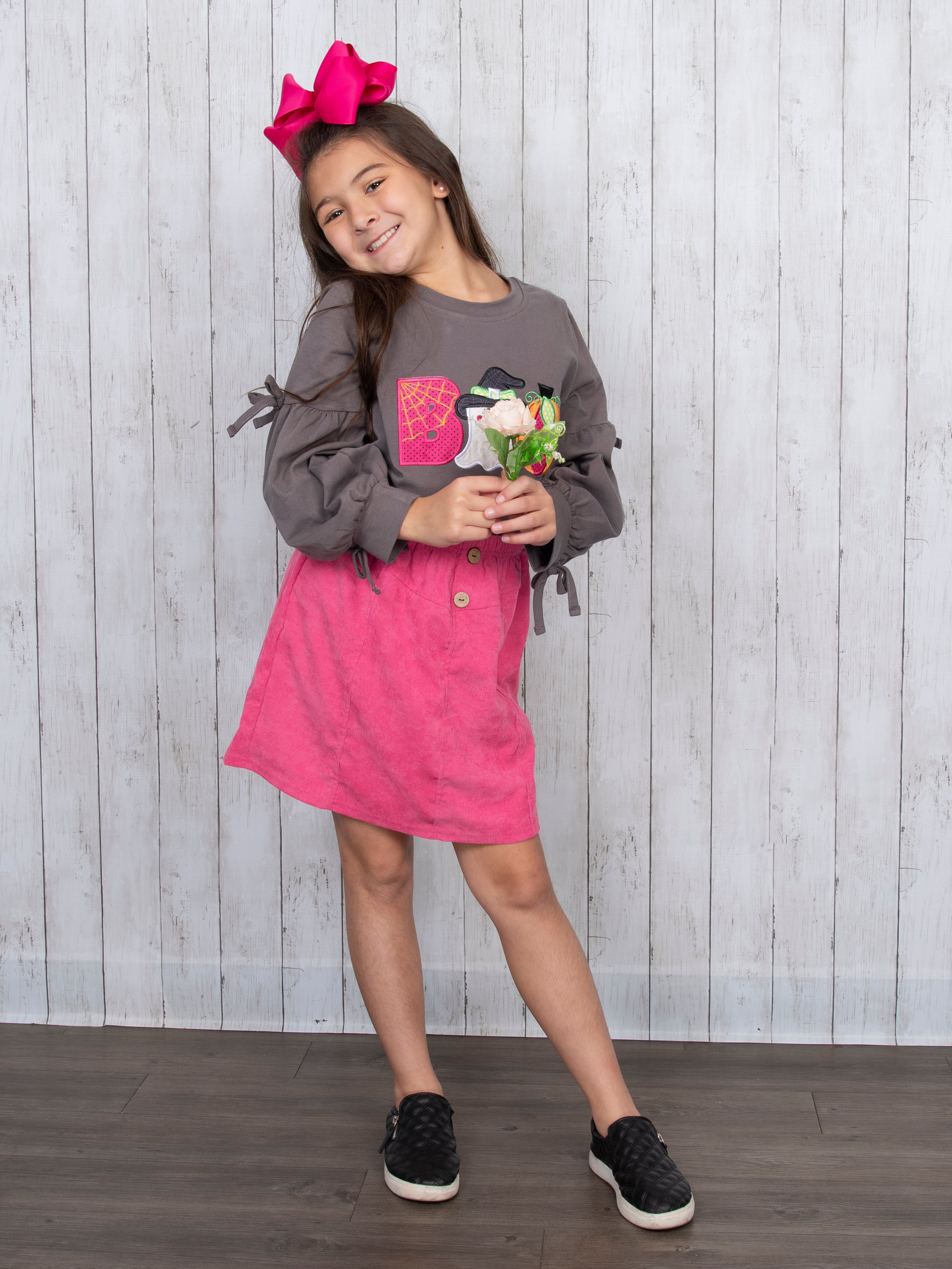 Grey "BOO" Long Sleeve & Fuchsia Skirt Outfit