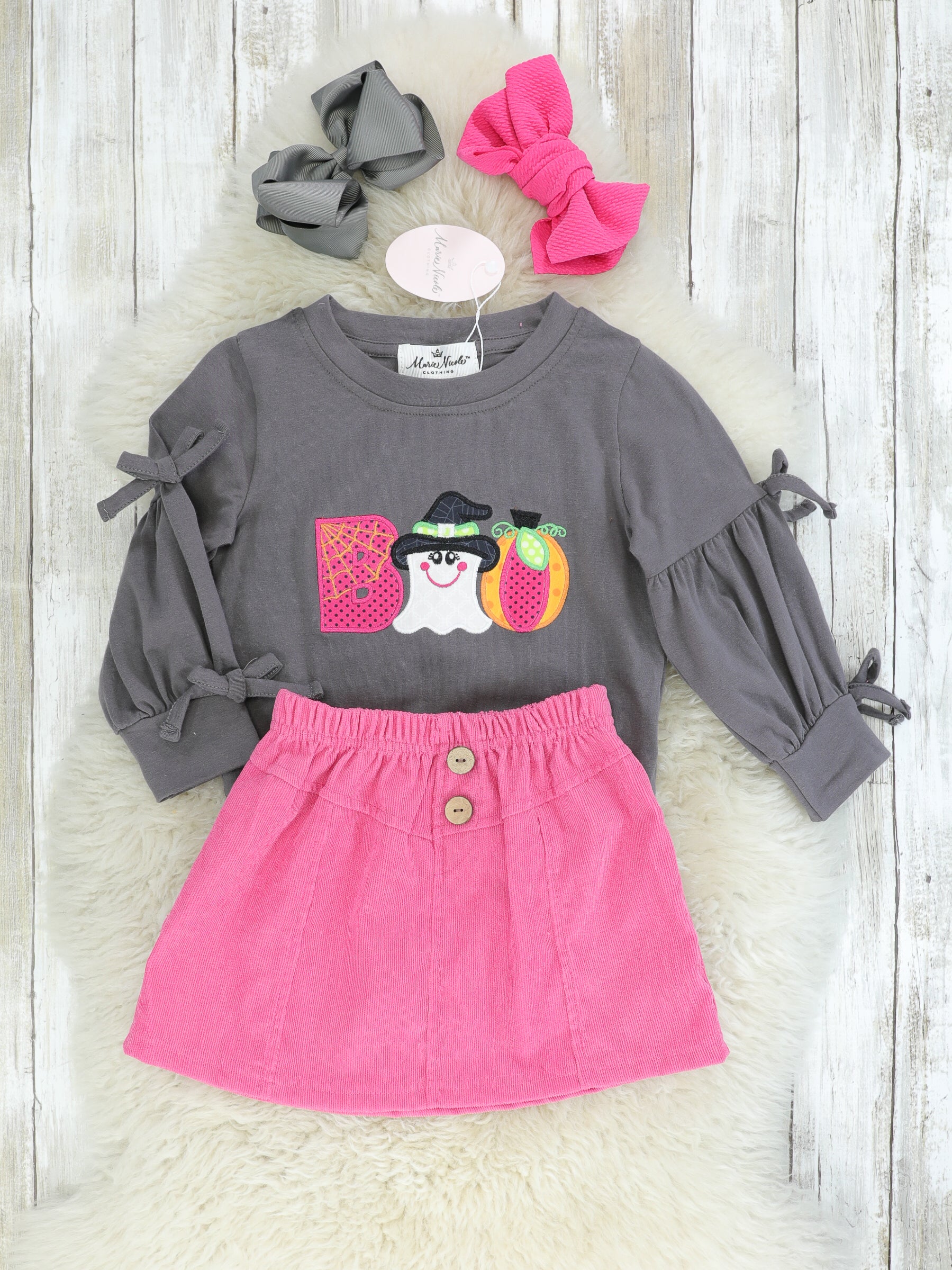 A sassy outfit for your trendsetting BOOs! This outfit features a grey top with a "BOO" appliqué & tie details on the sleeves. The fuchsia skirt has an elastic waistband & decorative buttons.