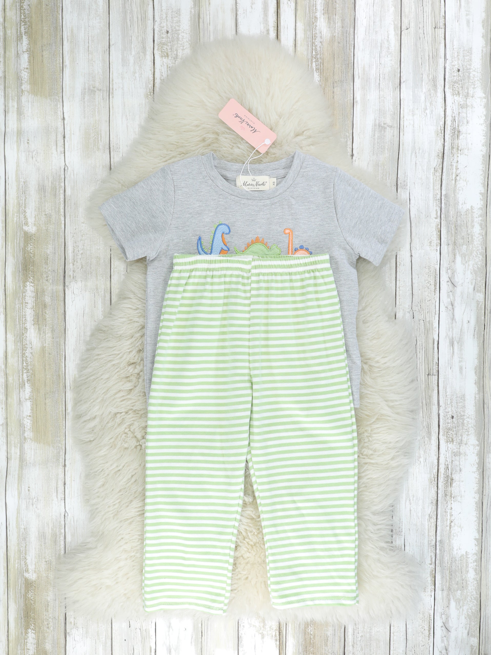 This darling sibling set will make all your kiddos hearts SAUR! This outfit features a grey top with the sweetest dinosaur appliqués & green striped pants.