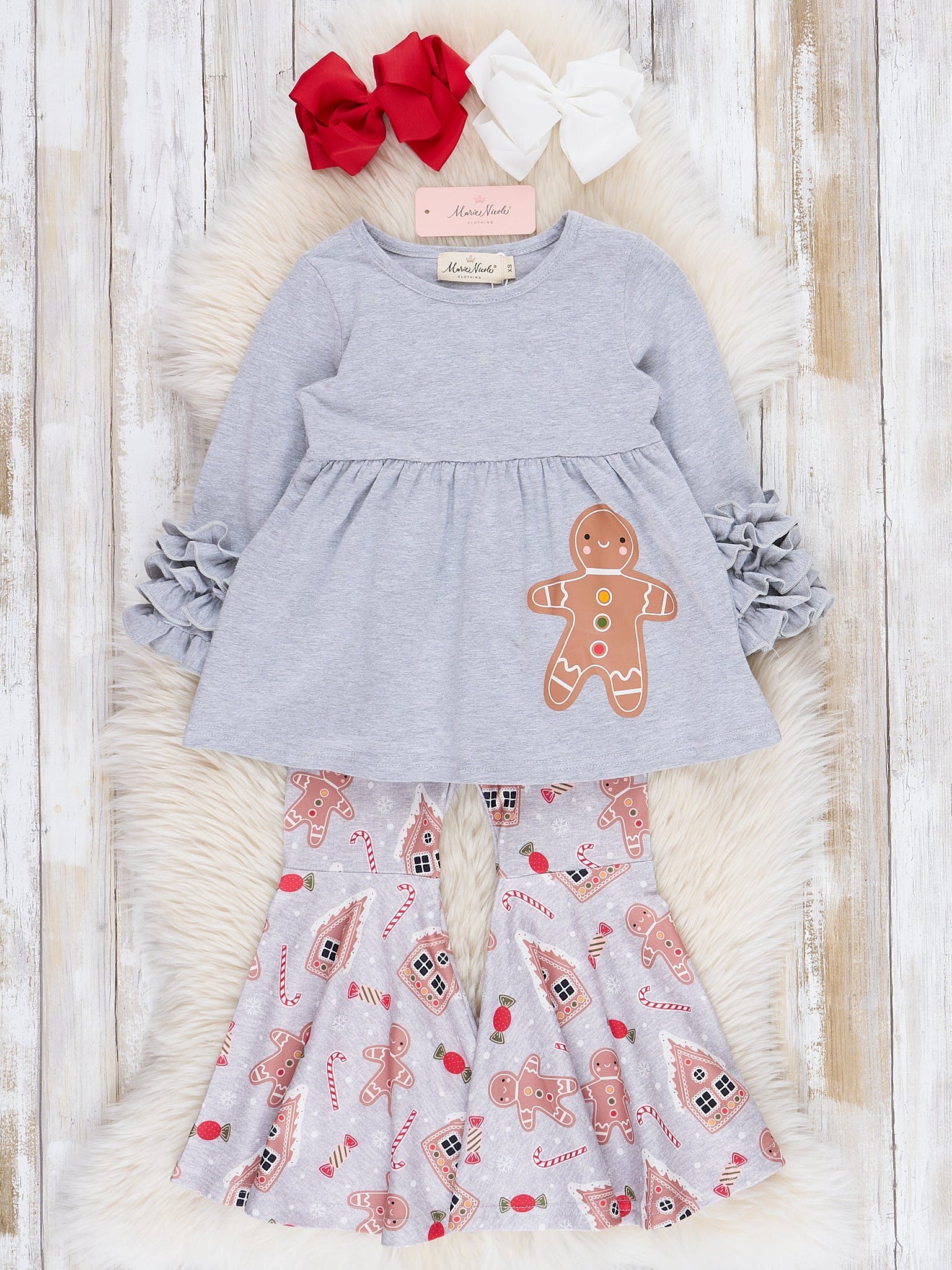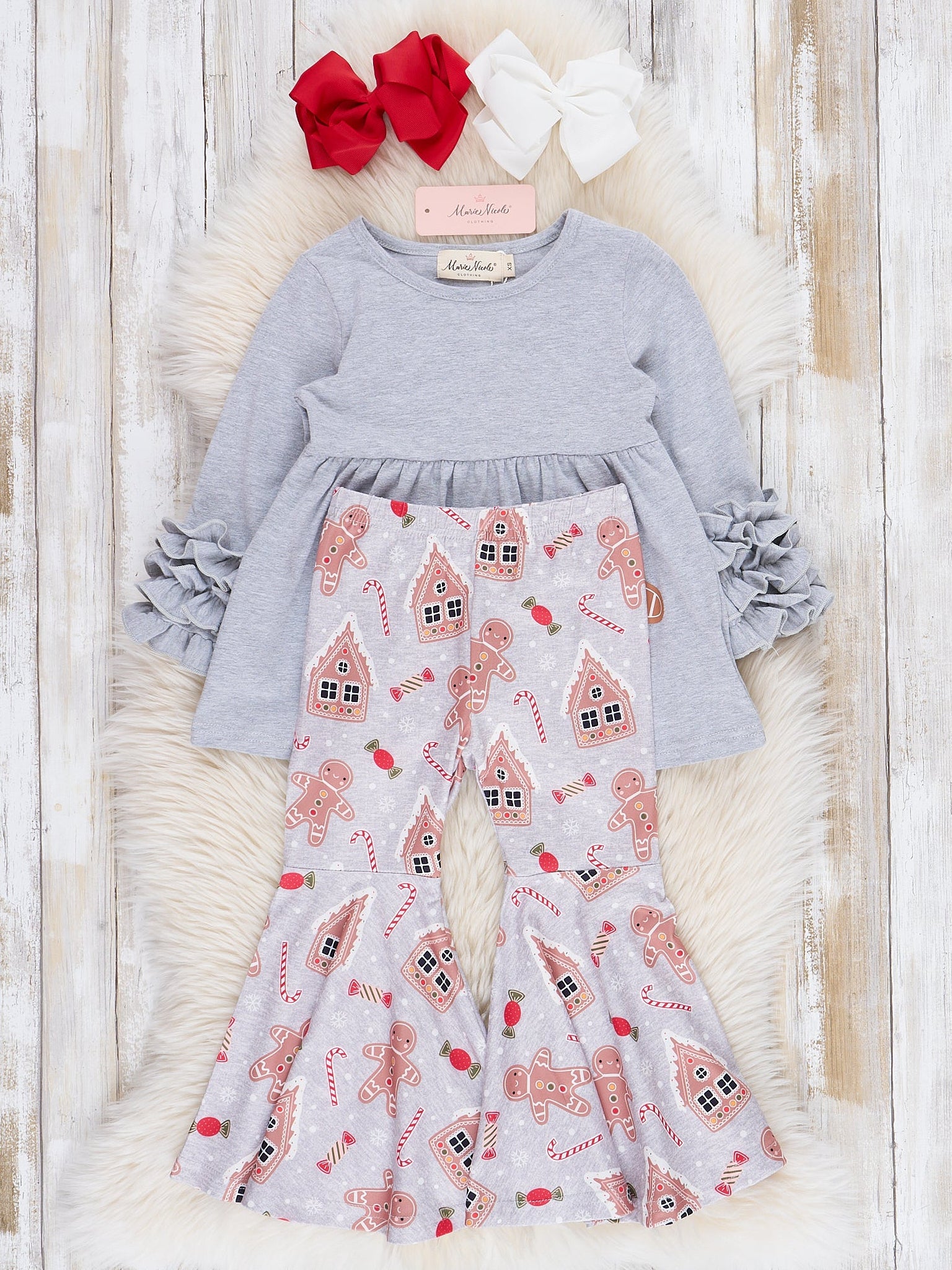 Your little cookie monsters will go crazy for this sister set! Featuring a grey top with ruffle wrists & an embroidered gingerbread cookie paired with gingerbread print bell bottoms, this outfit is sure to be a new holiday fave!