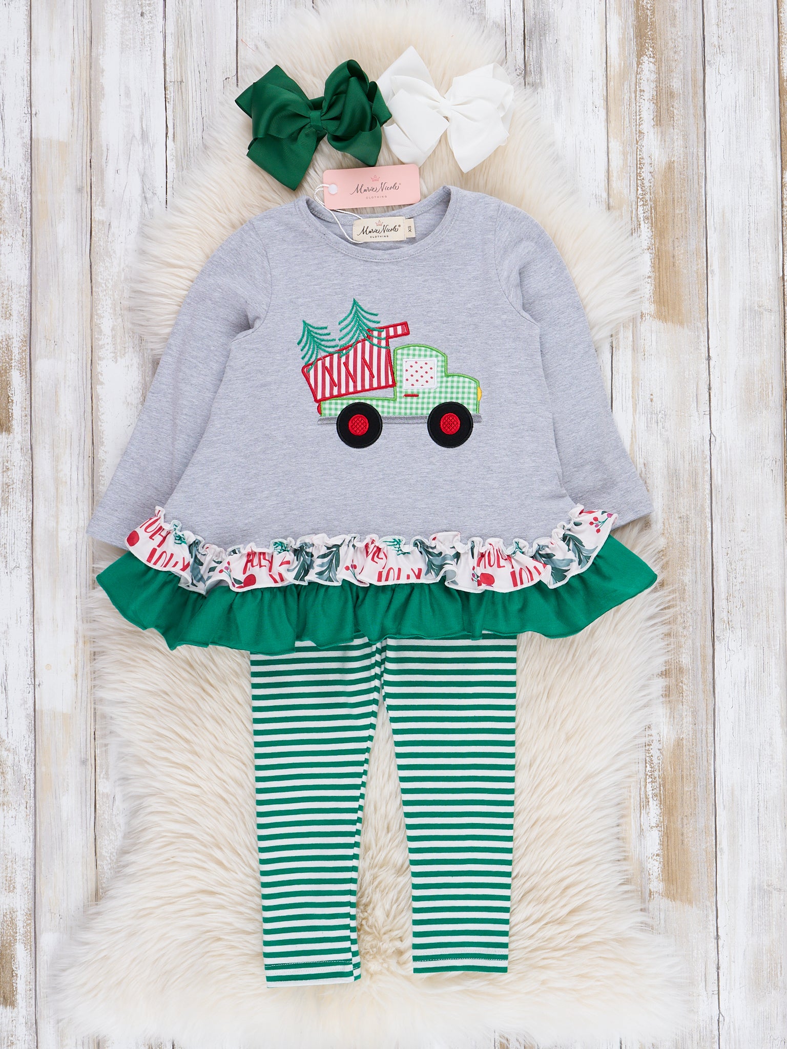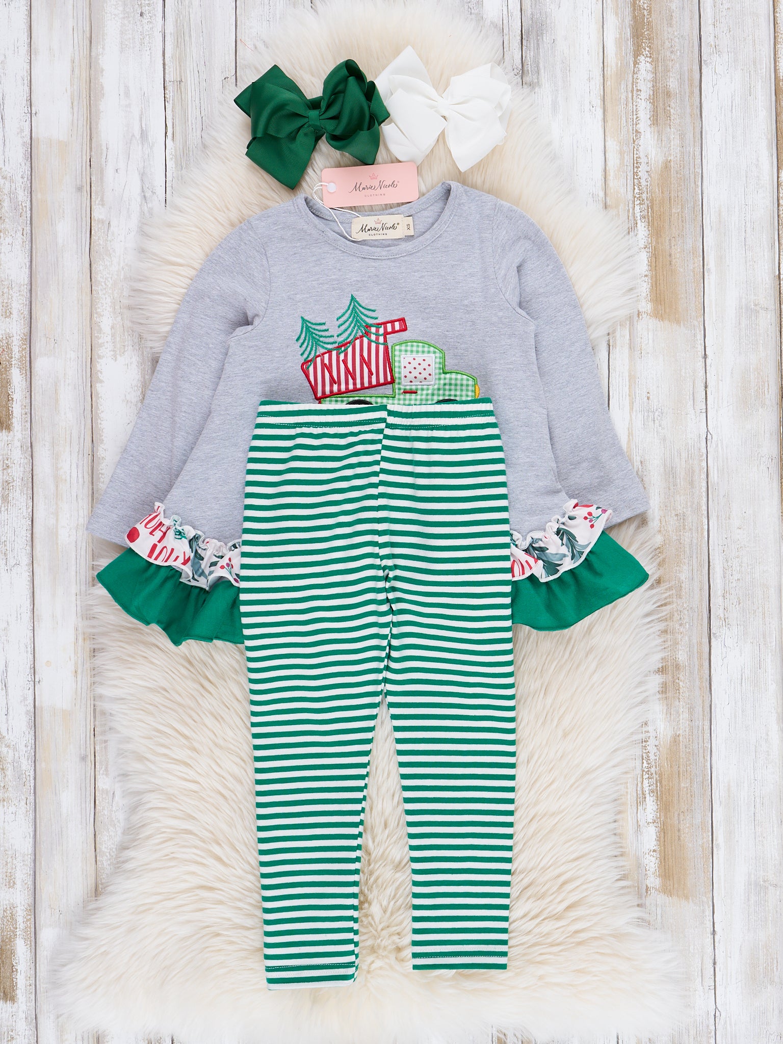 This Grey & Green Striped Evergreen sibling set is perfect for your littles to rock over the holidays. With its festive green stripe leggings and embroidered Christmas tree, it's both stylish and comfortable. This outfit is sure to set off those holiday pics in style, no matter who's wearing it!