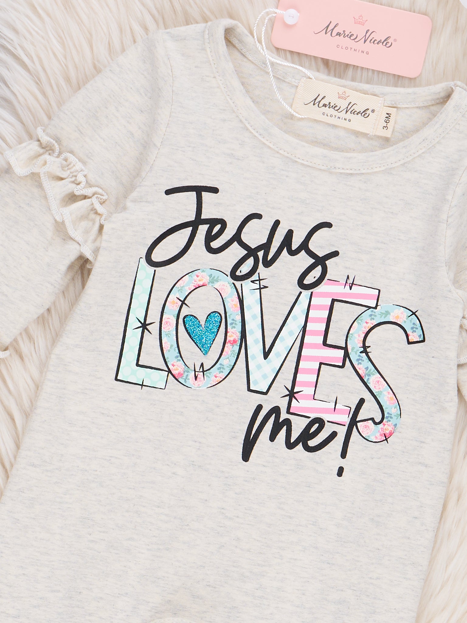 This sister set will have your little ones dressed up and feeling adorably divine! The grey ruffle romper features a sweet "Jesus Loves Me" graphic and pairs perfectly with the ankle ruffles and bows. Perfect for Sunday morning church service and beyond!