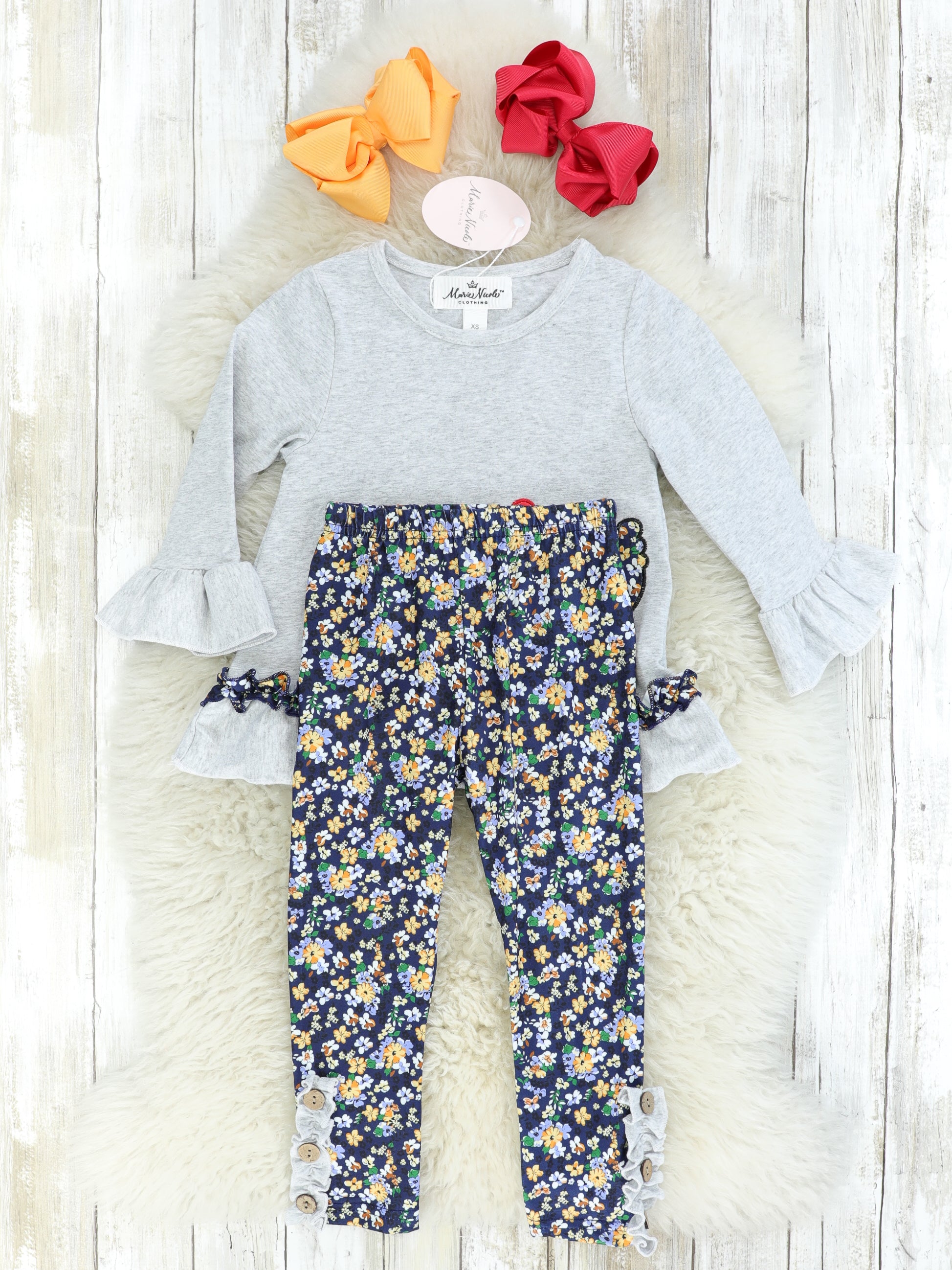 A fabulous sister set for your chicks! This outfit features a grey long sleeve shirt with a floral chicken appliqué, ruffle trim, & ruffle sleeves. The matching floral leggings contain ruffles & decorative buttons.