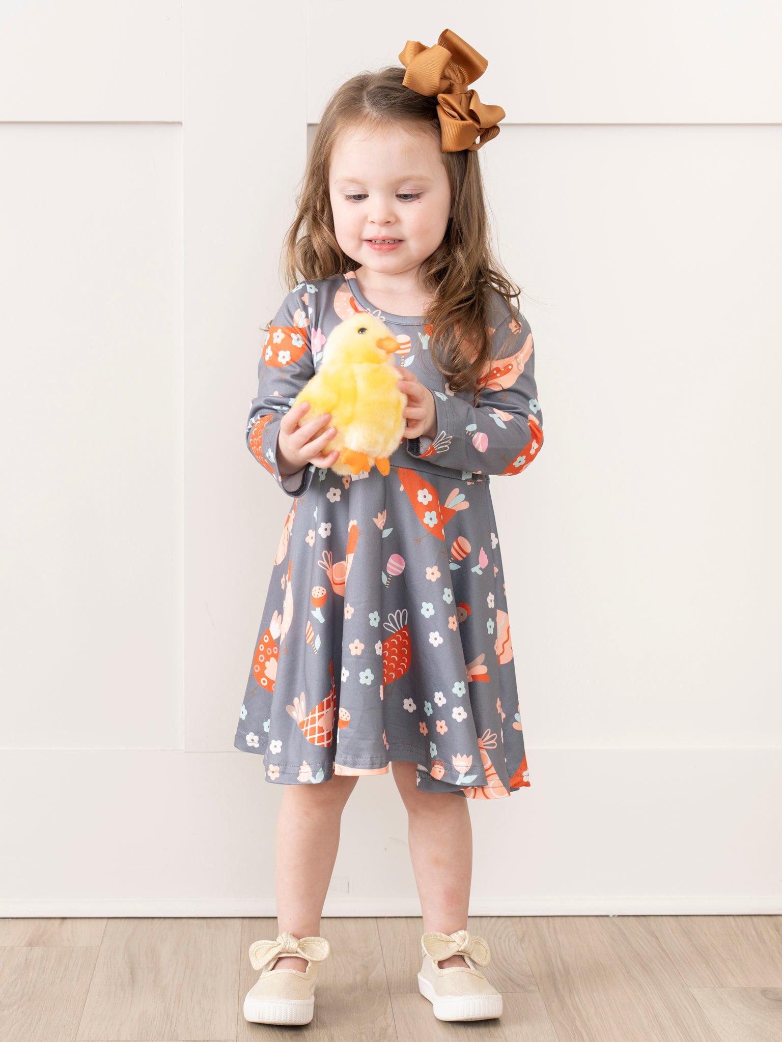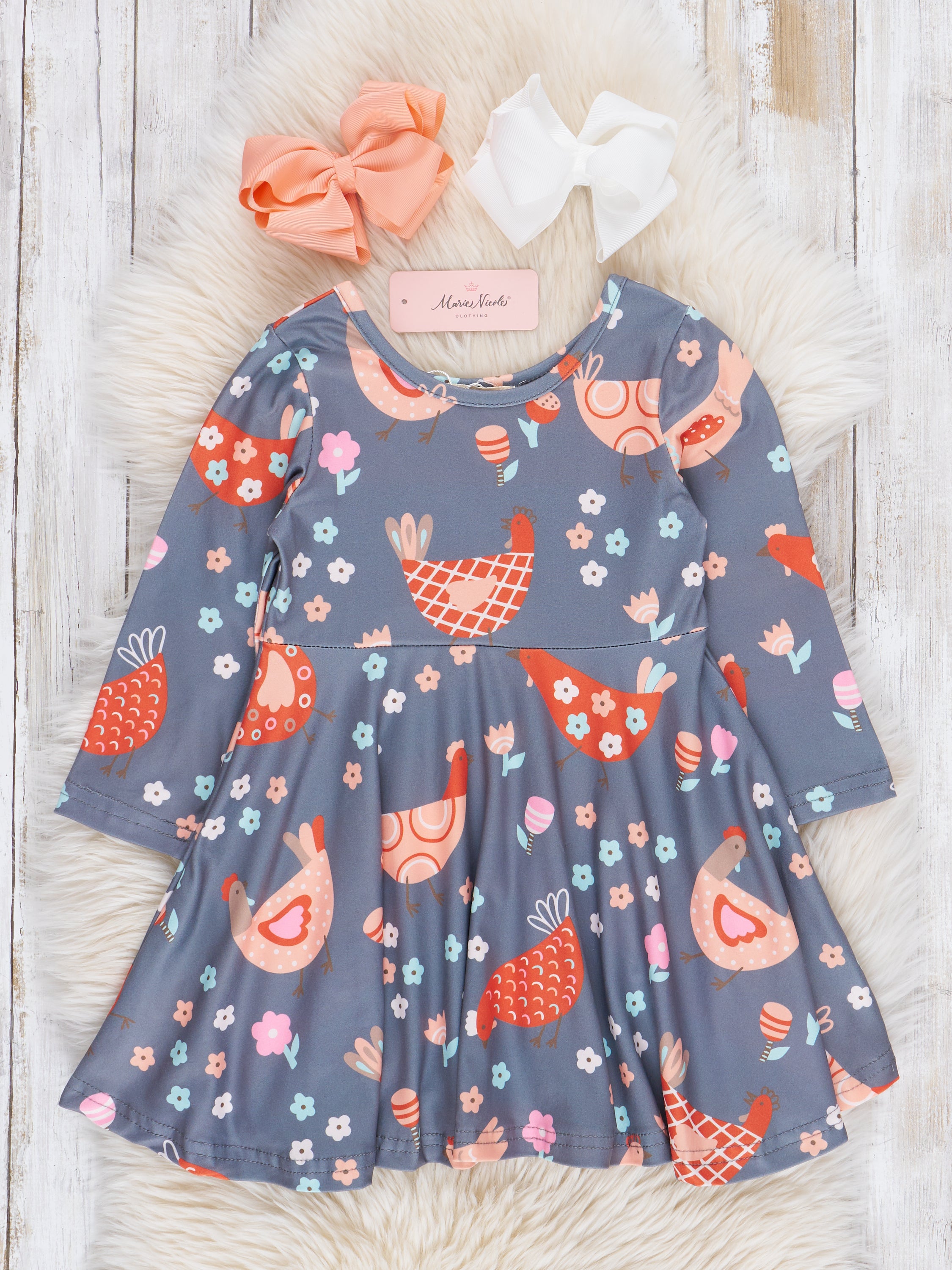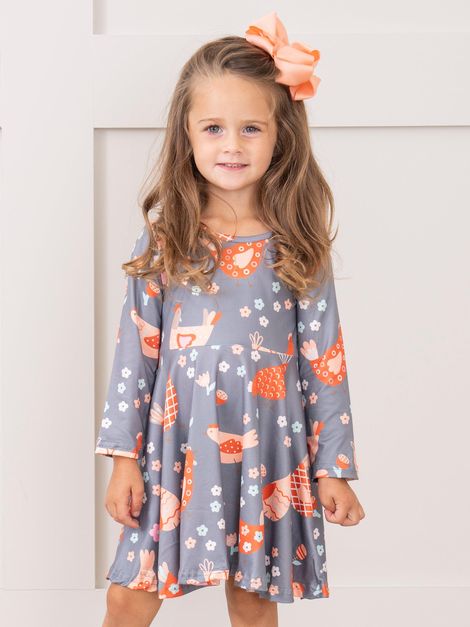 Flap into fun with our Grey & Orange Chickens Swing Dress! This girls dress features a playful print of orange chickens against a grey bodice. The classic swing dress silhouette adds a touch of nostalgia to this quirky and charming piece. Perfect for young fashionistas!