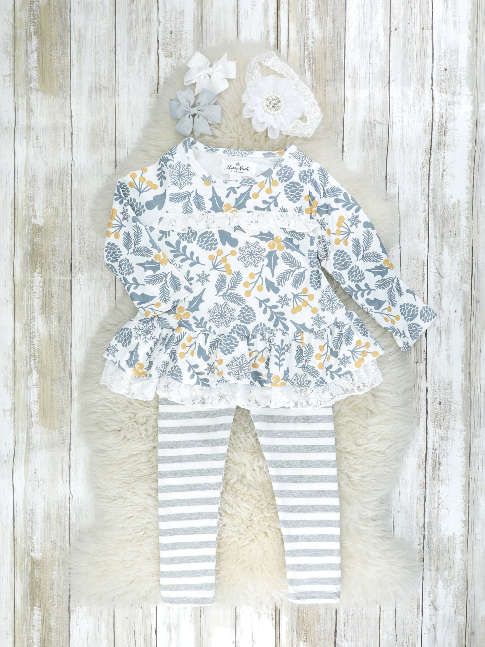 This darling set is perfect for any day! This outfit features a white top with grey pinecone details, lace trim, & striped leggings.