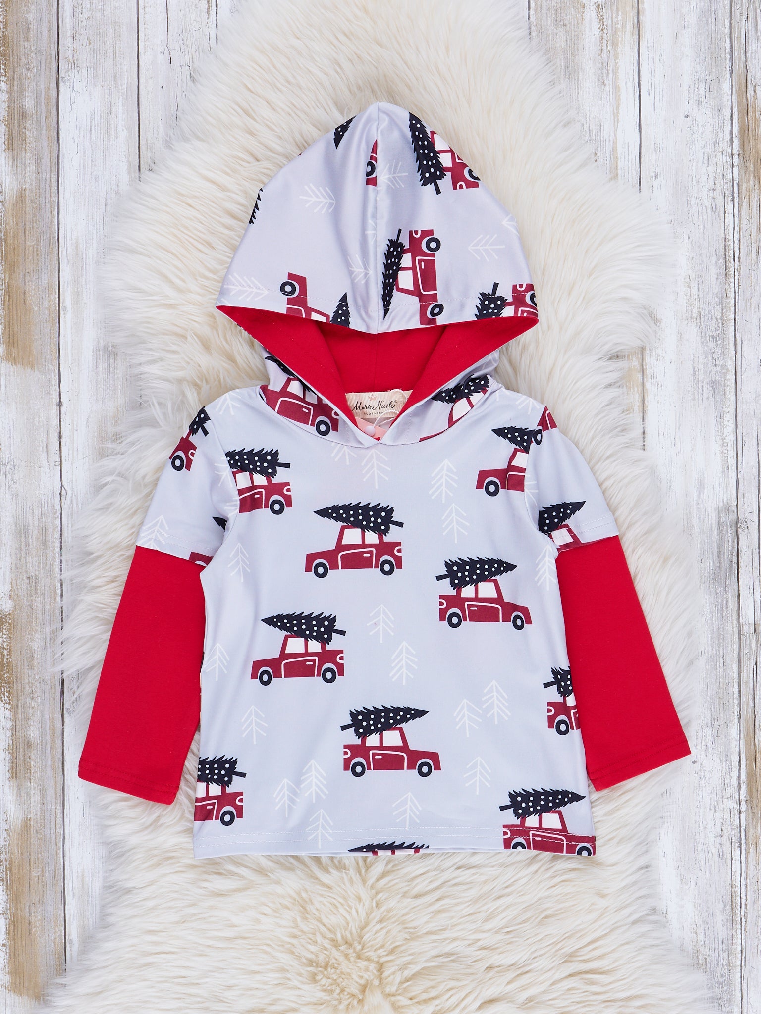 Head to the tree lot with your boys in this brother set. Featuring the softest fabric, hood for warmth, red trim, and the cutest tree pint, your little one will have the best time picking out your Christmas tree in this top!