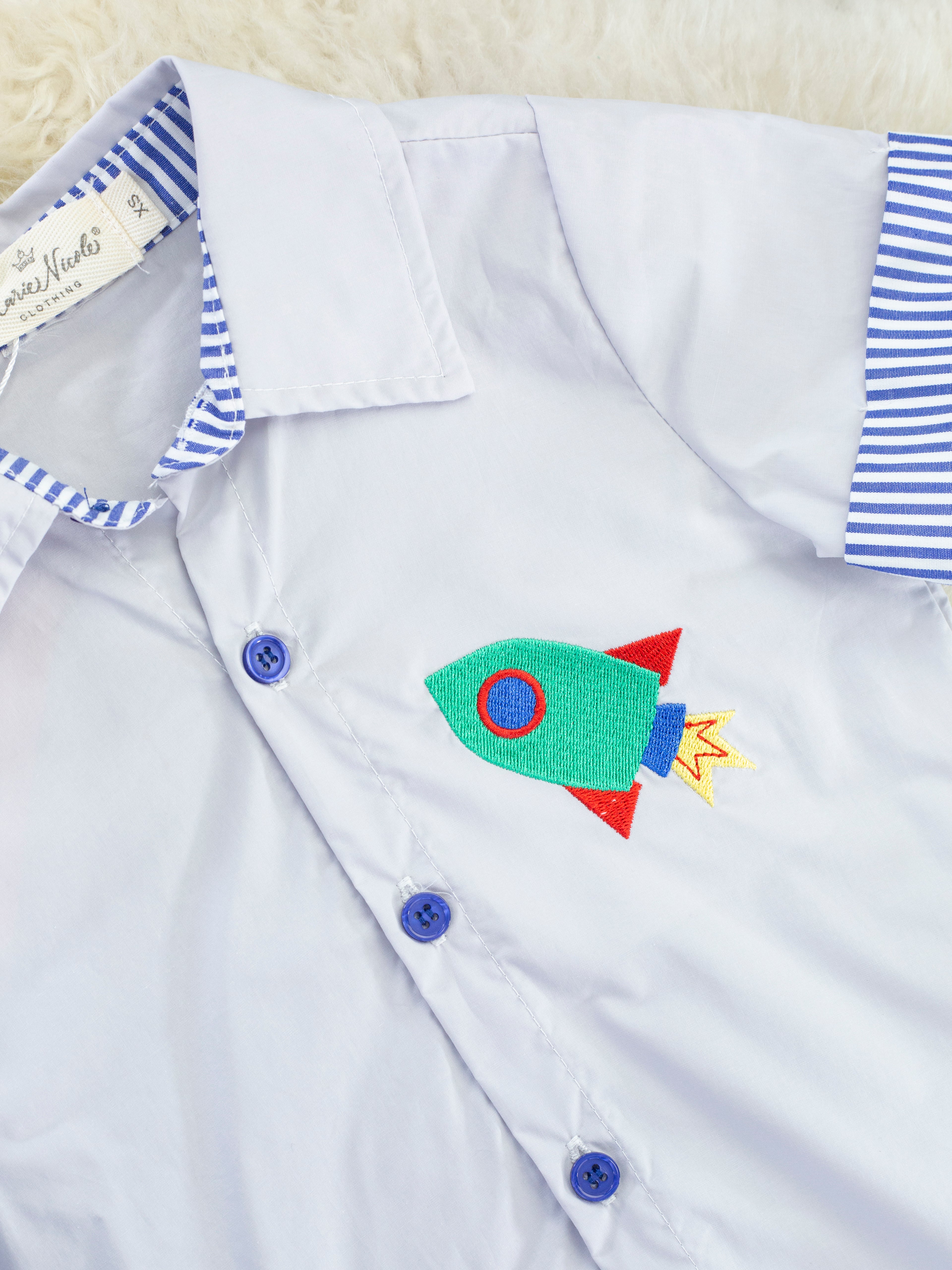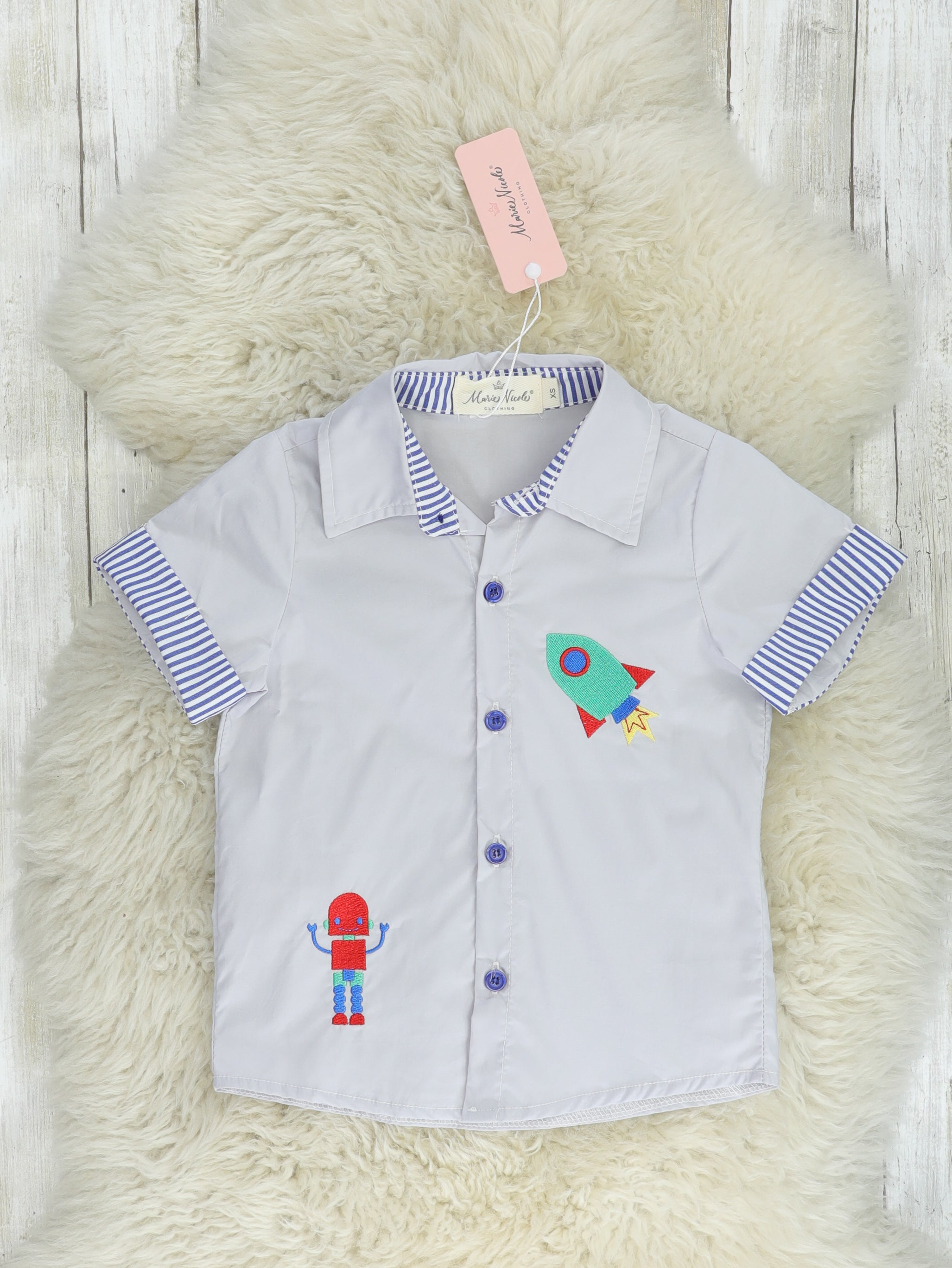 The most adorable set for your roBROS! This grey polo features an adorable robot rocket detail, striped trim, & functioning buttons.