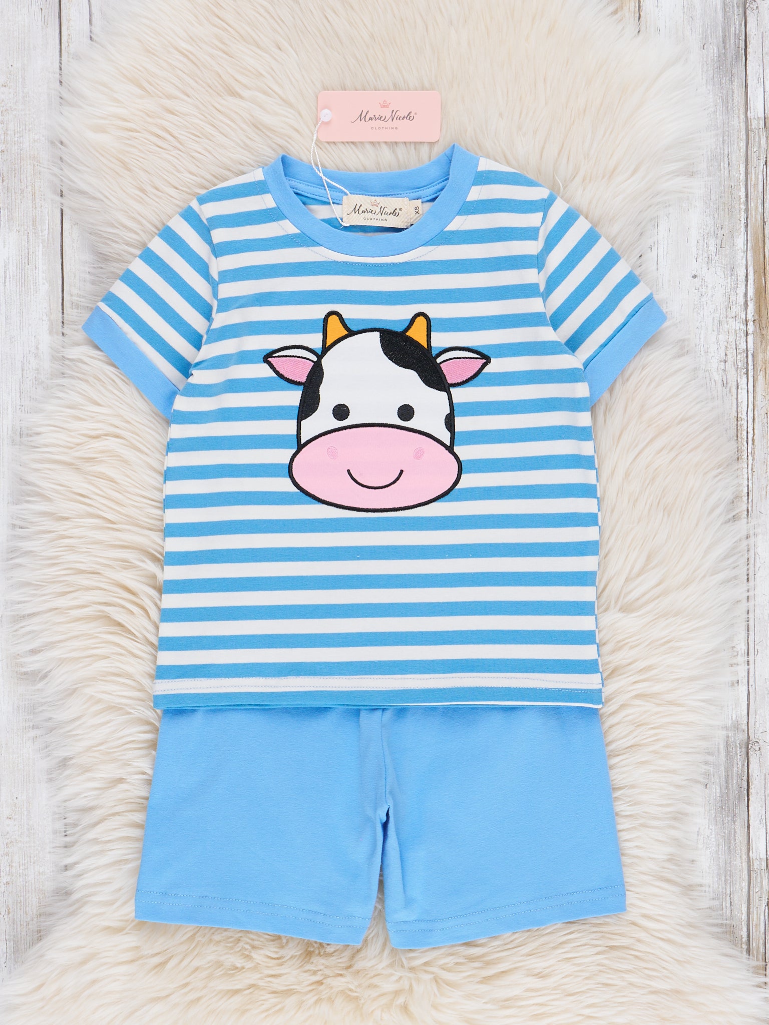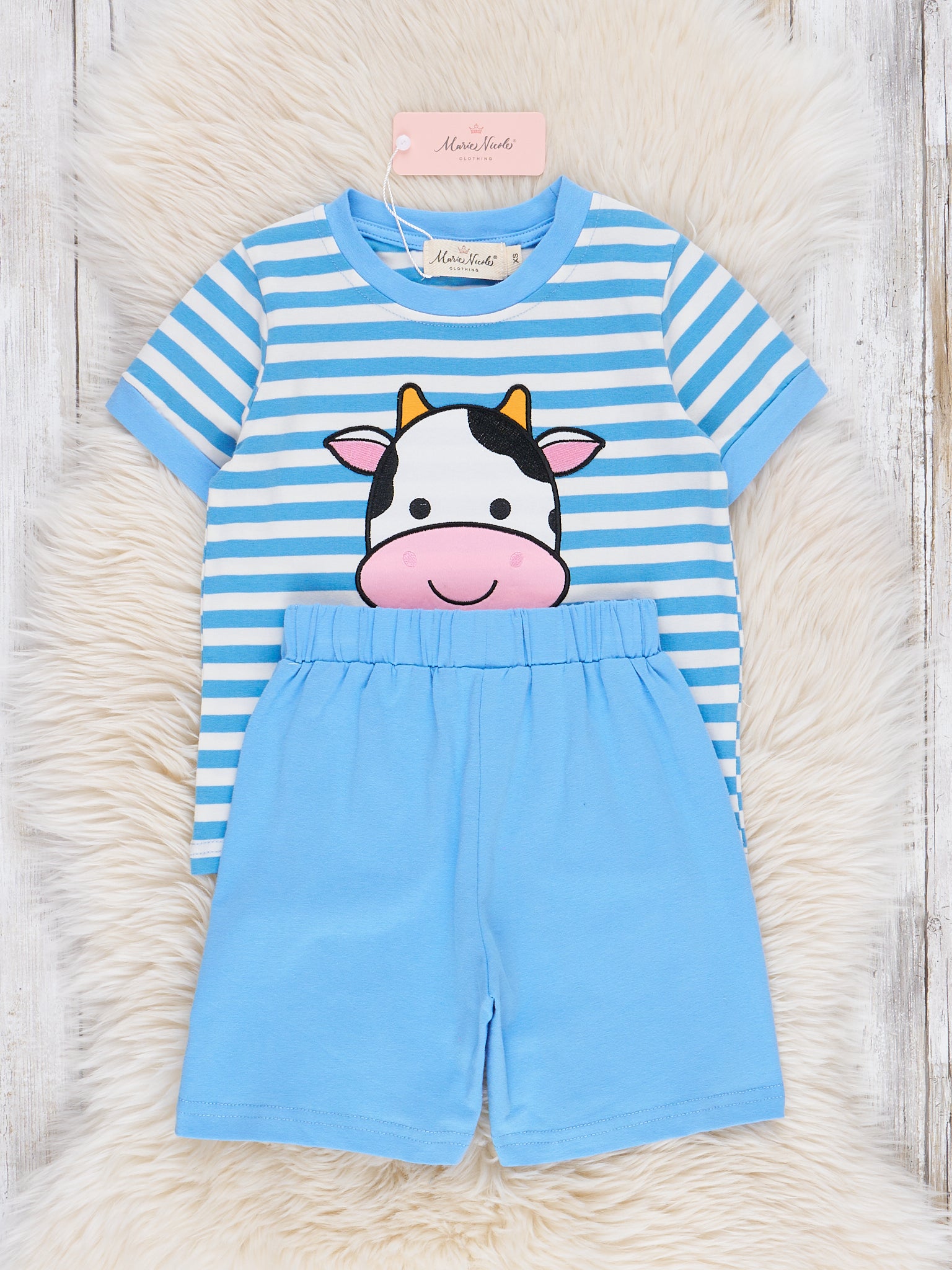 Get your little one ready for a day of fun with our Happy Cow Striped Outfit! This adorable boys outfit features a blue striped top with an embroidered happy cow and ringer trim. The matching blue shorts complete the look & add a playful touch. Part of the adorable Happy Cow sibling set from Marie Nicole Clothing.