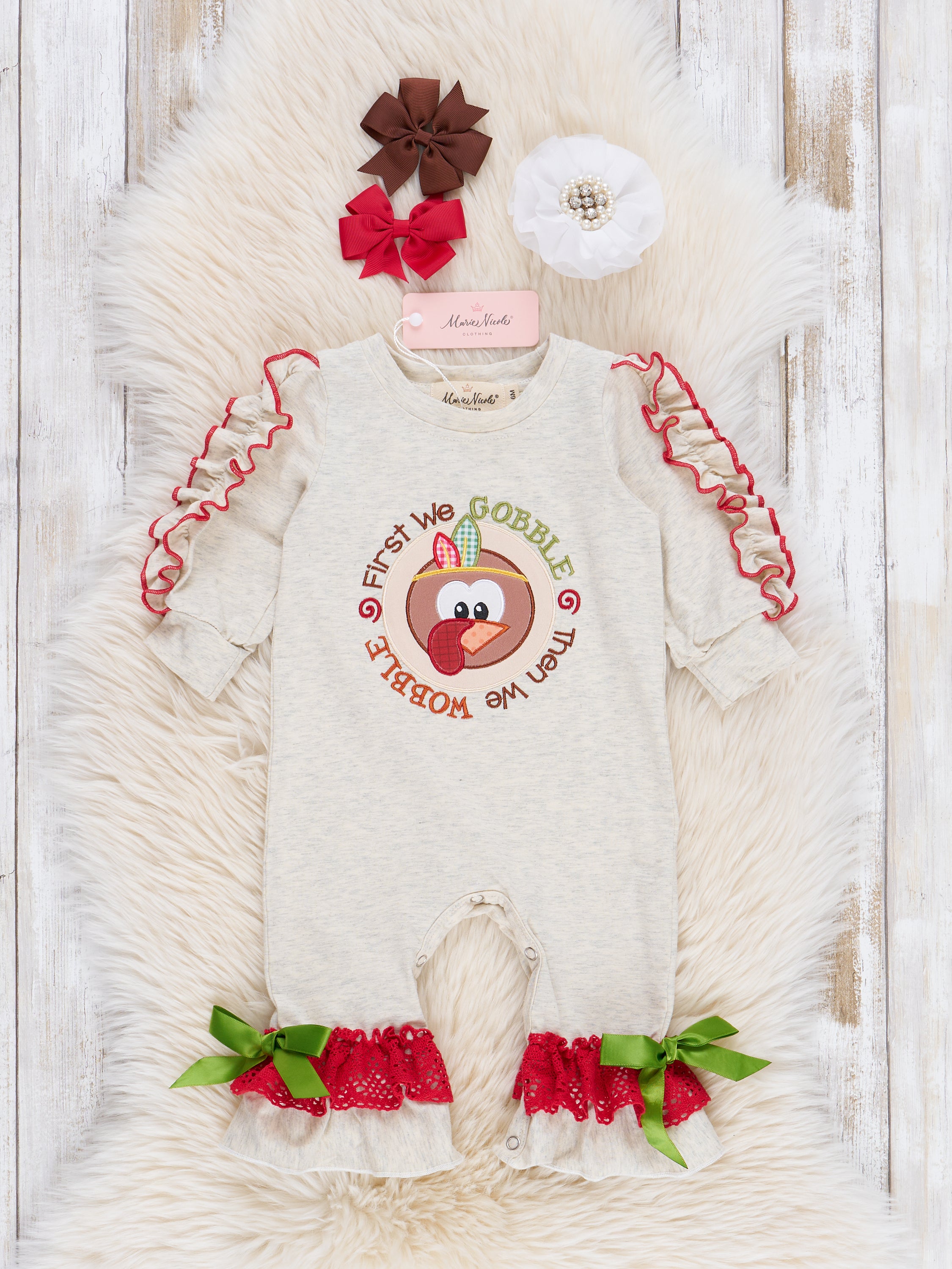 Gather the family for turkey day in style with our Heathered Oatmeal & Red Gobble & Wobble Sister Set! This girls romper features a heathered oatmeal bodice and a red ruffle details, perfect for the Thanksgiving feast. Get ready to gobble and wobble in this adorable outfit!