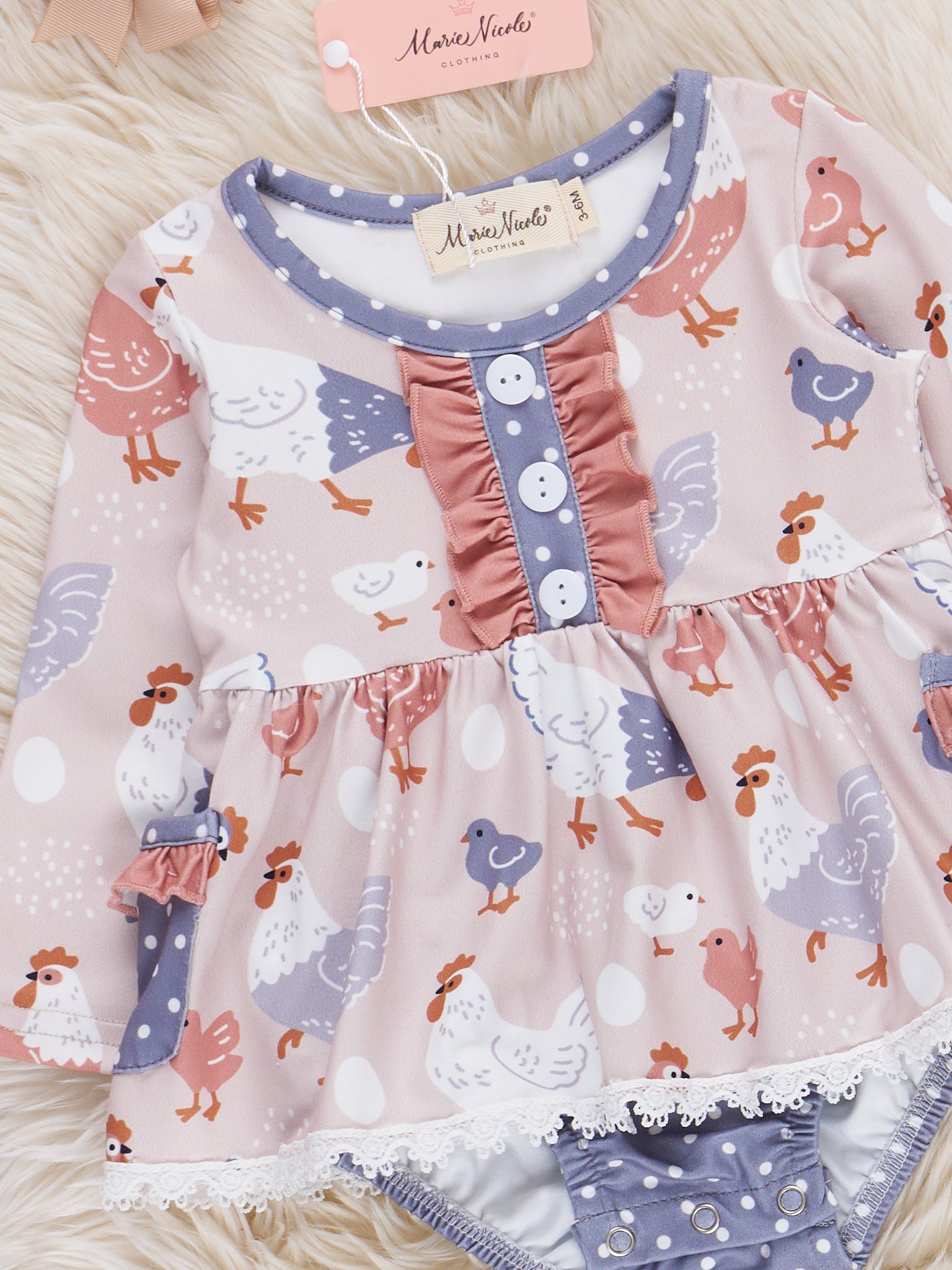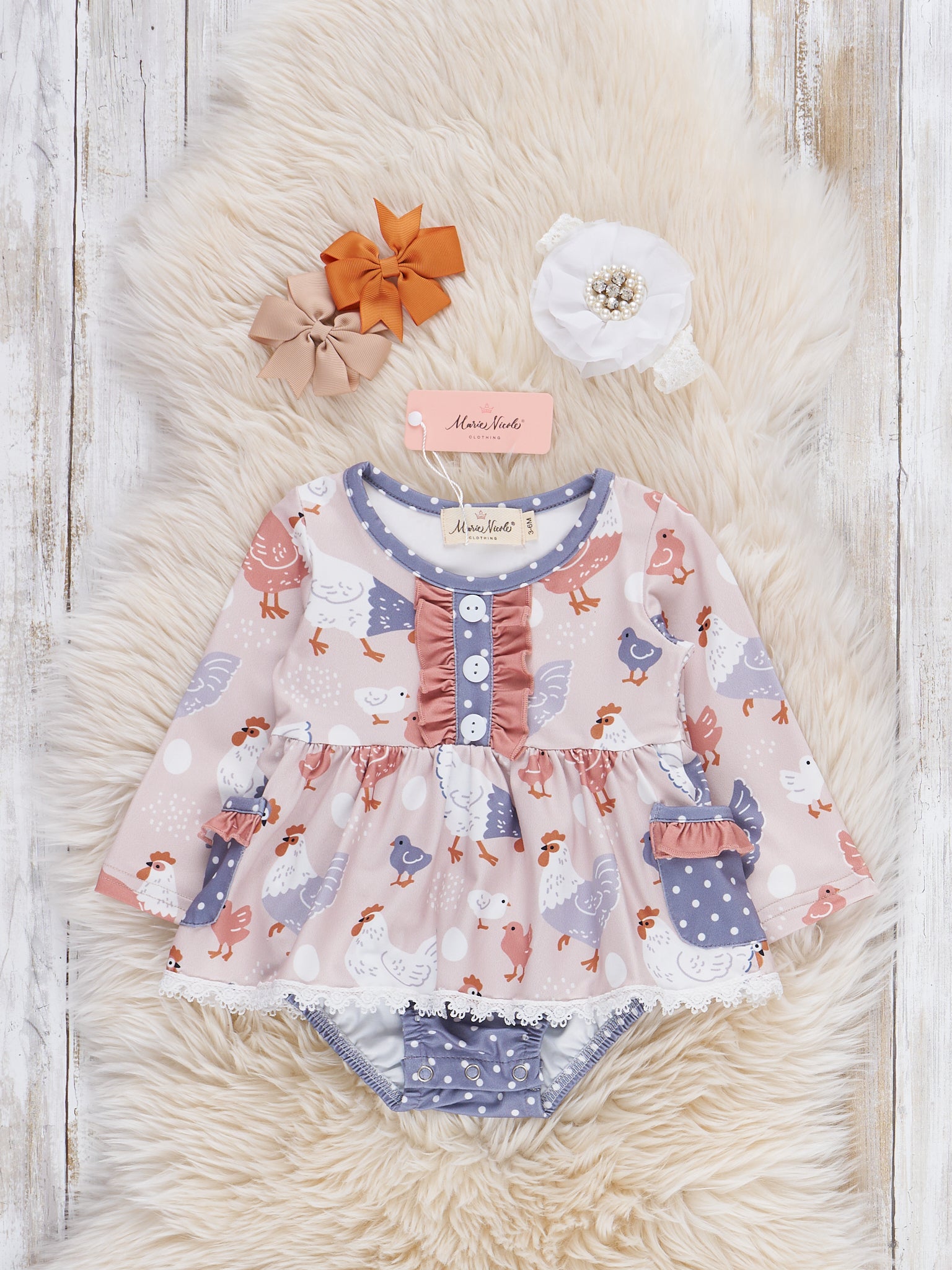 The Henhouse Haven Bubble by Marie Nicole features a charming print of hens, chicks, and eggs on a long sleeve, empire-waist silhouette. With sweet ruffle and pompom trim at the hem, a contrasting button placket, and attached bubble bottoms for easy diaper changes, this playful piece combines comfort and farmhouse style.