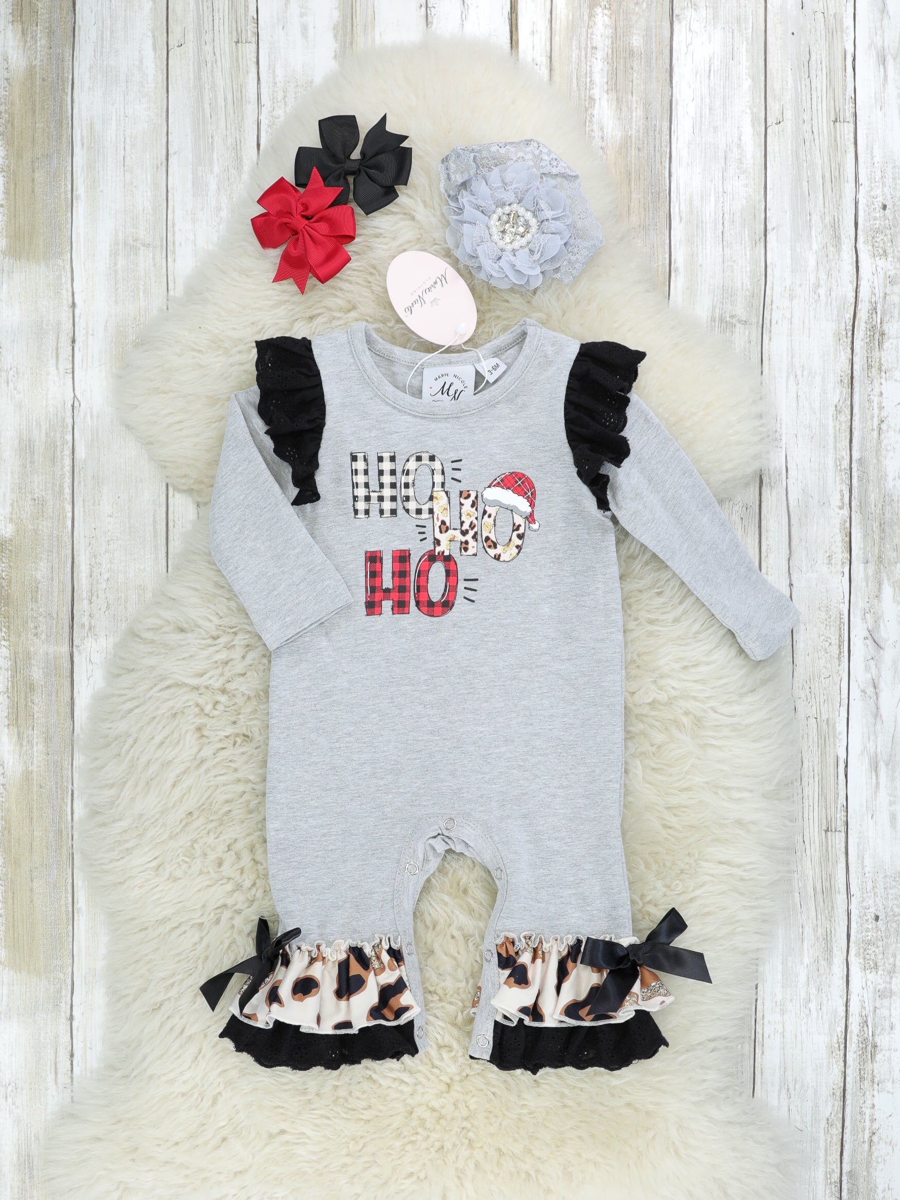 A gorgeous sister set for your leopard lovers! This grey romper features flutter trim, ruffle details, & bow details at the ankles.