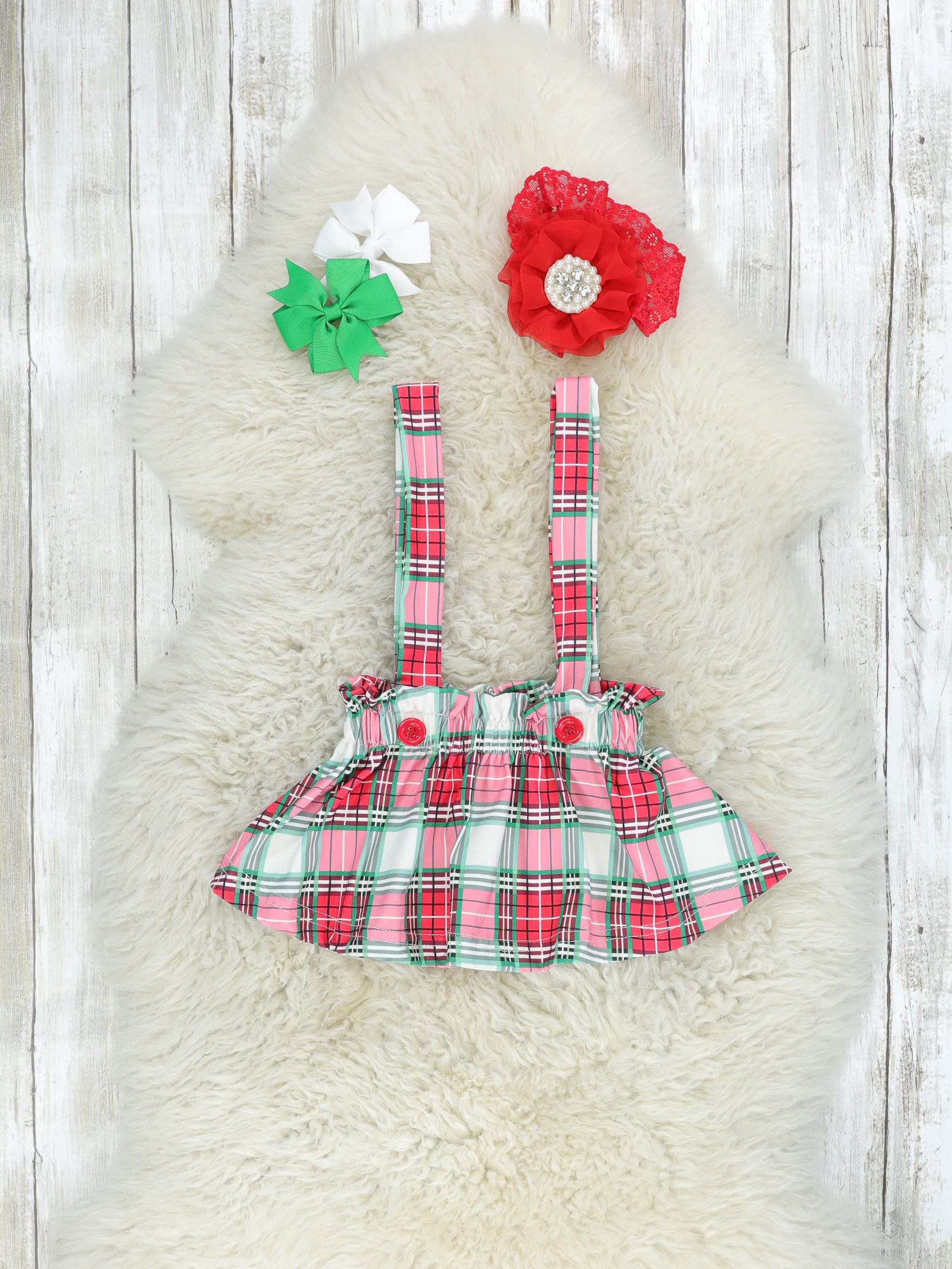 Give your girls a holly jolly Christmas with this adorable sister set! This outfit features a cream onesie with a "Holly, Jolly" detail & a plaid suspender skirt with adjustable straps.