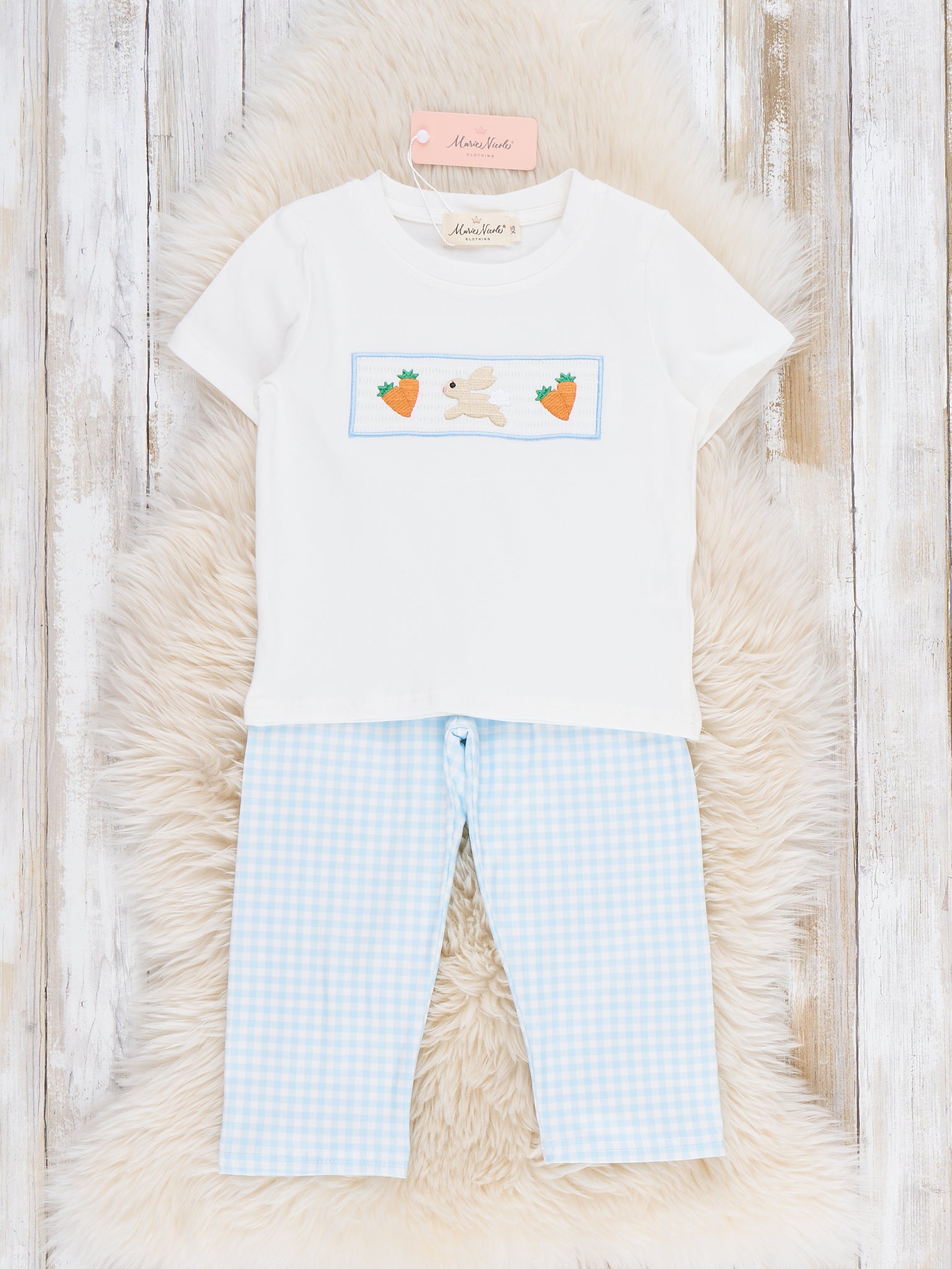 Blessed Bunny Smocked Outfit by Marie Nicole Clothing features a smocked panel with bunny, egg, and cross motifs for Easter sweetness. The cotton shirt provides comfort and playful movement, while the soft pants with an elastic waistband allow easy movement for playtime. Perfect for springtime celebrations, this piece is both classic and festive for special days.