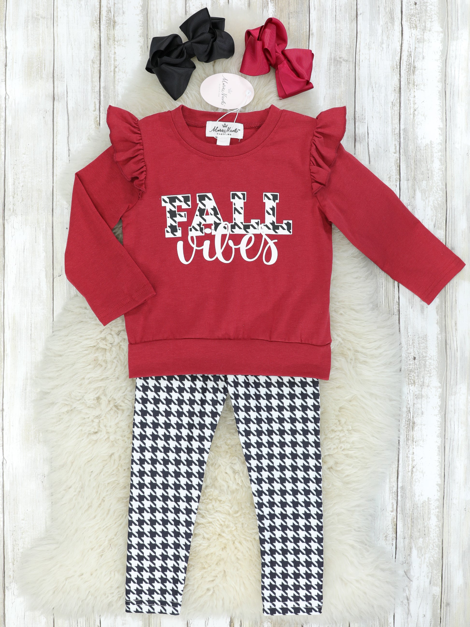 The most adorable sister set for your bold girls! This outfit features a maroon "Fall Vibes" shirt with flutter trim & houndstooth pants.