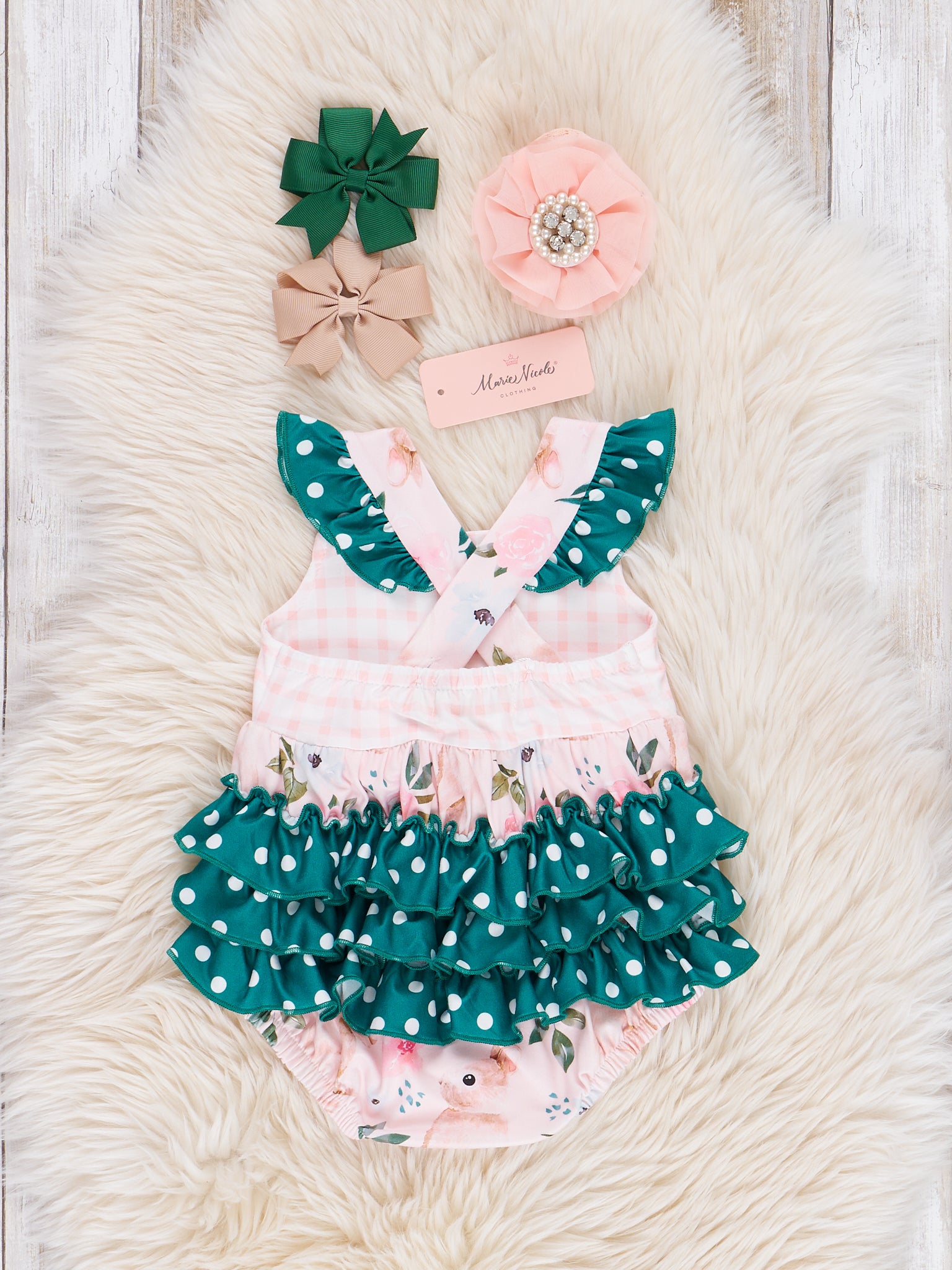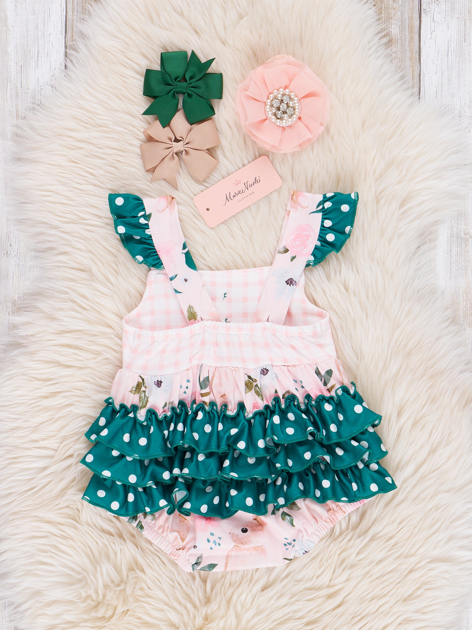 This gorgeous sister set is simply EARresistible! This bubble by Marie Nicole Clothing features a fancy floral bunny print, a ruffle butt, polka dots, & decorative buttons.